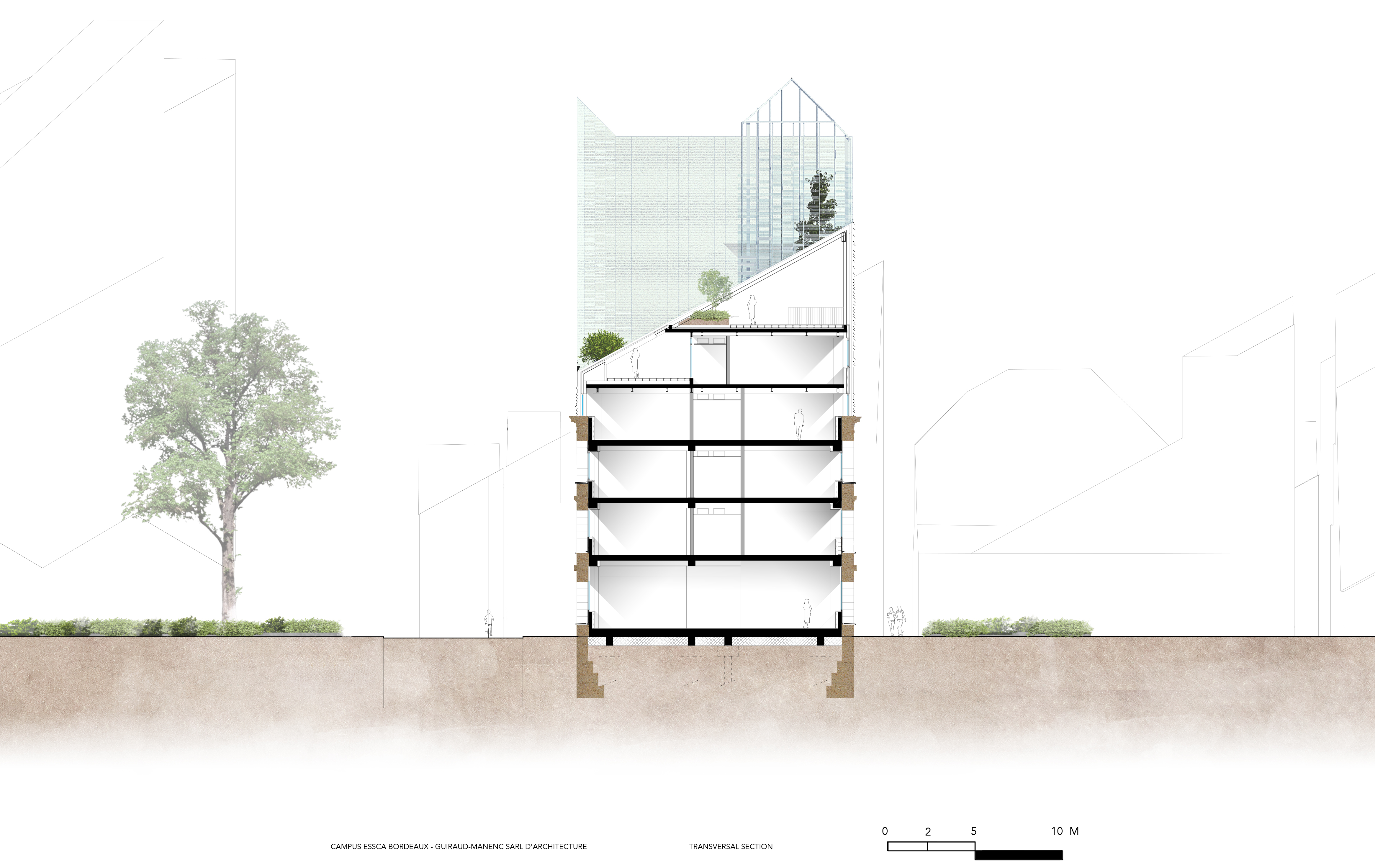 대지는 옛 니엘 병영(Niel Barracks)의 담장 안에 위치하며, 별도의 용적률이 없는 부지였다. 이에 따라 건축은 기존 19세기 병영 건물의 내부와 상부에 증축하는 방식으로 진행되었다. 외부 표면이 없는 건축, 즉 내생적 건축을 구현함으로써 건물 내부에서 사용자에게 옥외 공간을 제공하는 구조가 되었다. 5층에는 보르도 전경을 한눈에 조망할 수 있는 테라스가 마련되어 있으며, 이는 건물 내 사교와 휴식을 위한 옥외 공간의 역할을 한다.