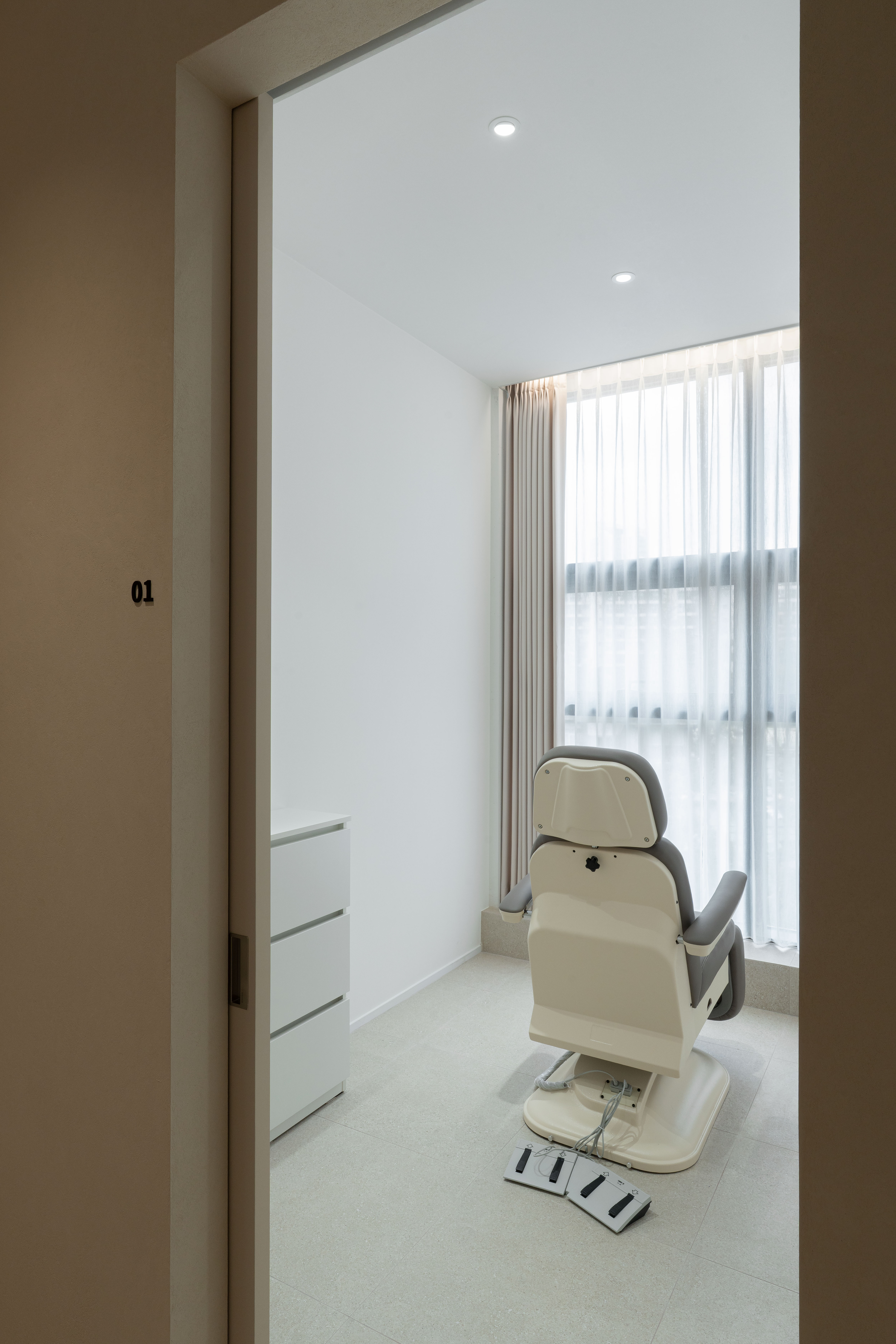 시술실과 관리실은 낮은 천장고와 간접조명을 통해 차분하고 아늑한 분위기를 조성했다. 햇빛이 직접 닿지 않는 배치로 안정적인 환경을 확보했으며, 효율적인 동선을 고려한 슬라이딩 도어와 준비실 설계로 의료 공간으로서의 기능성을 강화했다.