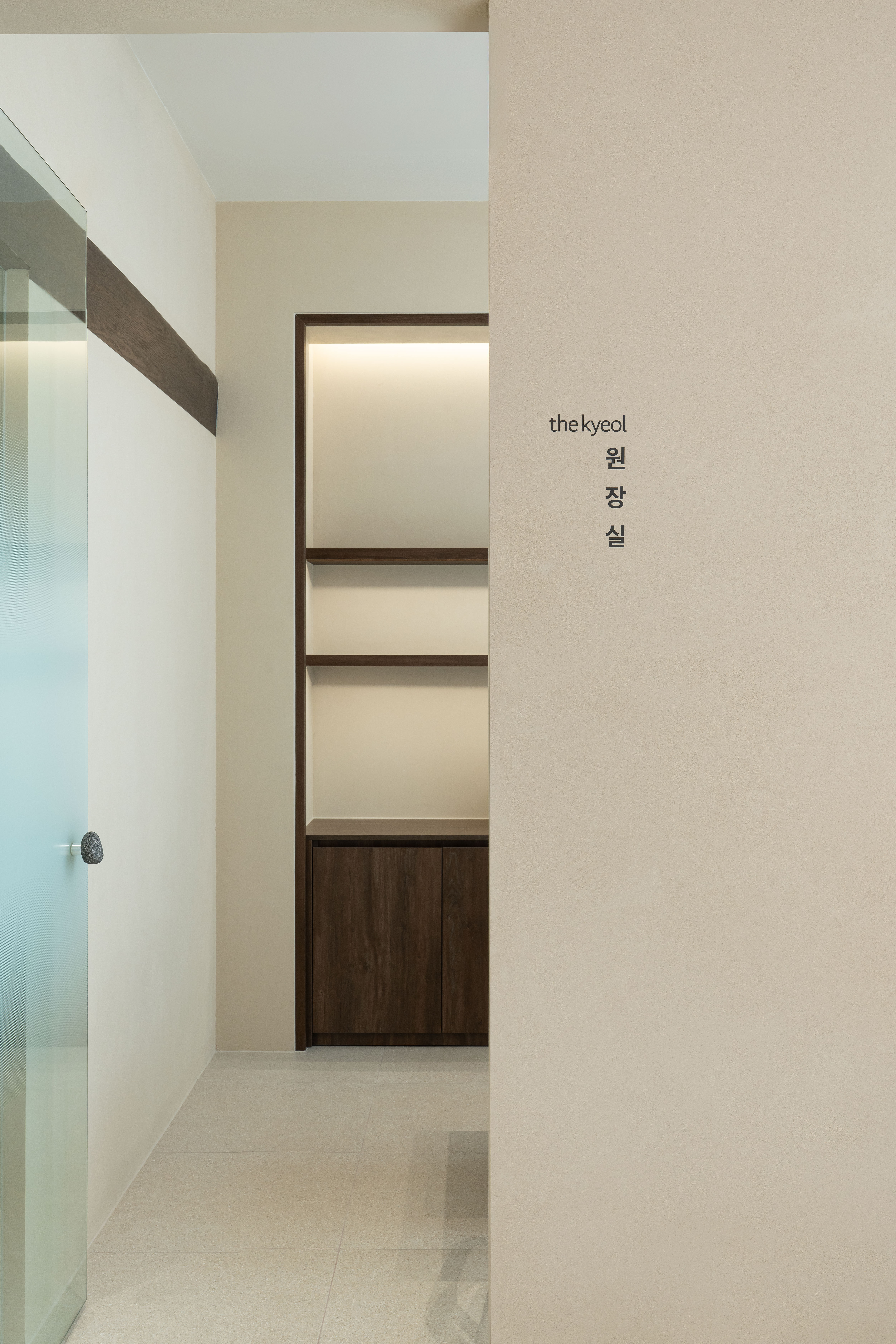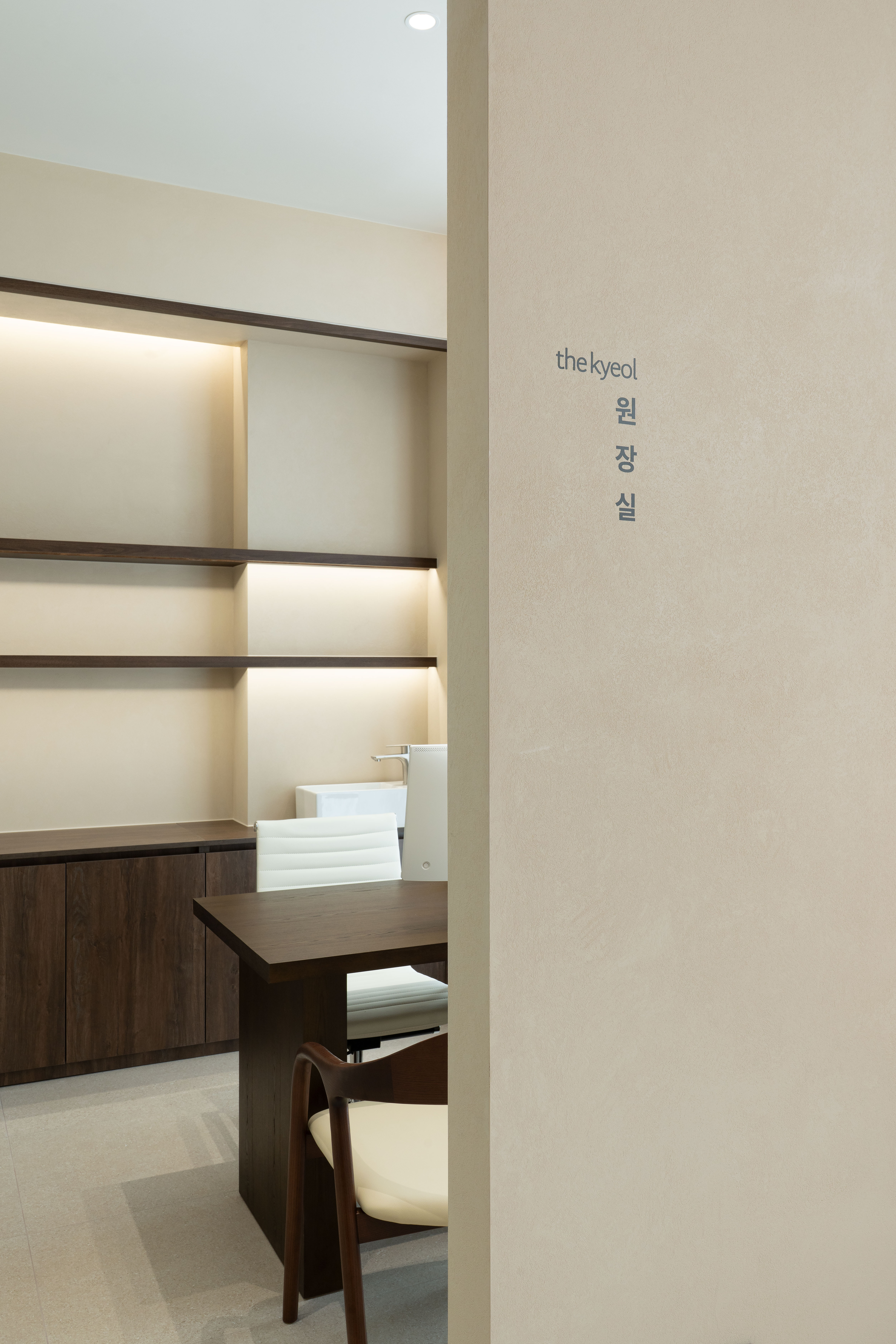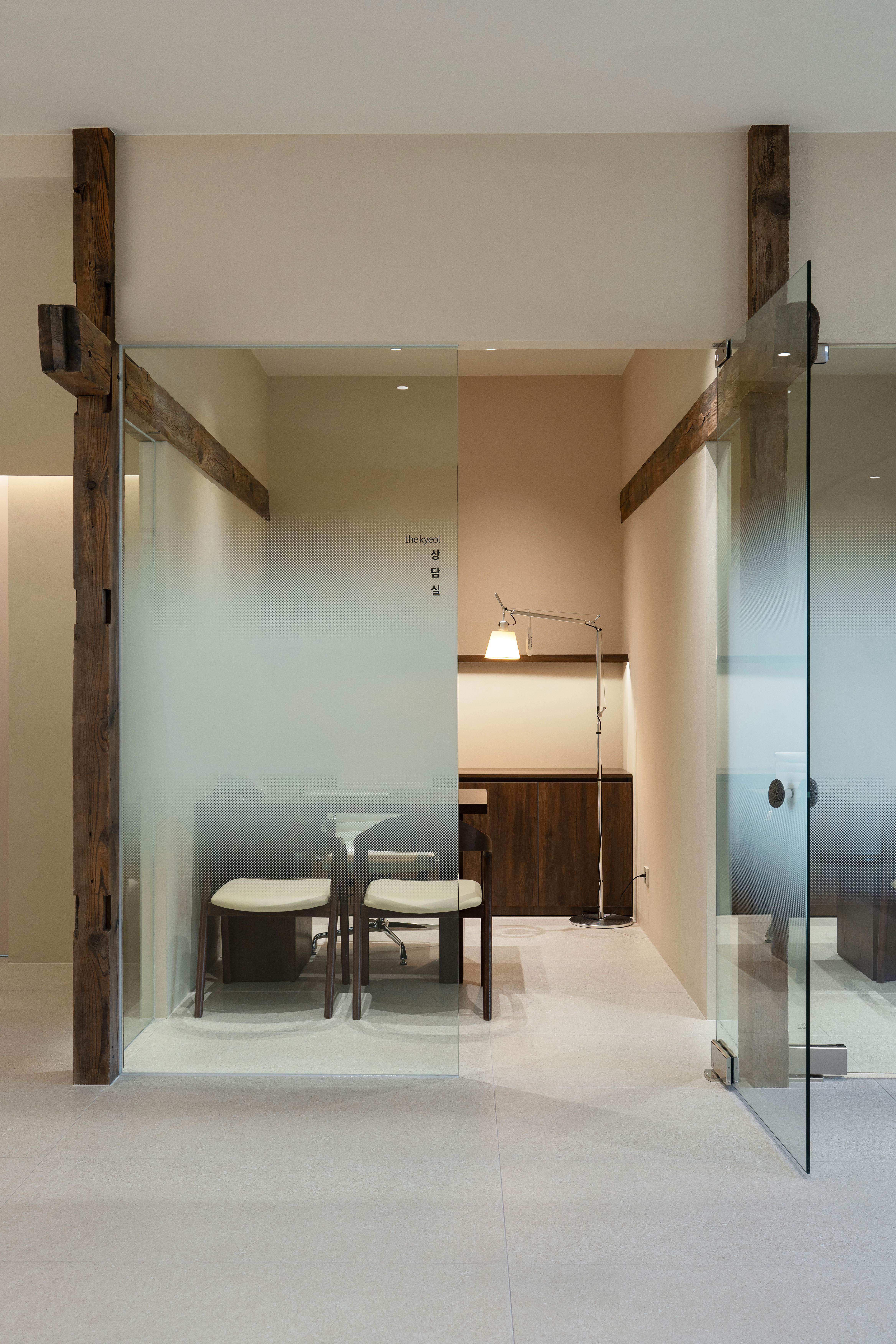 상담실과 원장실은 고재 기둥을 활용해 전통 건축의 구조미를 현대적으로 재해석했다. 단정한 선과 옅은 색감의 벽면이 고요한 여백의 미를 형성하고, 동양화의 안개를 연상시키는 유리 도어와 맞춤 제작 가구로 실용성과 조형미를 동시에 완성했다.