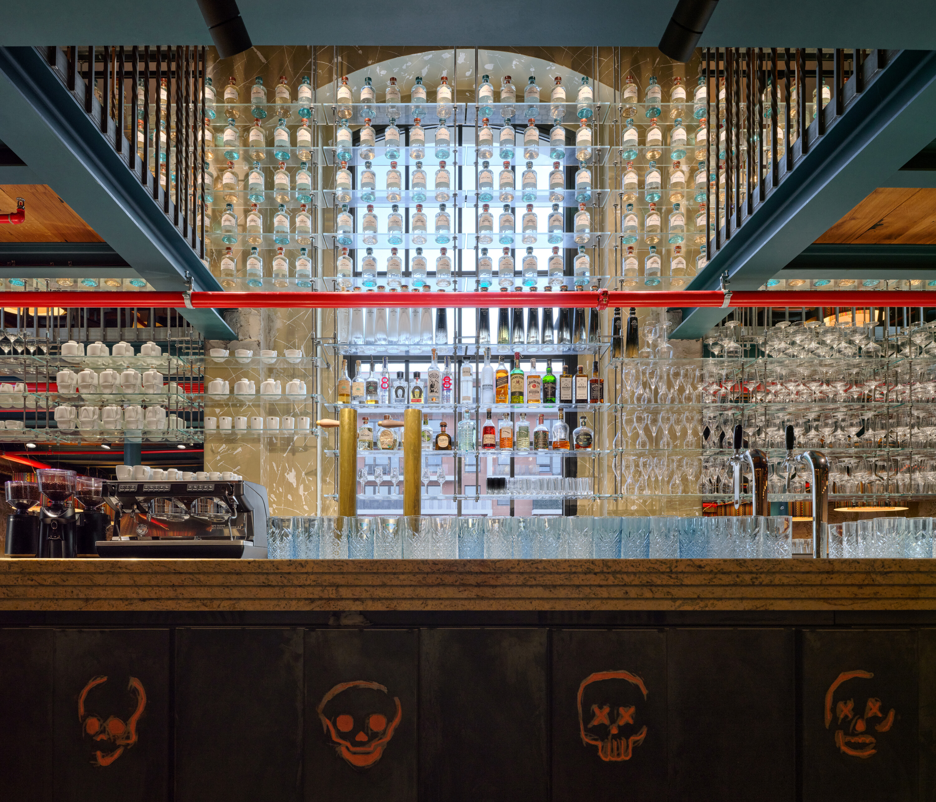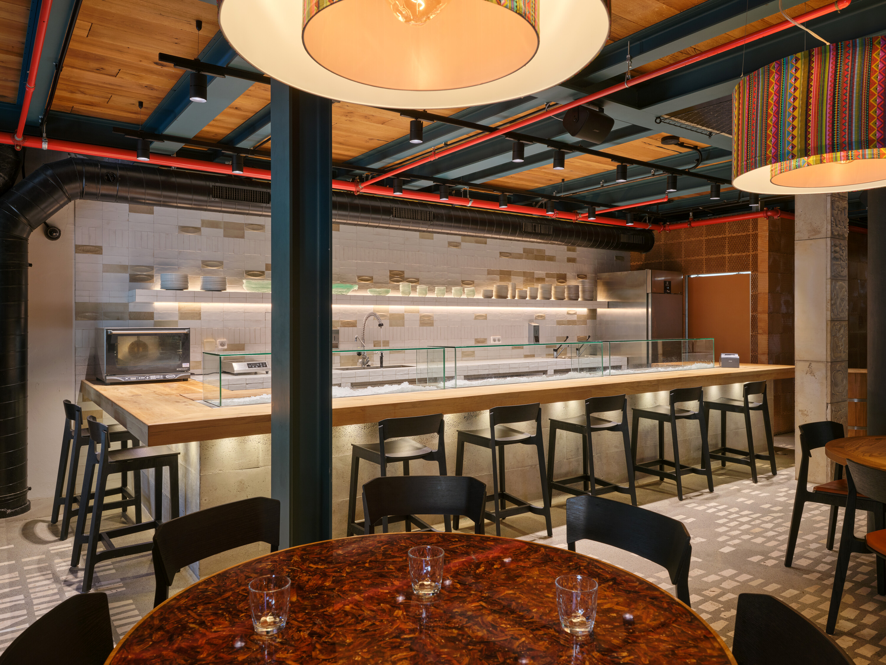이 레스토랑의 가장 독창적인 점은 그 공간 개념에 있다. 과거 홀레쇼비체 양조장의 높은 층고 공간 안에 중앙 중정을 중심으로 한 2층 갤러리 구조를 새롭게 구축한 것만으로도 특별하다. 여기에 금빛 조명 아래 반짝이는 다중 팔형 계단이 더해지며, 마야 시대의 역사적 상징들이 암시적으로 녹아 있다. 이 모든 요소는 방문객에게 건축적으로 이례적인 체험을 제공한다. 레스토랑의 또 다른 특징은 주방과 객석의 완전한 통합이다. 손님들은 눈앞에서 토르티야가 구워지고, 타코가 만들어지며, 화덕에서 요리가 조리되는 과정을 직접 볼 수 있다. 세비체는 어항 섹션에서 바로 조리되며, 재료들이 손에 닿을 듯 가까운 거리에서 준비된다. 상층의 대형 칵테일 바 역시 독창적인 디자인과 재료 구성을 갖추었으며, 음료 진열장은 바를 넘어 갤러리까지 연장되어 공간적 리듬감을 형성한다.