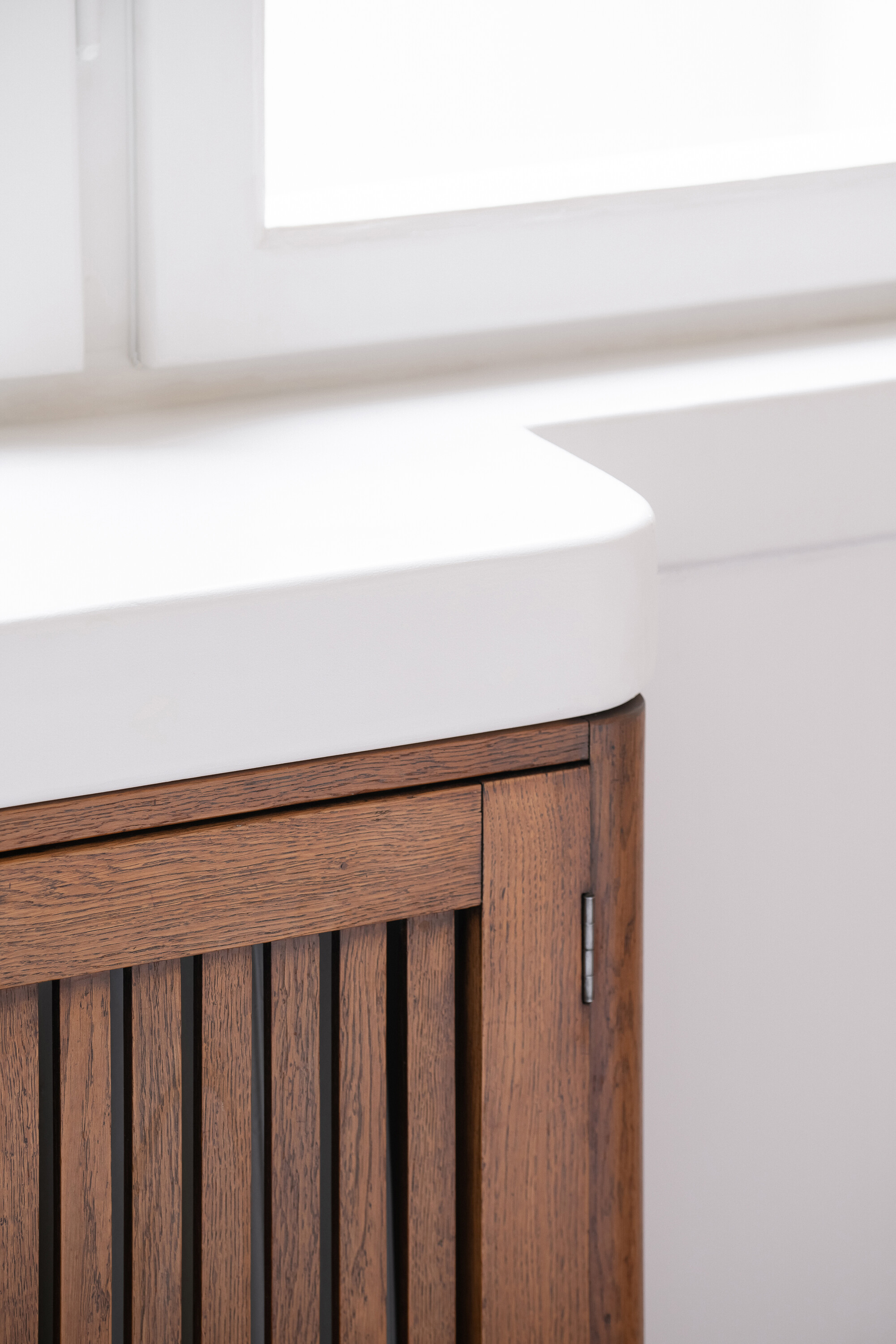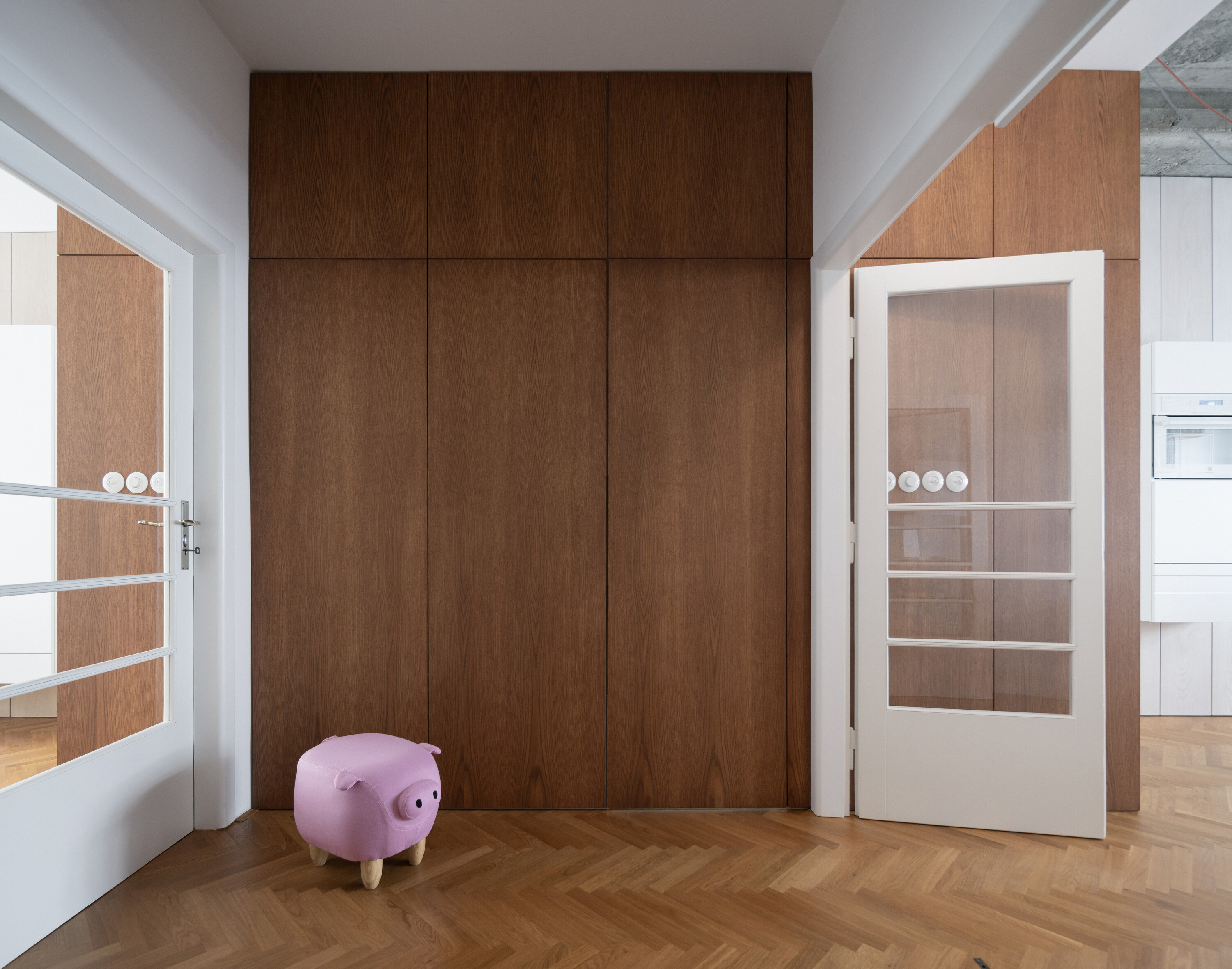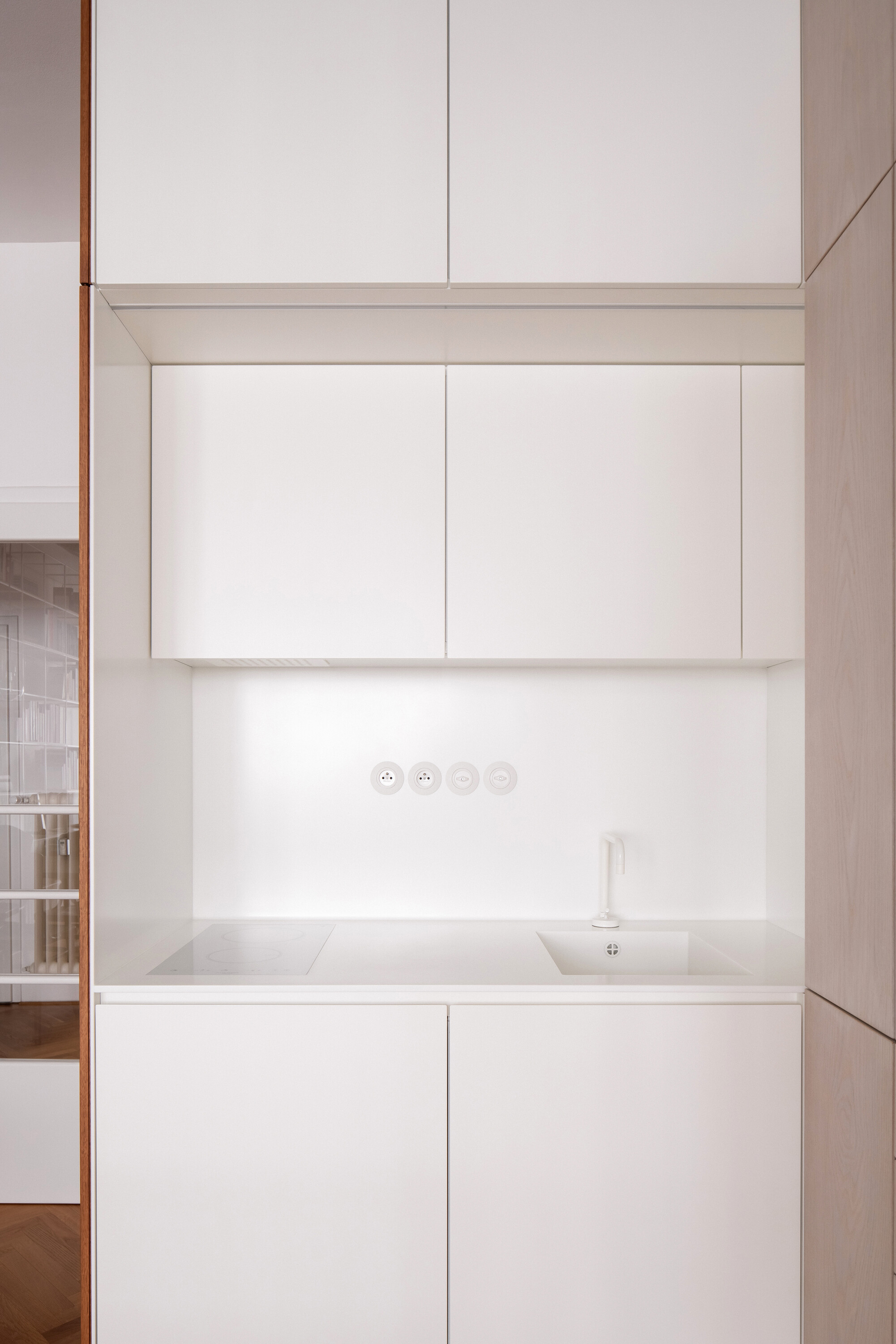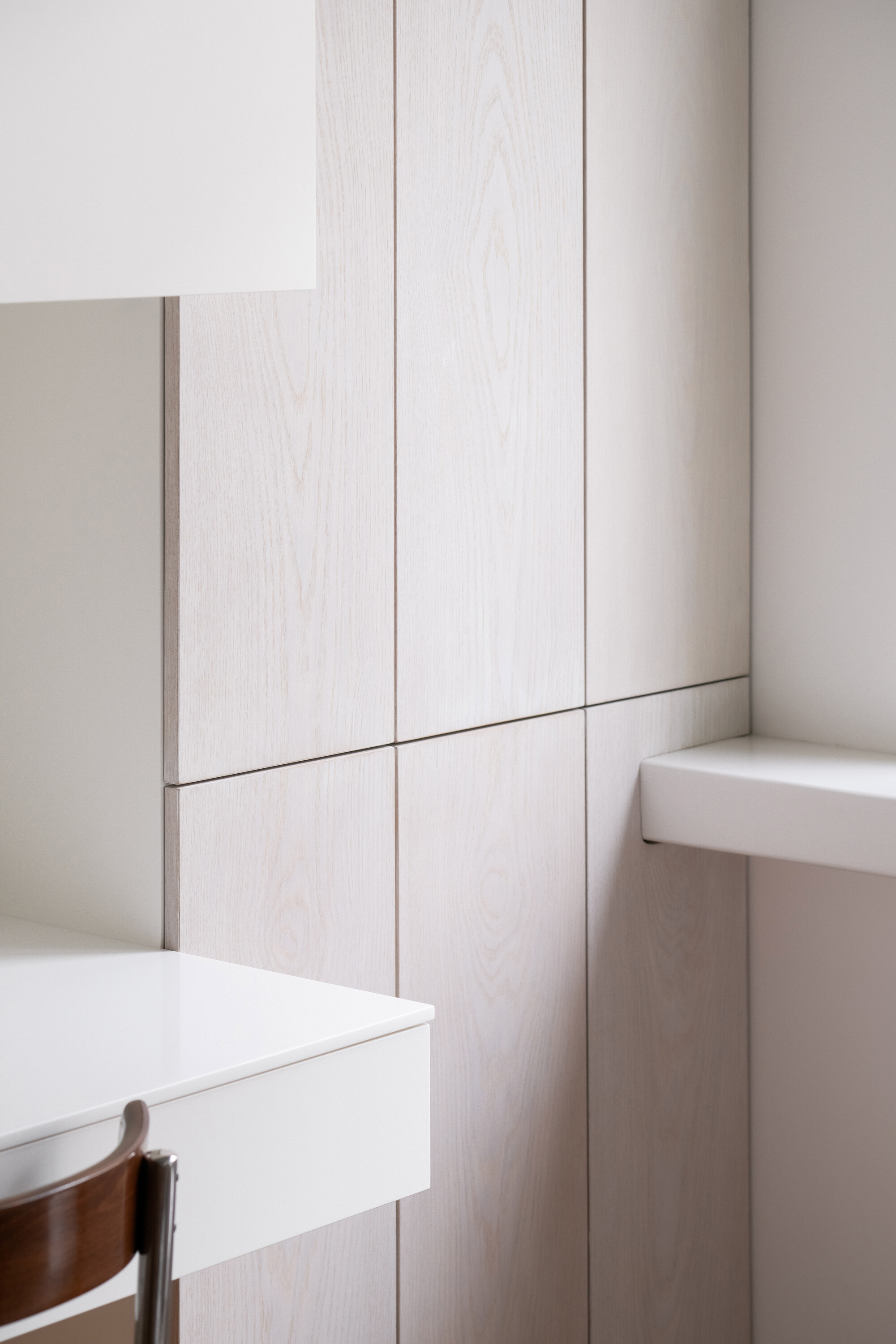 공간은 기술적 설비를 포함해 전면적인 리모델링을 거쳤다. 거실의 철근콘크리트 천장은 마감재를 제거해 노출시켰고, 원래의 창문과 문, 손잡이는 모두 보수해 다시 살렸다. 오크 마루는 원본과 동일한 패턴으로 새로 시공했다. 기존 팬트리와 욕실을 철거하고, 수납장·욕실·주방 일부를 통합한 새로운 목재 박스형 구조물을 삽입했다. 스테인 오크 베니어와 화이트 래커를 사용해 1930년대 근대주의 감성과 현대적 미니멀리즘이 조화를 이루도록 했다.