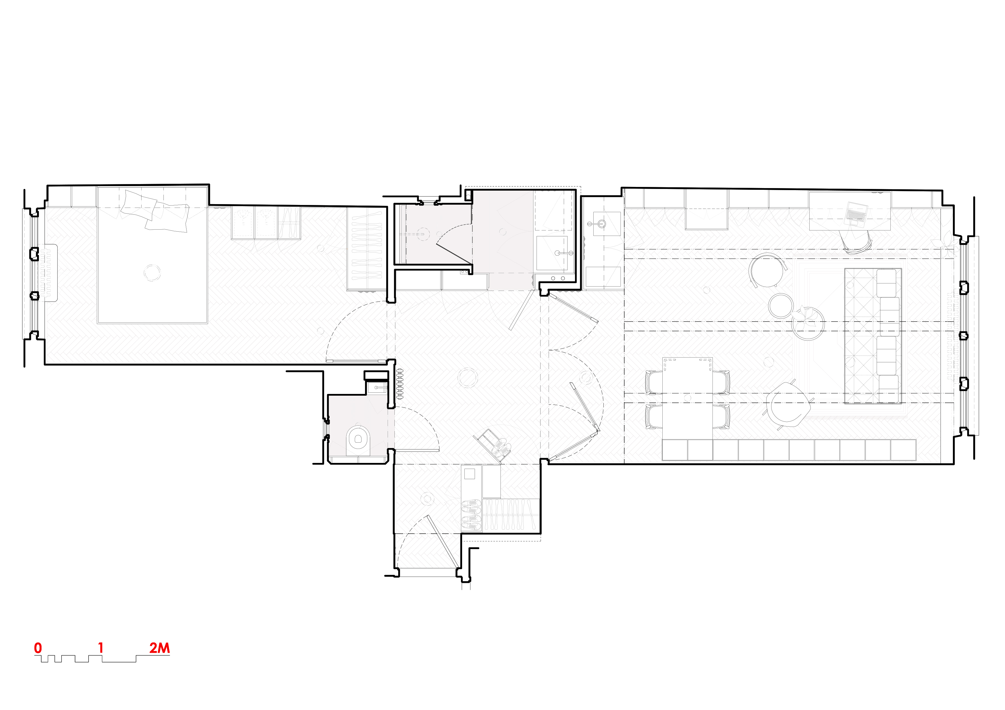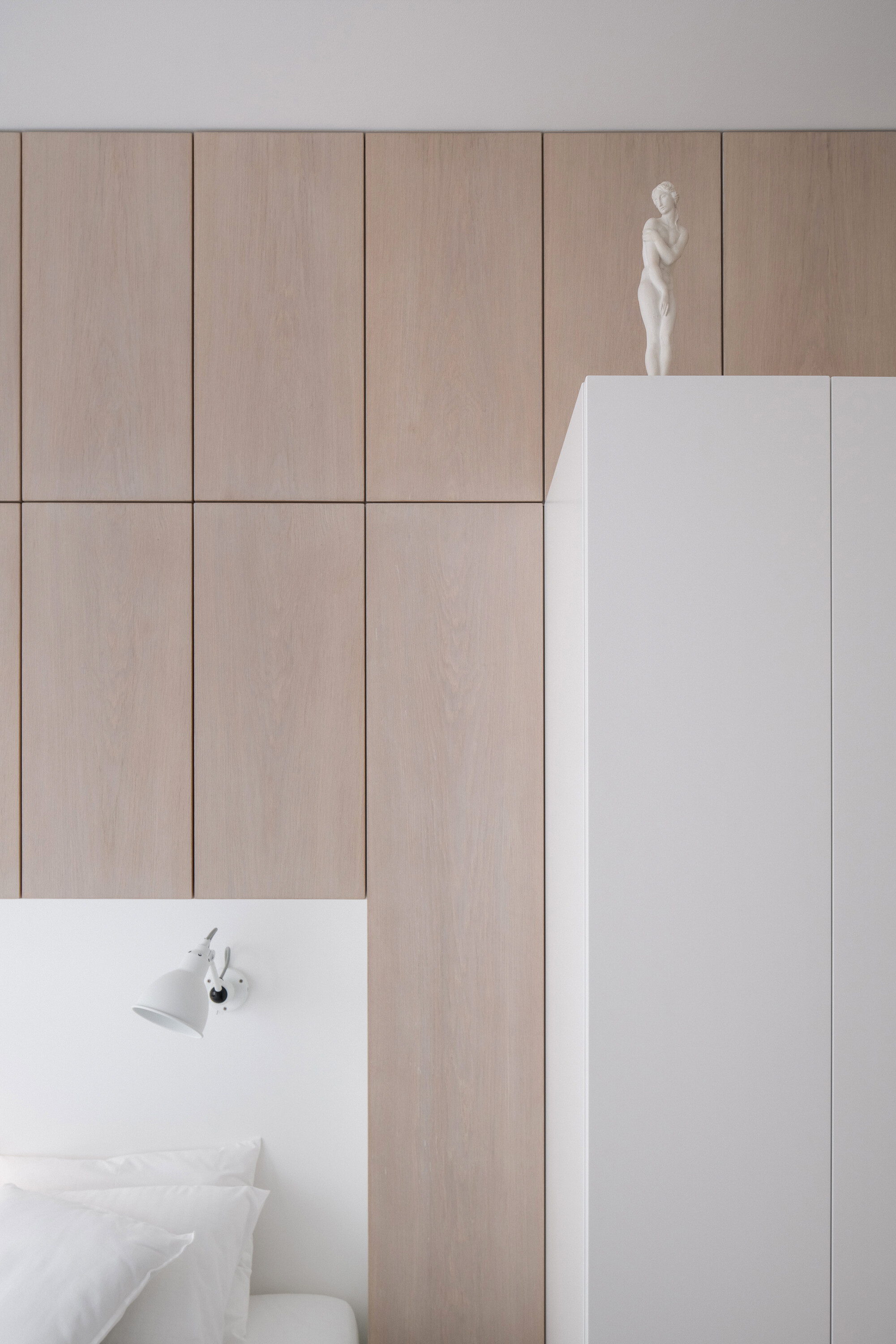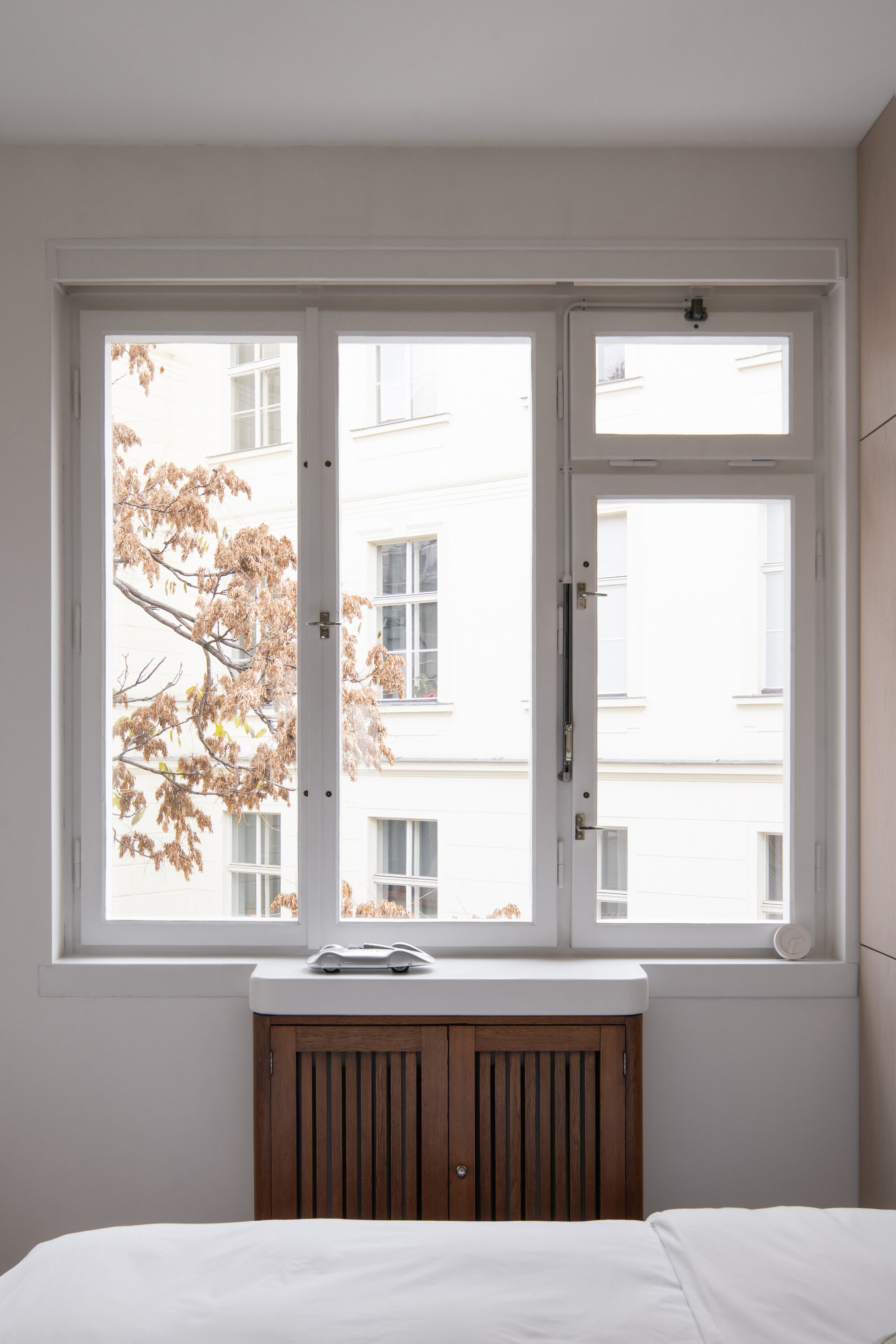 공간은 기술적 설비를 포함해 전면적인 리모델링을 거쳤다. 거실의 철근콘크리트 천장은 마감재를 제거해 노출시켰고, 원래의 창문과 문, 손잡이는 모두 보수해 다시 살렸다. 오크 마루는 원본과 동일한 패턴으로 새로 시공했다. 기존 팬트리와 욕실을 철거하고, 수납장·욕실·주방 일부를 통합한 새로운 목재 박스형 구조물을 삽입했다. 스테인 오크 베니어와 화이트 래커를 사용해 1930년대 근대주의 감성과 현대적 미니멀리즘이 조화를 이루도록 했다.