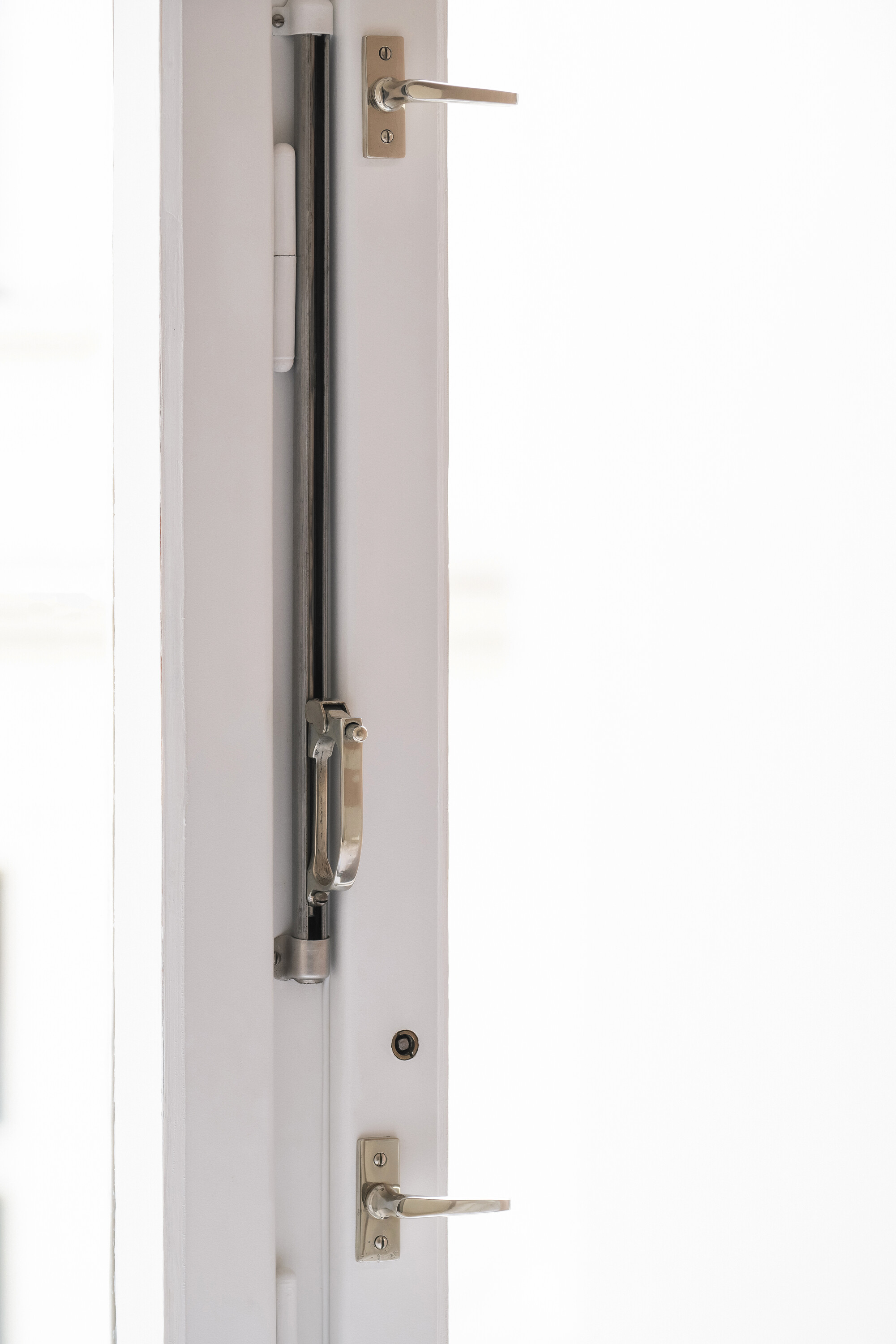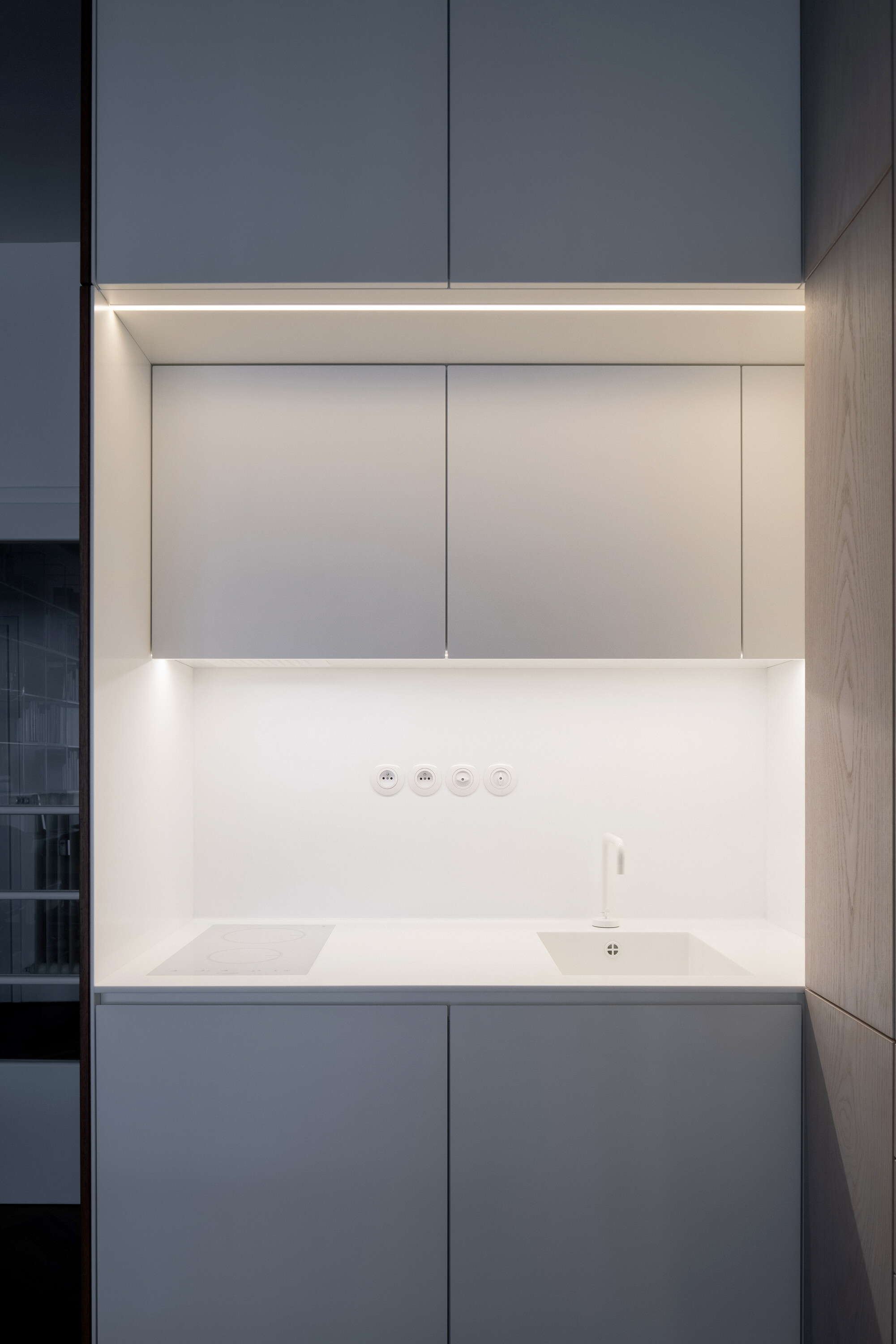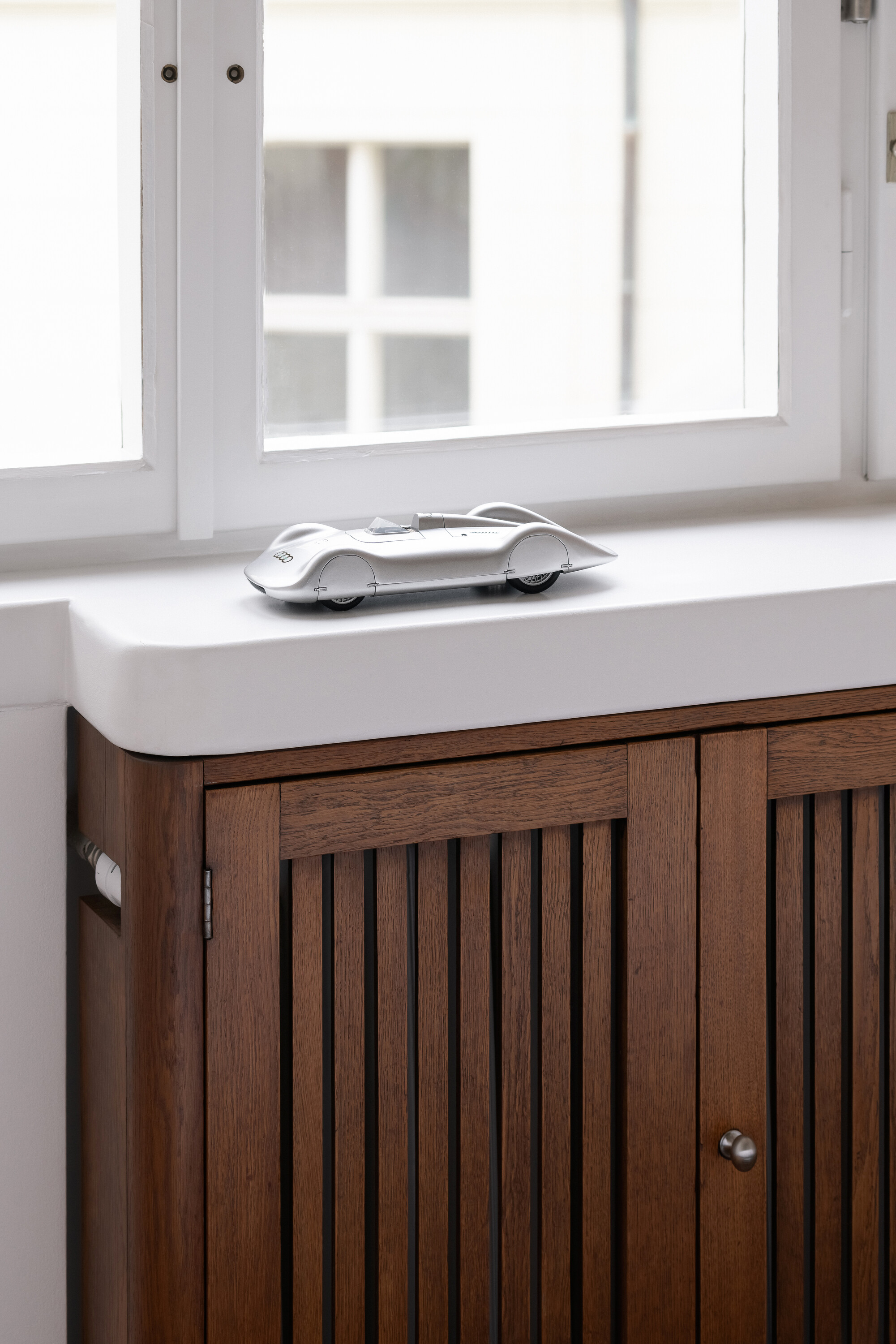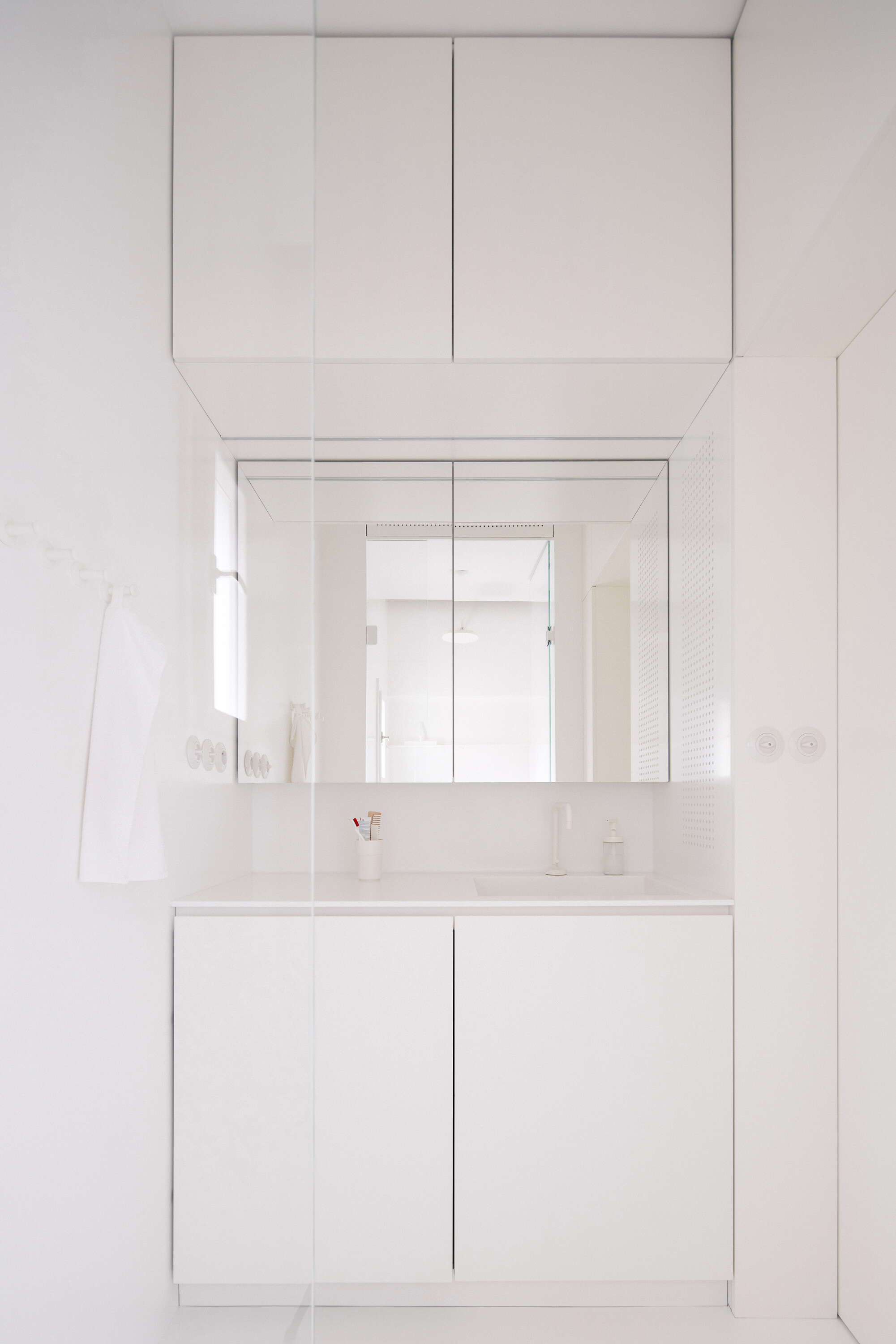 공간은 기술적 설비를 포함해 전면적인 리모델링을 거쳤다. 거실의 철근콘크리트 천장은 마감재를 제거해 노출시켰고, 원래의 창문과 문, 손잡이는 모두 보수해 다시 살렸다. 오크 마루는 원본과 동일한 패턴으로 새로 시공했다. 기존 팬트리와 욕실을 철거하고, 수납장·욕실·주방 일부를 통합한 새로운 목재 박스형 구조물을 삽입했다. 스테인 오크 베니어와 화이트 래커를 사용해 1930년대 근대주의 감성과 현대적 미니멀리즘이 조화를 이루도록 했다.