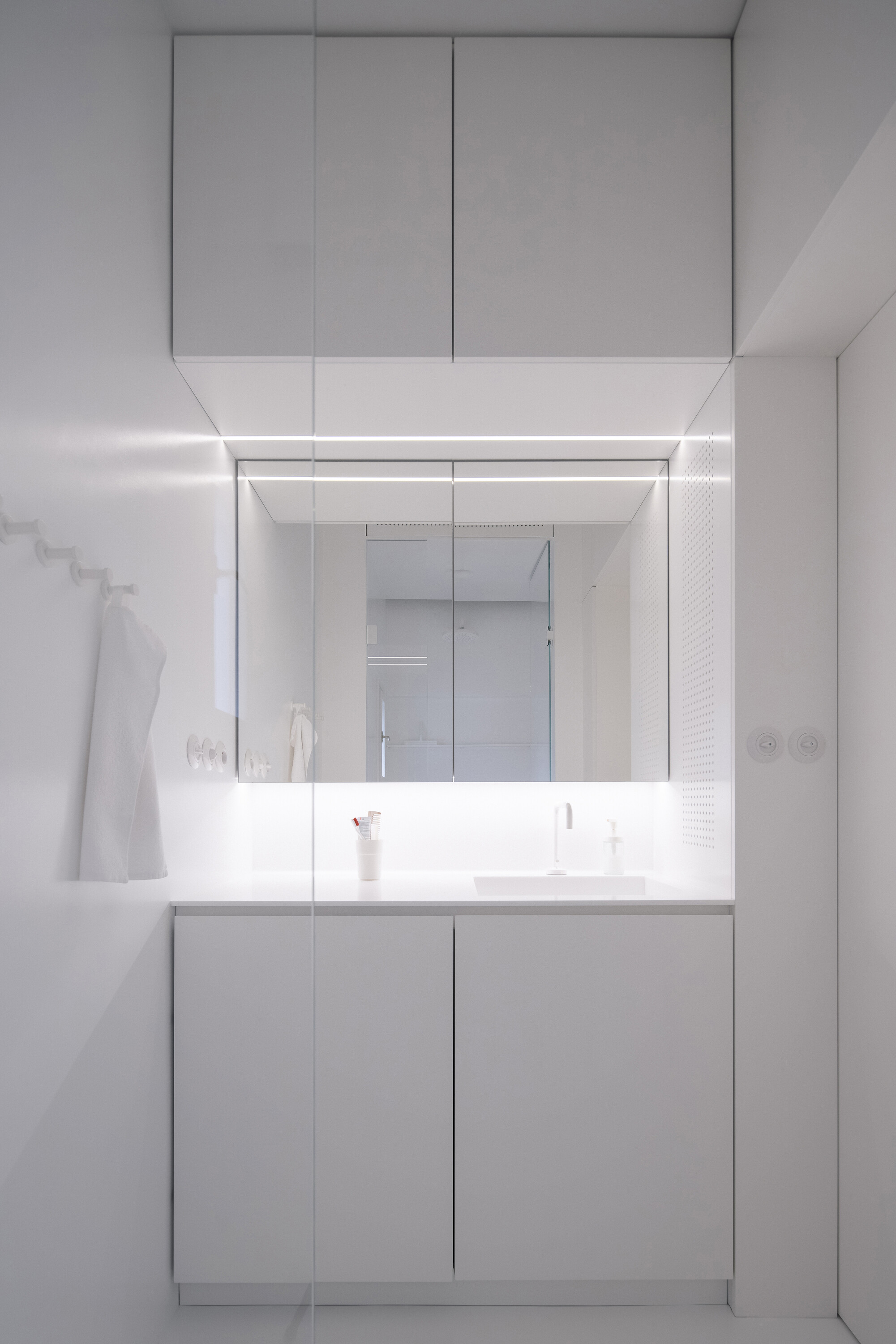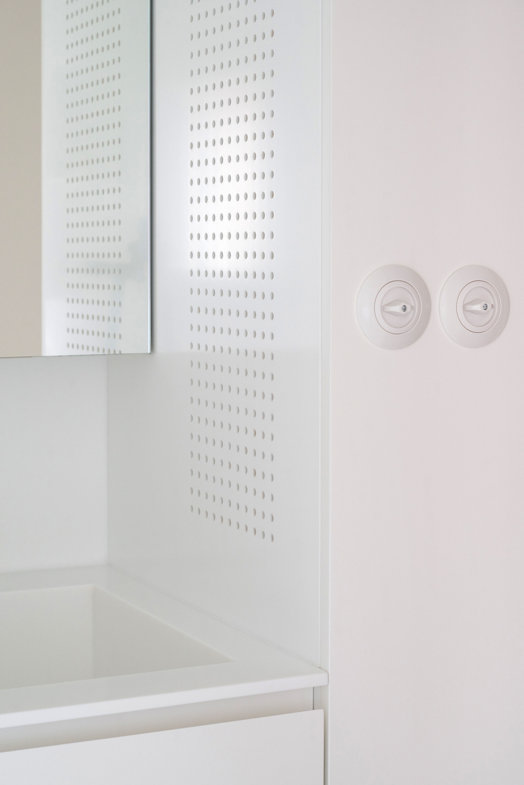 공간은 기술적 설비를 포함해 전면적인 리모델링을 거쳤다. 거실의 철근콘크리트 천장은 마감재를 제거해 노출시켰고, 원래의 창문과 문, 손잡이는 모두 보수해 다시 살렸다. 오크 마루는 원본과 동일한 패턴으로 새로 시공했다. 기존 팬트리와 욕실을 철거하고, 수납장·욕실·주방 일부를 통합한 새로운 목재 박스형 구조물을 삽입했다. 스테인 오크 베니어와 화이트 래커를 사용해 1930년대 근대주의 감성과 현대적 미니멀리즘이 조화를 이루도록 했다.