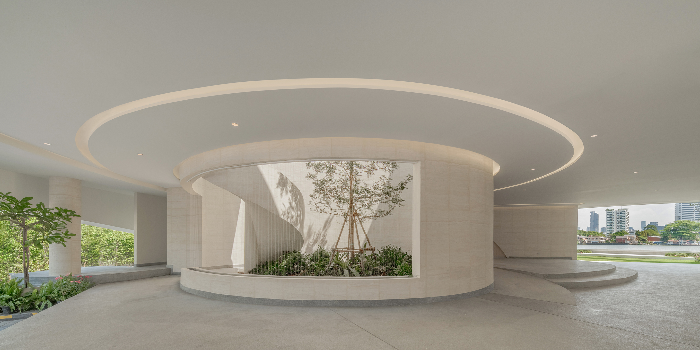 메인 입구를 지나면 자연광이 가득한 타원형 중정이 방문객을 맞이한다. 하늘로 열린 큰 보이드가 지상층부터 천장까지 빛을 끌어들이며, 따뜻하고 평온한 분위기를 형성한다. 중앙에는 우아한 곡선의 나선형 계단이 자리해 시선의 중심이자 상층으로의 동선을 자연스럽게 유도한다. 이 중정을 따라 올라가면 약 80석 규모의 레스토랑과 약혼식을 위한 공간이 이어지며, 차오프라야 강을 180도로 조망할 수 있다. 레스토랑은 파노라마 뷰를 유지한 채 이벤트 공간으로도 전환 가능하다.