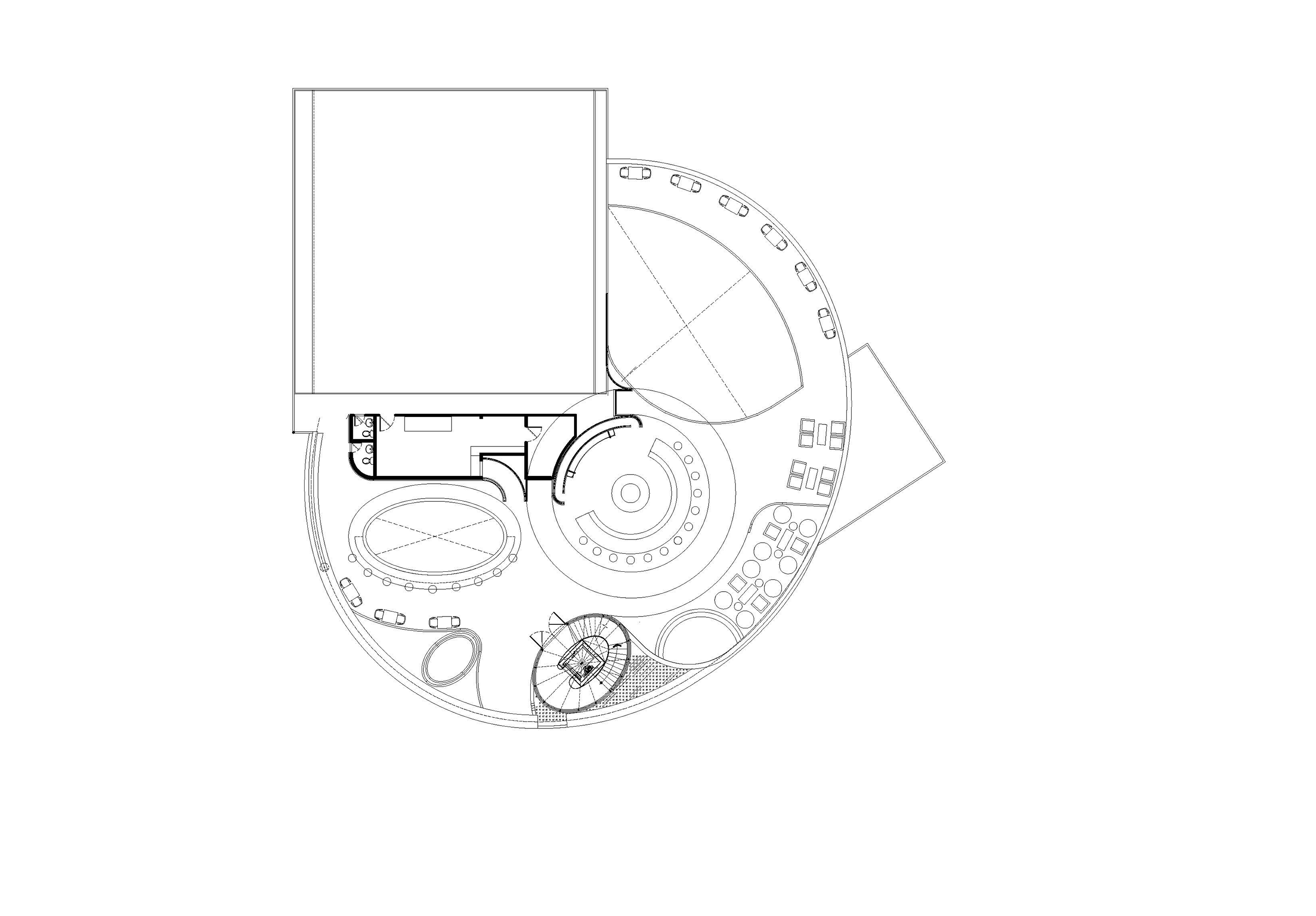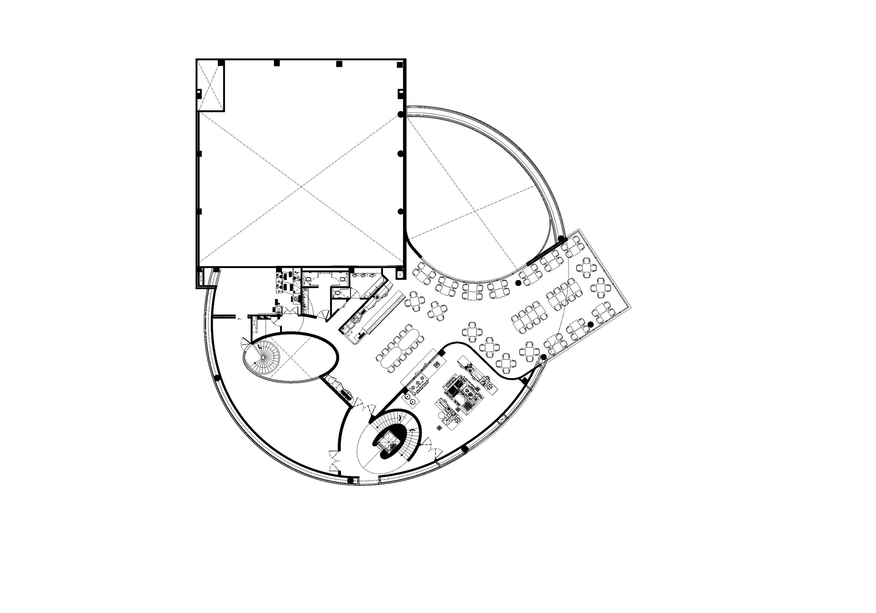 메인 입구를 지나면 자연광이 가득한 타원형 중정이 방문객을 맞이한다. 하늘로 열린 큰 보이드가 지상층부터 천장까지 빛을 끌어들이며, 따뜻하고 평온한 분위기를 형성한다. 중앙에는 우아한 곡선의 나선형 계단이 자리해 시선의 중심이자 상층으로의 동선을 자연스럽게 유도한다. 이 중정을 따라 올라가면 약 80석 규모의 레스토랑과 약혼식을 위한 공간이 이어지며, 차오프라야 강을 180도로 조망할 수 있다. 레스토랑은 파노라마 뷰를 유지한 채 이벤트 공간으로도 전환 가능하다.