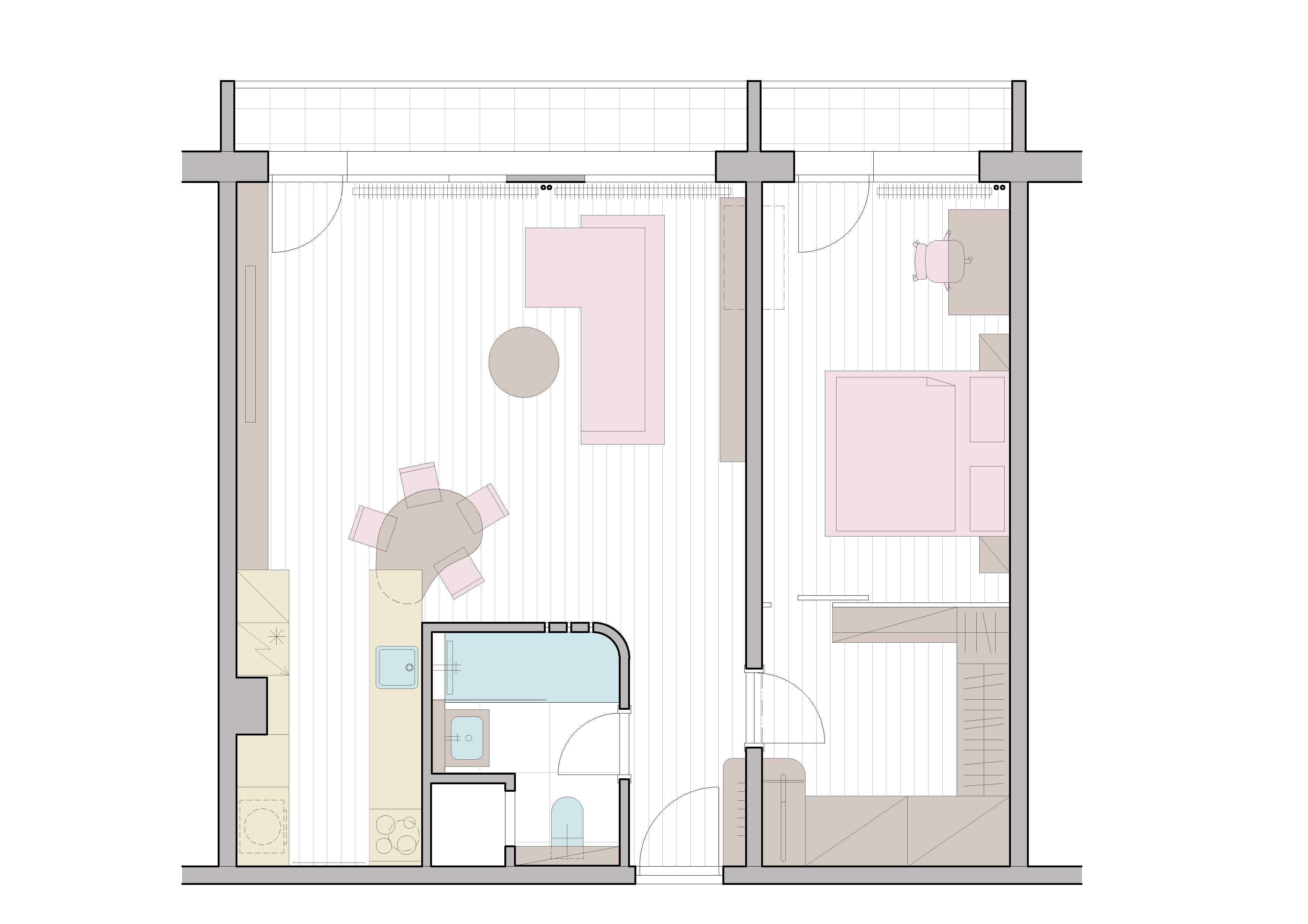 목표는 에너지를 느끼면서도 차분한 공간을 만드는 것이었다. 우리는 판넬 건축의 콘크리트를 감추지 않고 그대로 드러내는 방식을 택했다. 오래된 페인트와 미장을 걷어내자, 거친 질감의 노출 콘크리트가 드러났고, 이는 세련되게 다듬어져 공간의 중심 재료가 되었다. 바닥의 목재 플랭크는 마치 배의 갑판처럼 일상의 무대가 되었으며, 주방과 서재, 조명에 사용된 다양한 블루 톤은 서로 다른 깊이와 농도로 이어지며 바다의 흐름을 연상시킨다. 침실의 점토 플라스터 마감은 해저 혹은 항해의 목적지인 해변을 상징한다.