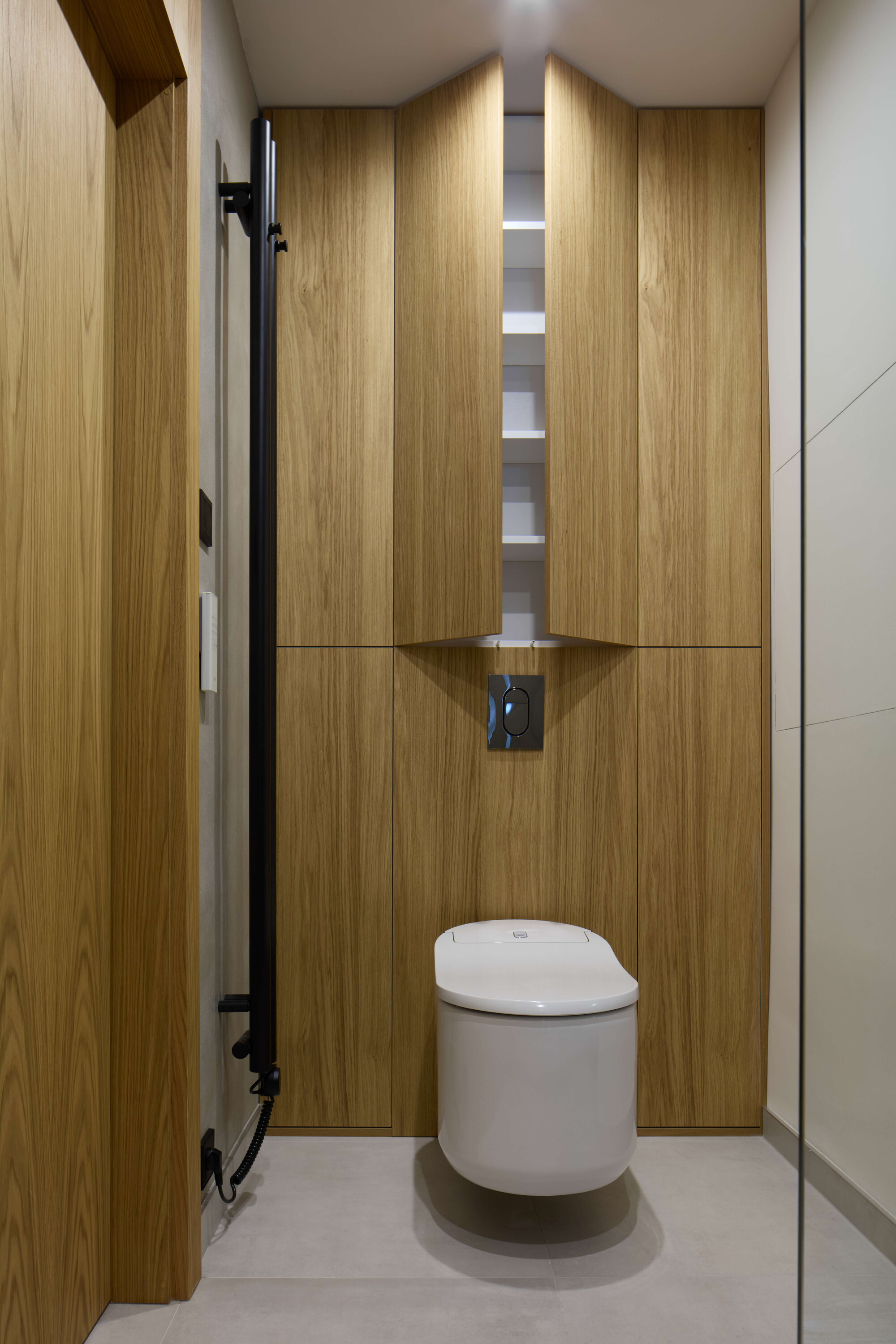 공간 구성은 기존의 3룸 구조를 과감히 변경해 여유로운 2룸형 평면으로 재구성했다. 드레스룸을 별도로 마련했으며, 욕실에는 넓은 샤워존을 두고, 벽걸이 변기 주변으로 수납을 통합했다. 드레스룸에는 자전거 보관 및 충전 니치와 무선청소기 스테이션까지 포함되어 있다.