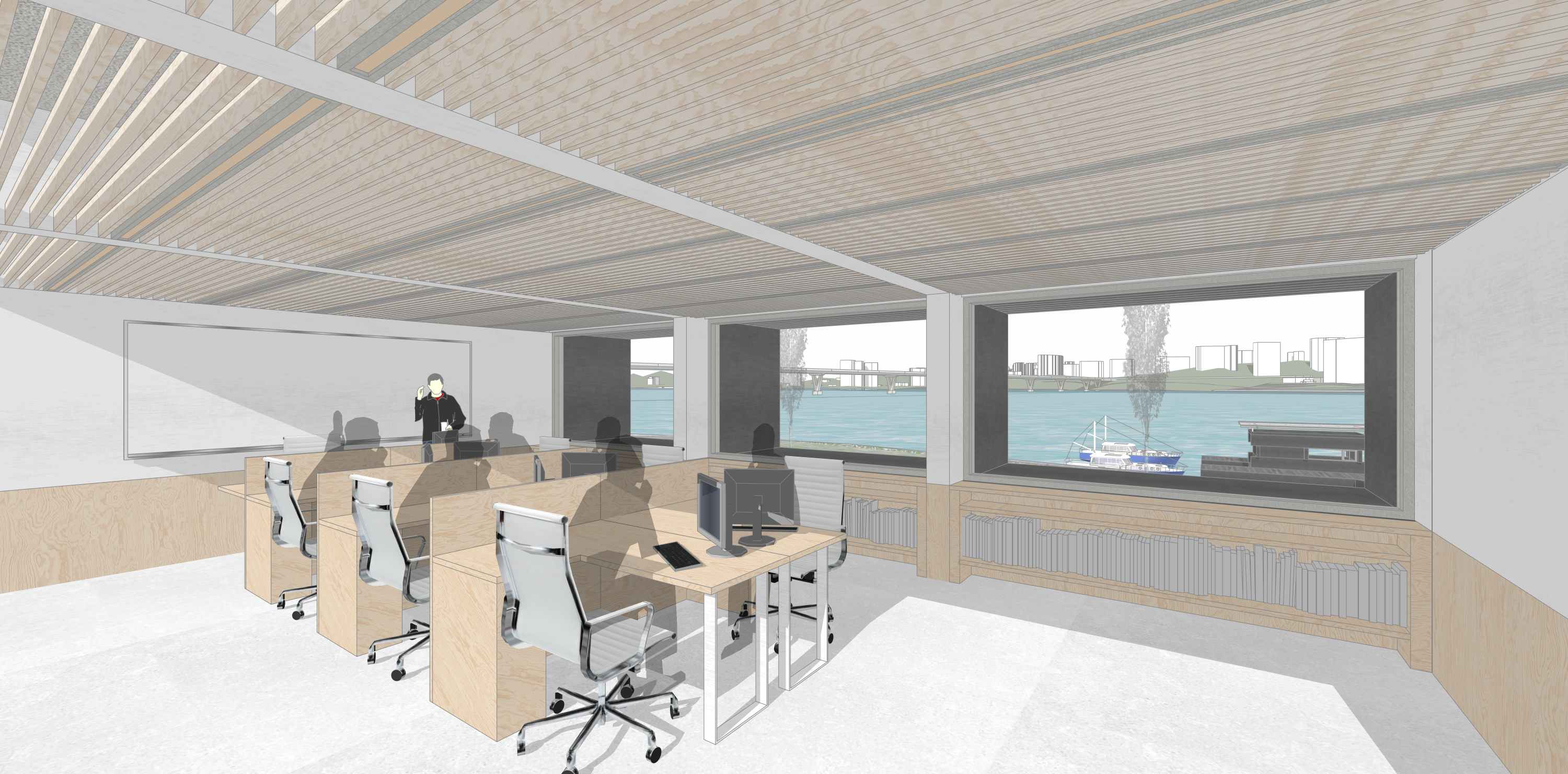 내부 공간은 한강을 향해 끊임없이 열려 있으며, 즉각적인 출동이 가능하도록 기능적으로 배치되었습니다. 수상안전팀 사무실은 강변을 마주하고, 출동 장비들은 효율적으로 관리될 수 있도록 별도의 공간에 마련되었습니다. 2층은1층의 동선을 따라 한강으로 열려 있으며, 투명한 입면을 가진 다목적실은 기능적 유연성을 갖추면서도 한강의 리듬처럼 개방성을 극대화합니다. 이 모든 설비와 공간 배치는 결국, 공학적 논리와 자연의 리듬이 교차하는 지점에서 건축이 단순한 구조물을 넘어 장소의 일부가 되었음을 말해줍니다. 그것은 강과 도시, 시민을 지켜주는 가장 든든한 버팀목이자, 수변공간의 일상에 풍요로운 공공공간으로 함께 작동할 것입니다.