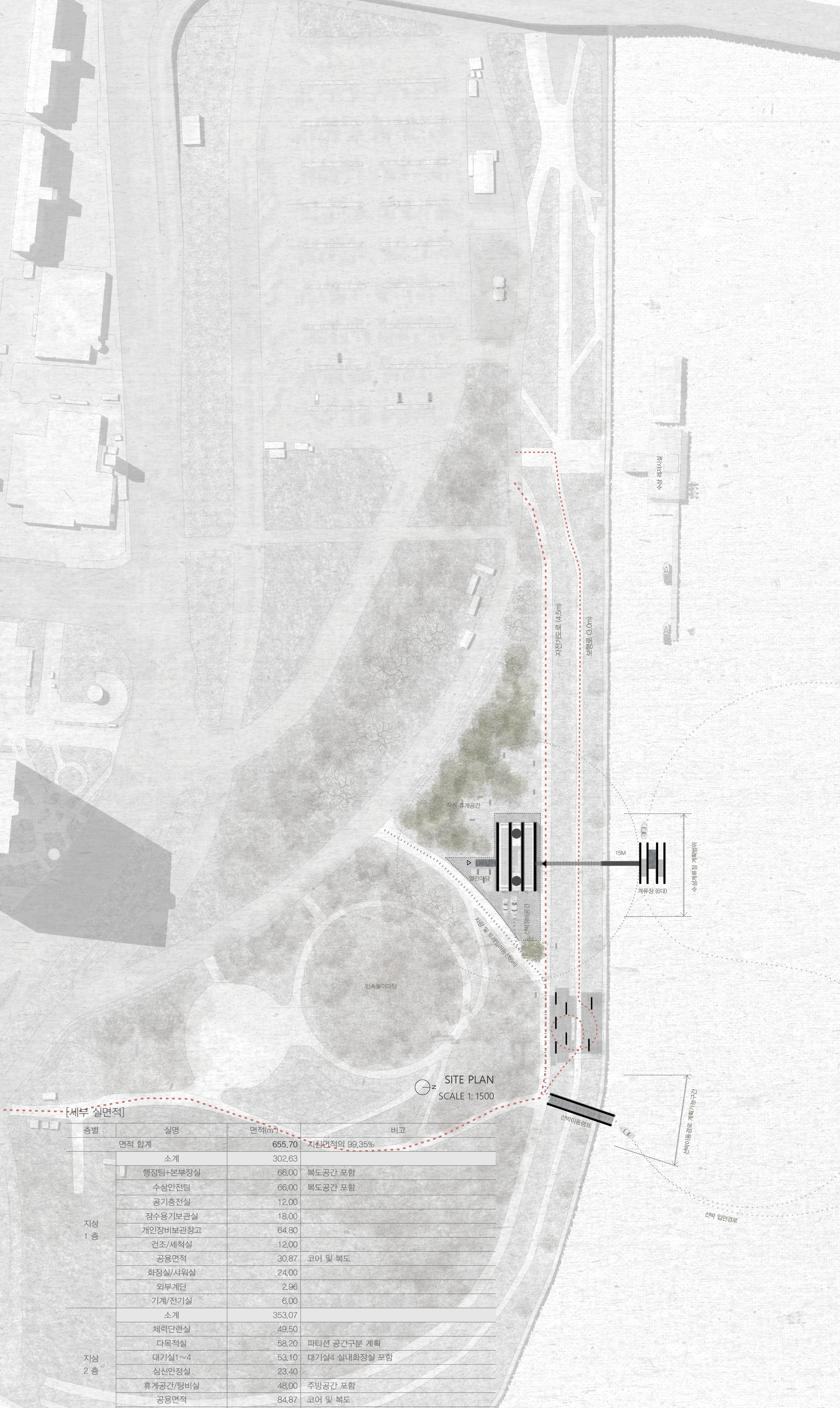 이 건축물의 핵심은 격자 구조가 이루는 부유하는 부벽입니다. 일반적인 건물처럼 코어가 구조적 역할을 맡는 것이 아니라, 마치 성냥개비 탑을 쌓듯 만들어진 격자 구조의 시스템과 외벽으로 돌출된 부벽이 건물을 지탱합니다. 유속과 물의 흐름이 미칠 건축물의 뒤틀림 및 크랙등을 보정하도록 함과 동시에 부벽 하부의 공간에서는 휀더를 설치하여 추가적인 부력 및 홍수시 잔해물에 의한 충돌에 대비하도록 하였습니다. 나아가 이 부벽의 단순하고 기하학적인 형태는 거대한 한강의 풍경 속에서 하나의 구조적 장치이자 작은 오브제로 자리 잡습니다. 겹겹이 쌓인 격자는 자연스레 벽이 되어 시민과 경찰의 영역을 구분합니다. 그러나 이 벽은 단절의 장벽이 아닌, 흐름을 열어두는 틈입니다. 가는 띠창을 통해 강변의 풍경이 건물 안으로 스며들고, 격자선은 대지 밖으로 확장되어 시민들을 위한 쉼터와 선박 수리 공간으로 이어집니다. 이로써 건축은 강변의 일상에 녹아들고, 경찰과 시민이 서로 마주 보며 공존하는 관계를 형성합니다. 건물의 실루엣은 강의 흐름에 흐르듯 놓여 그 리듬과 나란히 걸으며 새로운 기억을 쌓아갈 준비를 합니다.