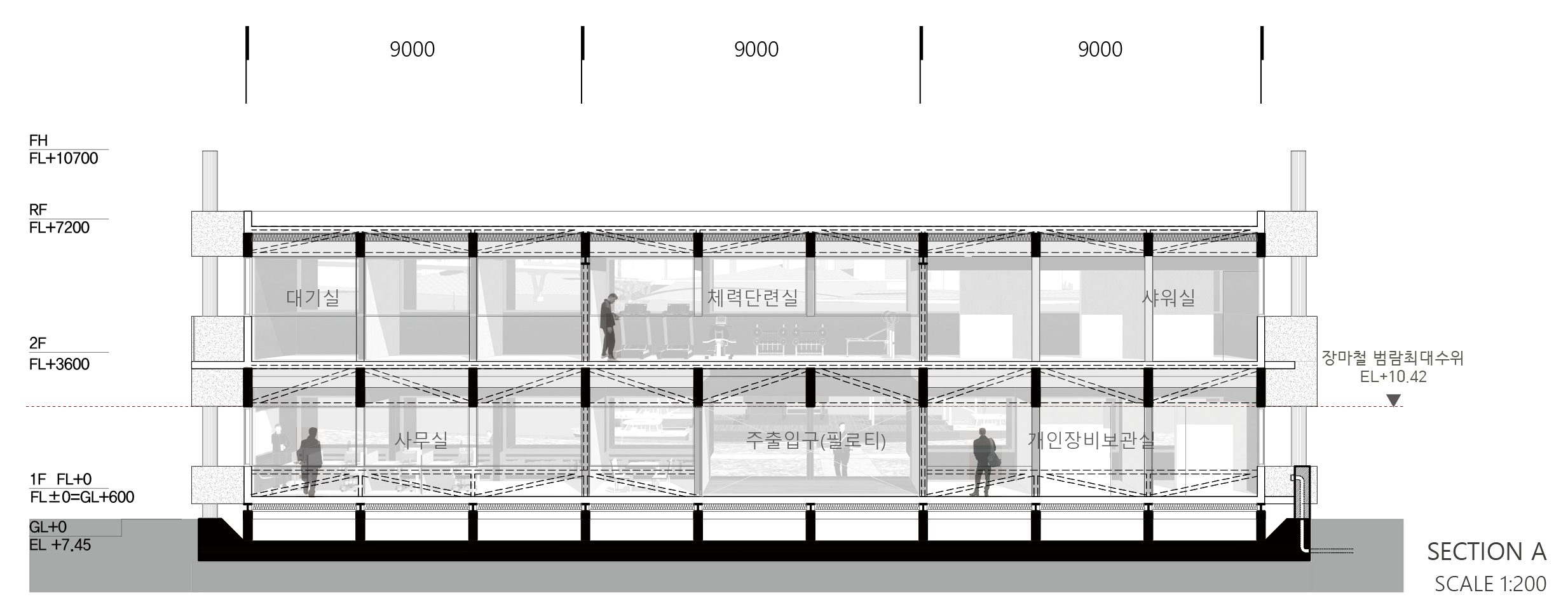 한강에 자리 잡은 새로운 경찰대는 단순히 기능적인 건물을 넘어, 도시와 강이 함께 쌓아온 거대한 기억의 흐름에 조심스럽게 발맞추는 건축입니다. 매년 여름7.5m까지 불어나는 강물 속에서도 스스로를 정화하는 강의 순환처럼, 이 건물은 자연의 리듬을 거스르지 않고 그 흐름 속에 놓여 있습니다. 새로운 한강경찰대는 이러한 자연의 순환에 순응하며, 그 곁에 조용히 깃들고자 합니다. 이는 단순히 기능적 판단을 넘어선 기술적 고민의 결과입니다. 건물의 형태는 거친 물살을 견디는 단순하고 견고한 선박(Multihull / Catamaran)을 닮았습니다. 이러한 단면적 형상은 넓은 갑판 면적을 확보할 수 있고, 롤링이 적어 안정성을 높일 수 있습니다. 유선형의 곡선 대신, 굳건한 사각형의 선체가 흐름 속에서도 흔들림 없이 자리를 지키듯, 이 건축물은 안정적으로 강에 대응하도록 하였습니다. 고정된 콘크리트 기초 위에 마치 물 위를 부유하는 듯한 공간이 펼쳐지고, 그 위로11자 형태의 철골 트러스가 겹겹이 쌓여 구조적 균형을 완성합니다.