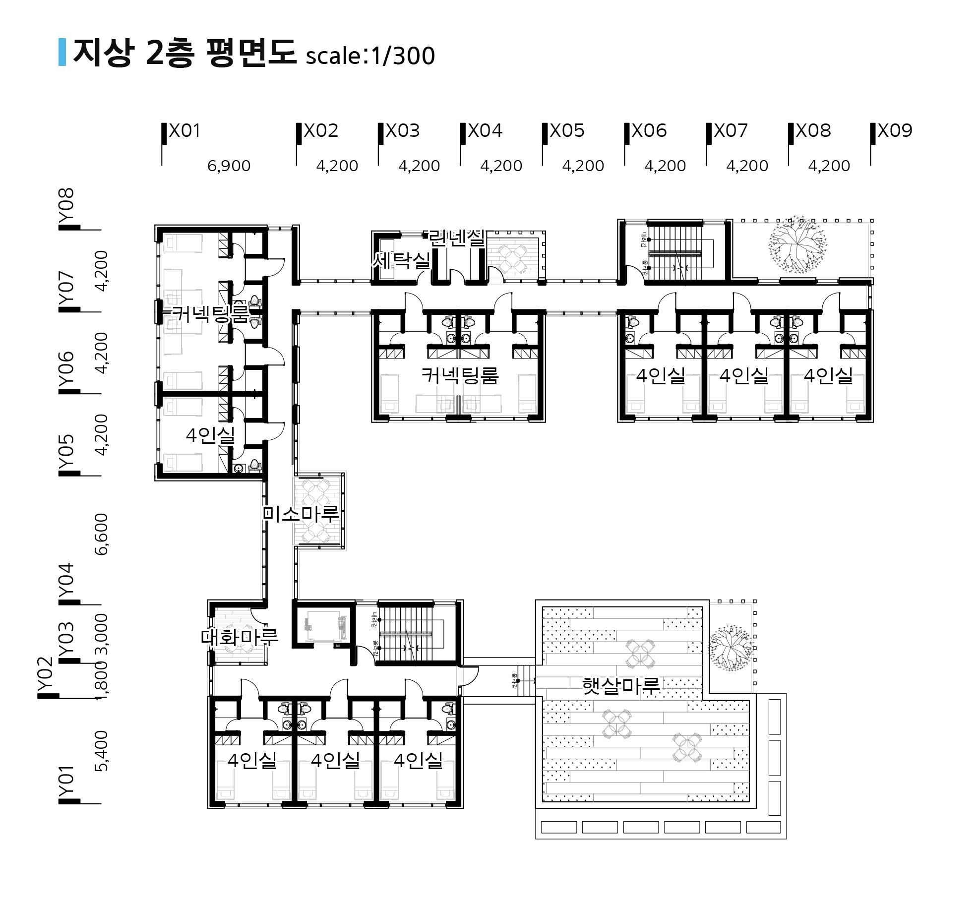 숙박실 유닛의 공간 활용을 위하여 가변형의 커넥팅도어를 설치하였으며, 이를 통한 각 실간 유기적 공간활용이 가능하도록 계획하였다.