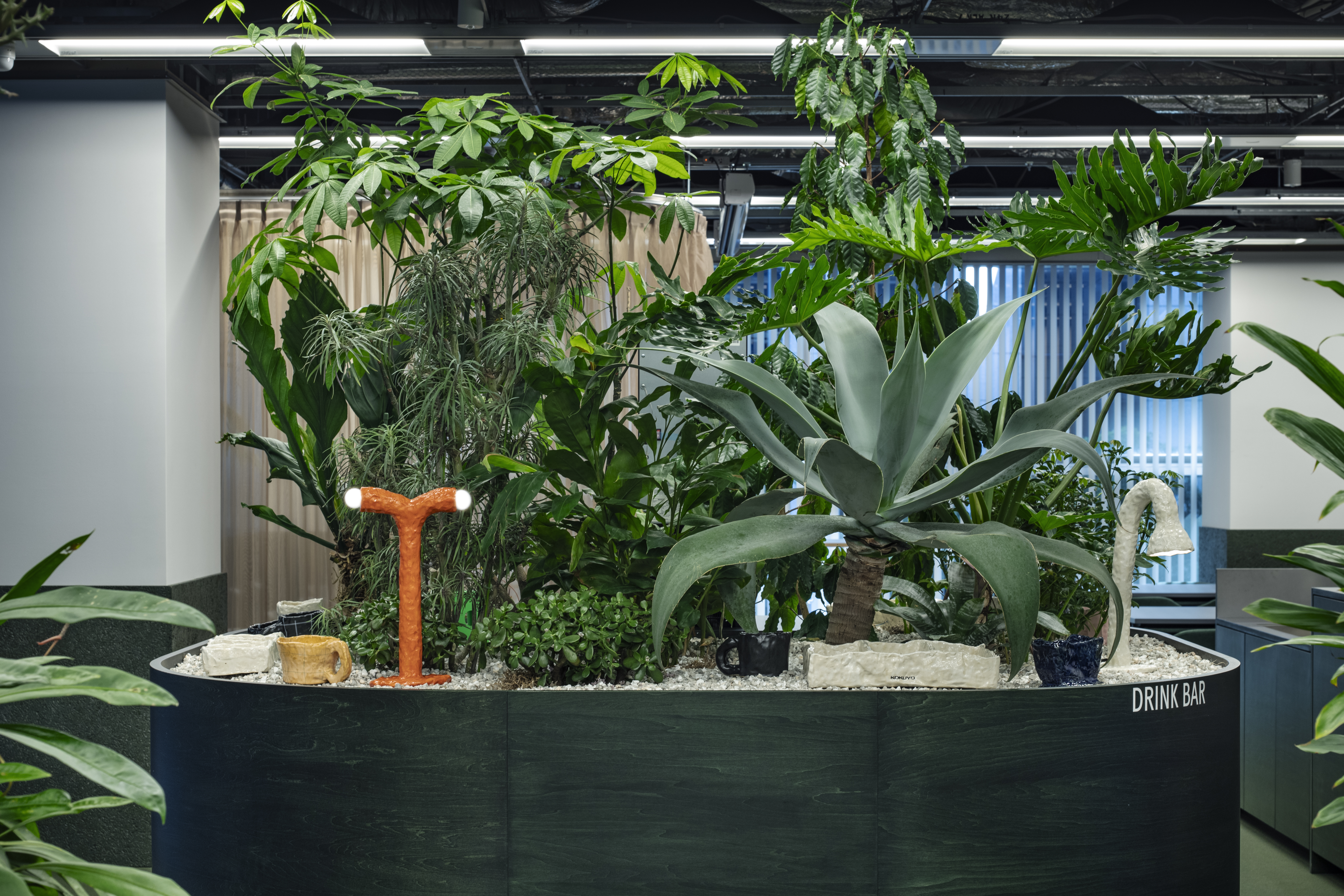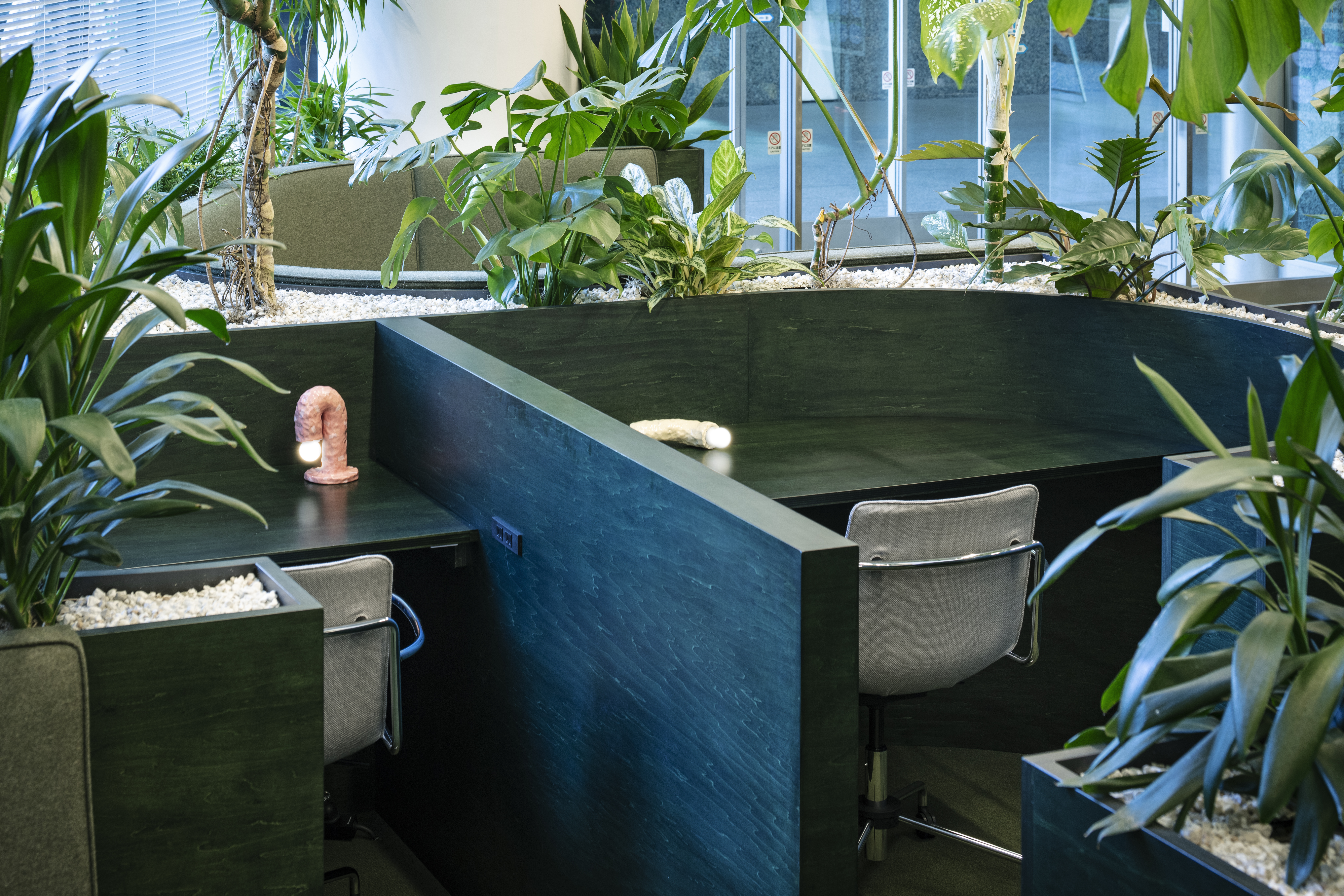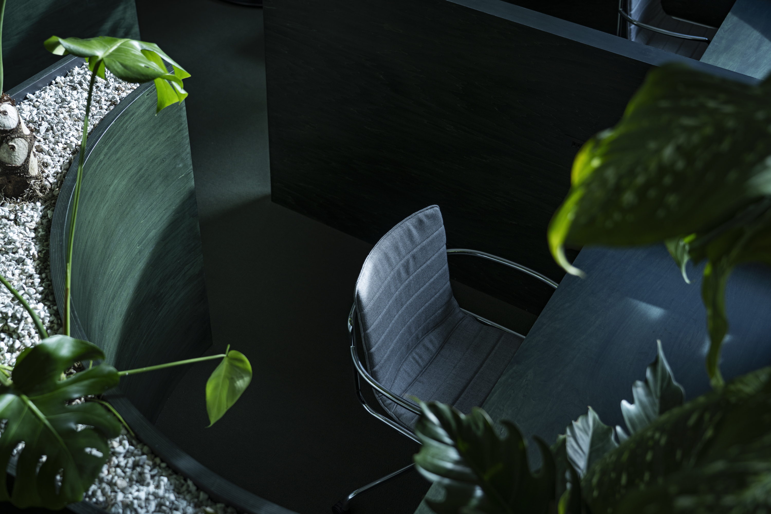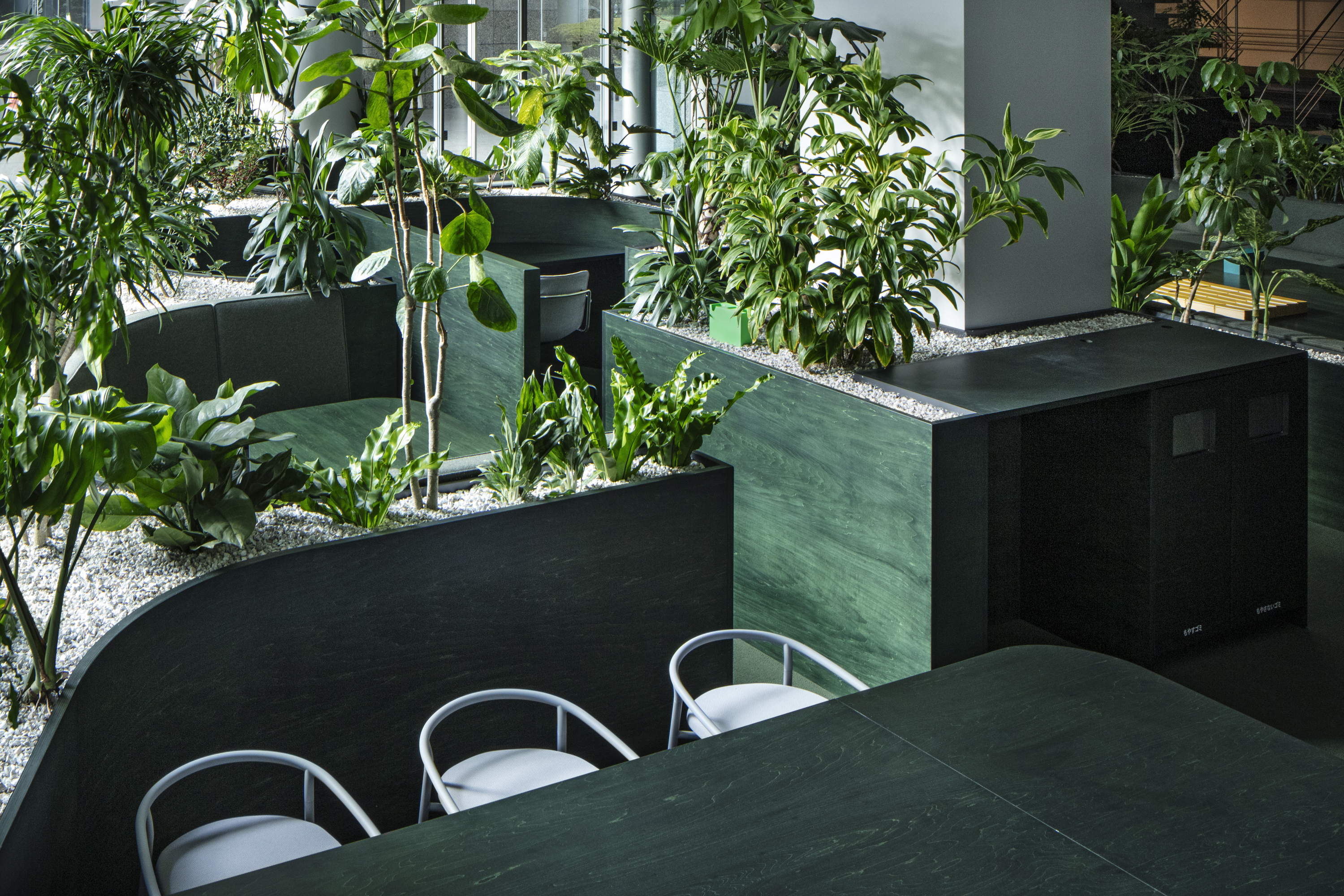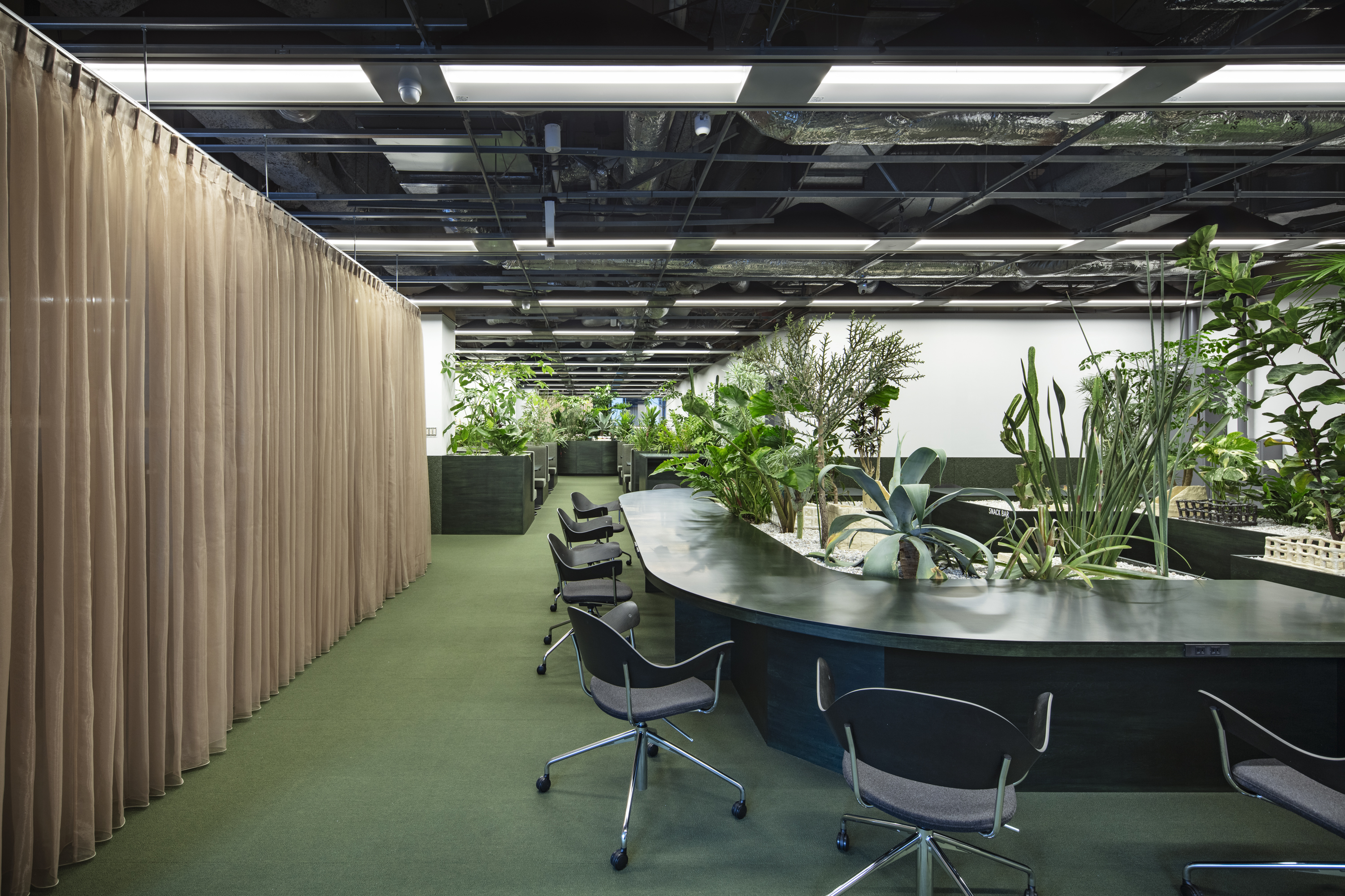 패밀리 레스토랑처럼 공간의 하부는 소규모 그룹을 위한 반개방형 좌석으로, 상부는 시야가 트인 공유 공간으로 구성했다. 중심부에서 후면으로 갈수록 높아지는 시선선과 가구 높이를 조정했으며, 플랜트를 활용한 파티션으로 시각적 완급을 조절했다. 바닥과 어우러지는 그린 톤의 가구는 ‘앉았을 때의 집중’과 ‘서 있을 때의 공유’가 공존하도록 했다.