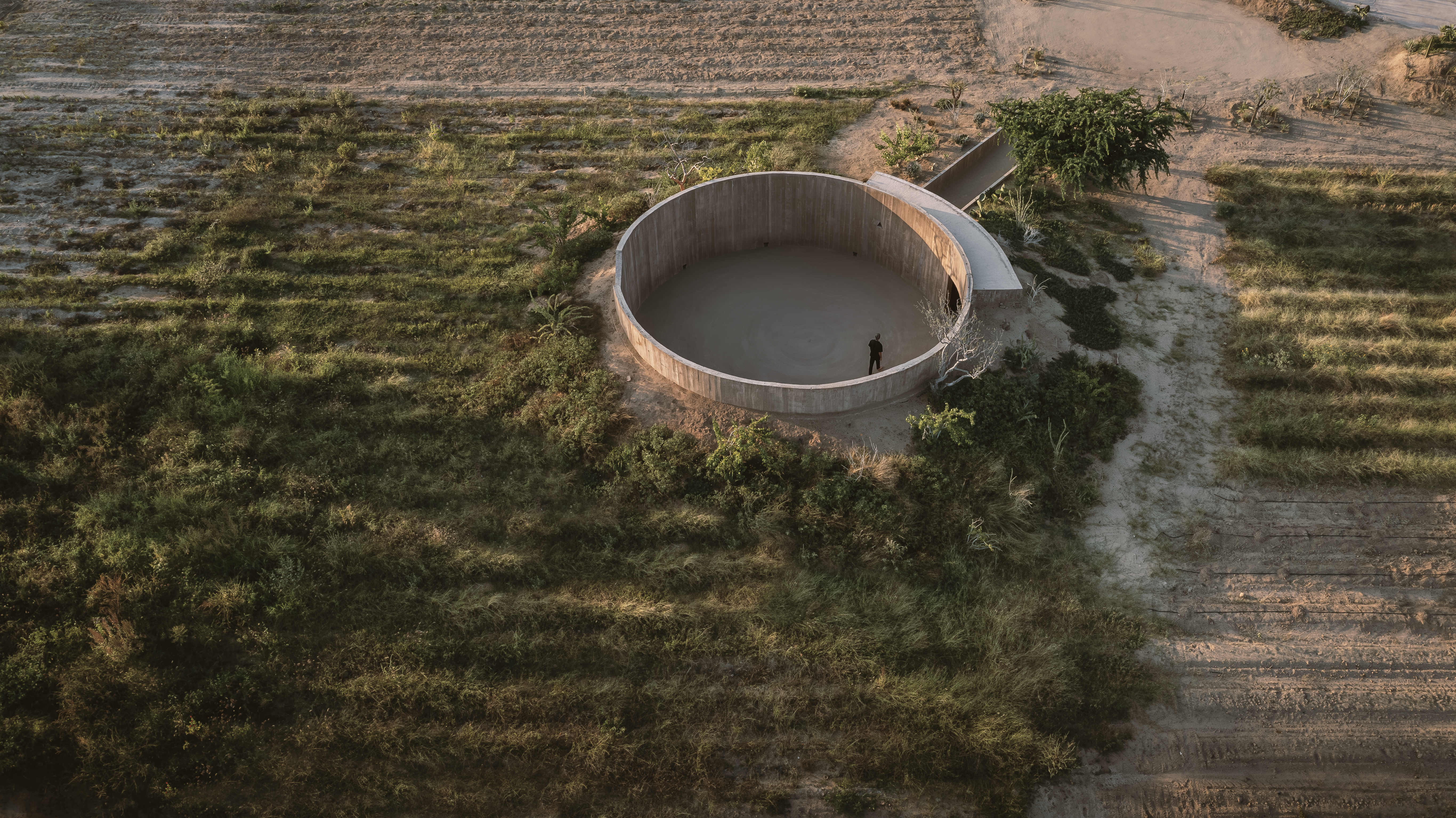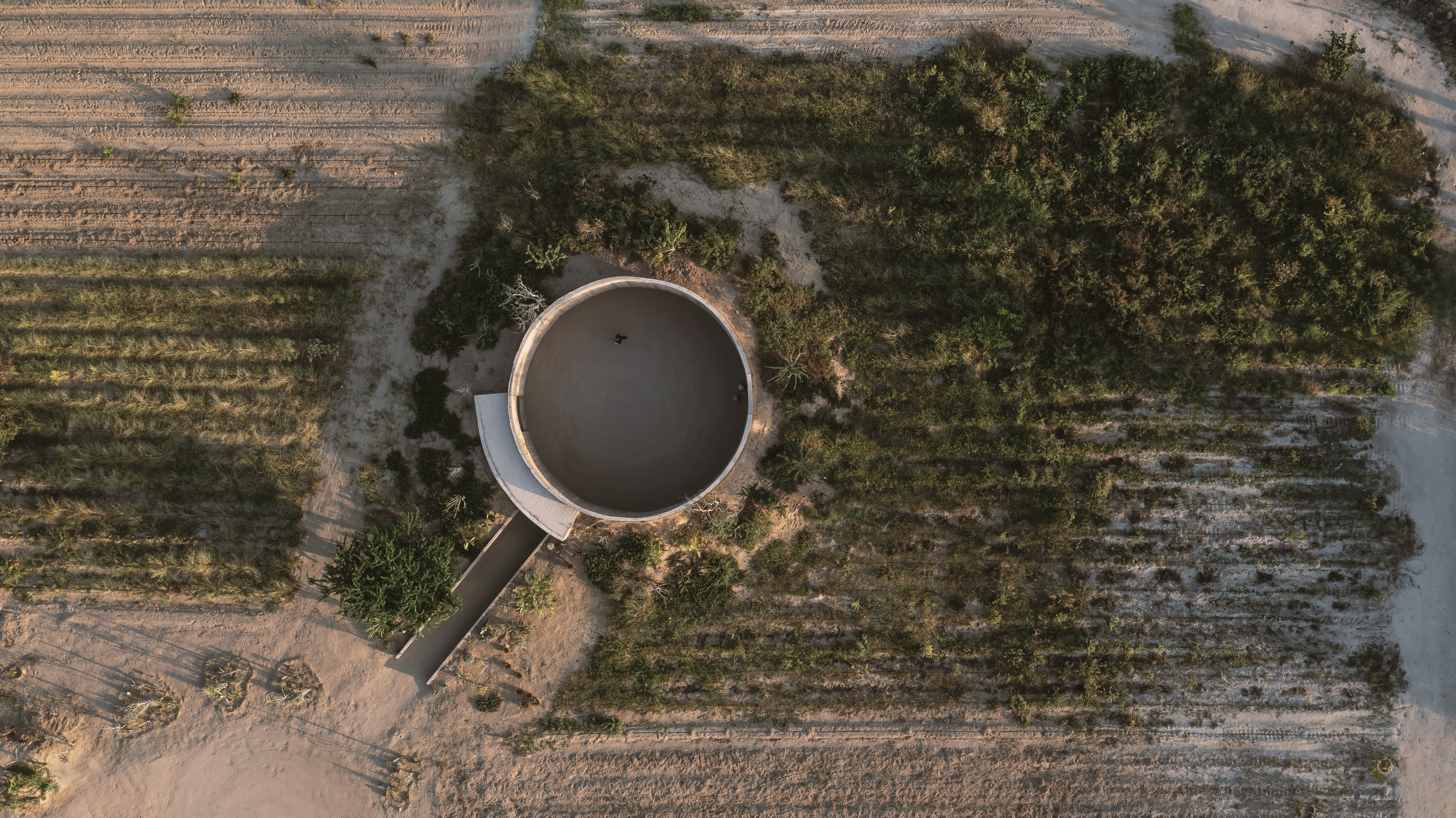 둥근 형태의 건축물은 사막 지형 속에 반쯤 묻혀 있으며, 이는 주변 대지와의 관계를 상징적으로 드러낸다. 바닥의 맨흙과 열린 천장은 이곳을 찾는 이들에게 땅과 우주를 연결하는 초월적 감각을 경험하게 한다.