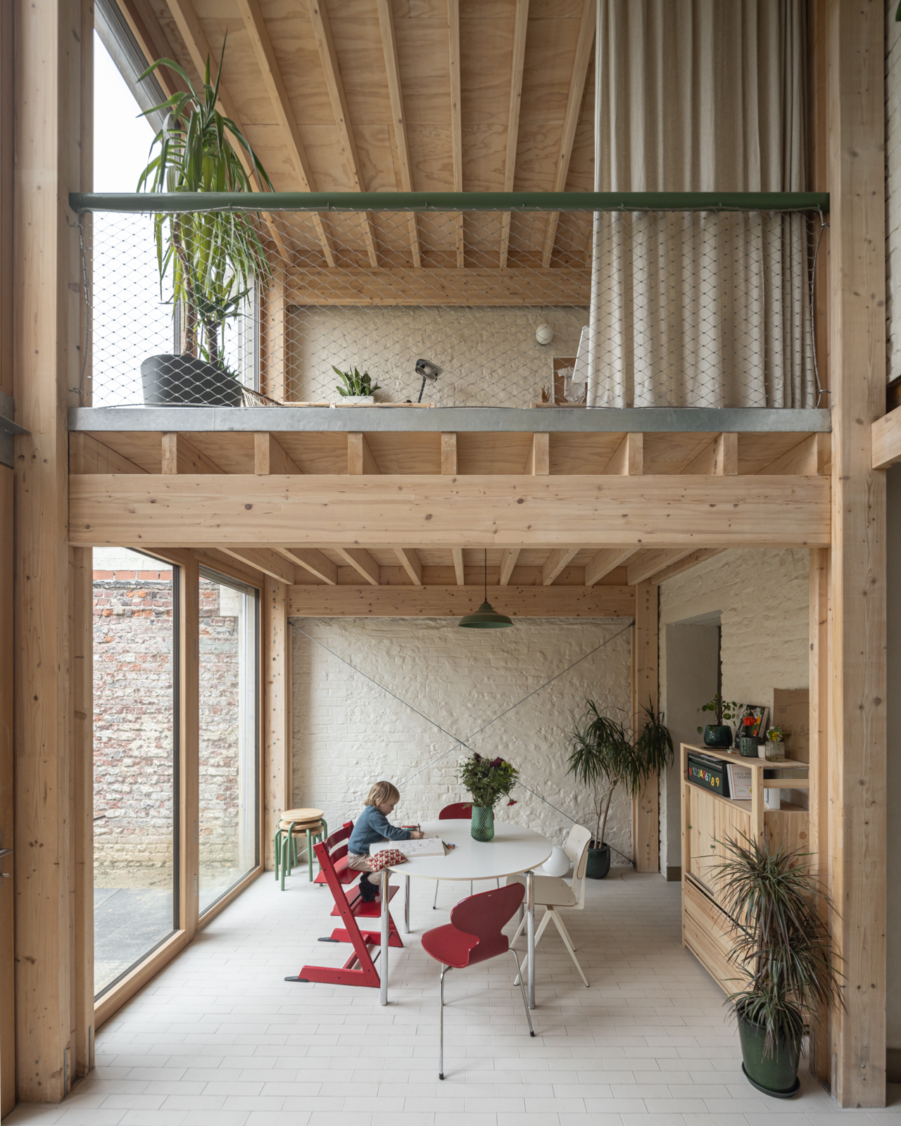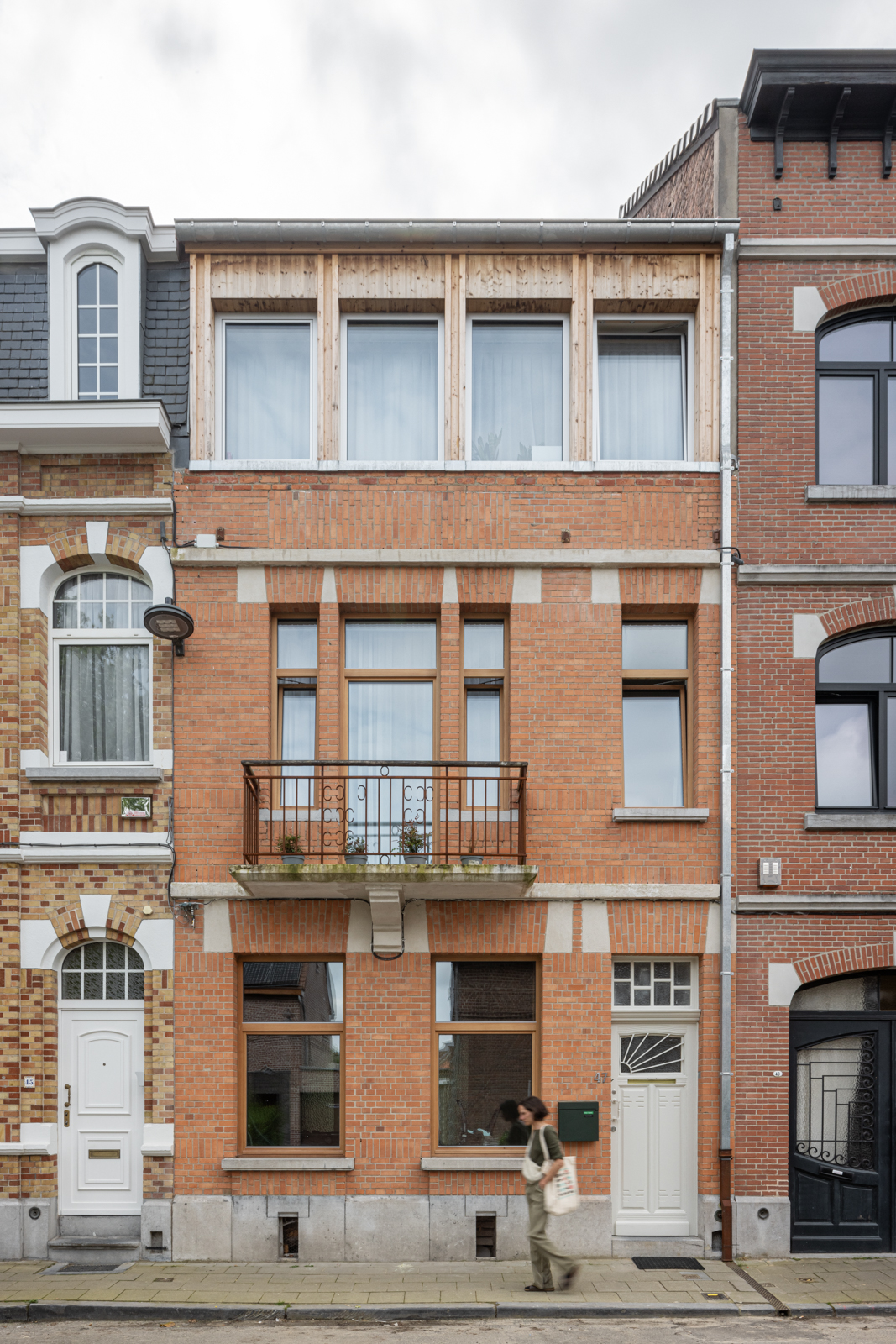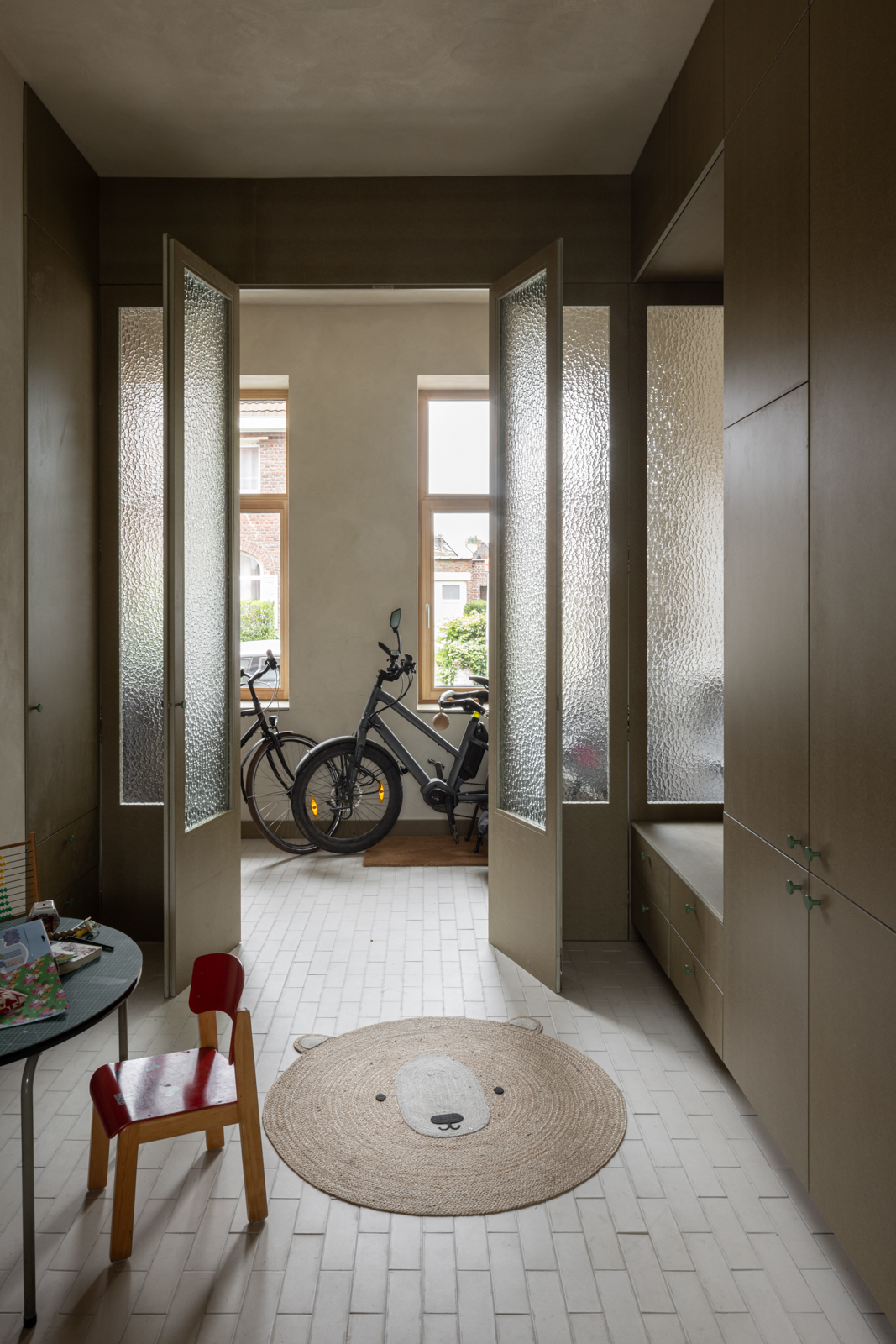 전면 입면과 새로운 내부 유리벽 사이에는 자전거, 유모차, 외투, 신발을 위한 실용적인 현관 공간이 생겼고, 전면 입면의 미묘한 상승은 새로운 확장부의 형태를 암시하며, 아토미움(Atomium)이 보이는 두 아이의 침실 공간을 만들어냈다. 이 집은 구조적 유연성과 감성적 연결을 동시에 갖춘 주거로, 거주자의 생활 변화에 맞춰 유기적으로 진화할 수 있는 집을 보여준다.