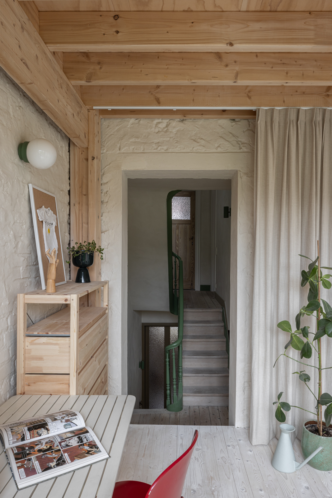 이 새로운 확장부는 집 안 깊숙이 풍부한 자연광을 끌어들이고, 내부와 정원을 자연스럽게 연결한다. 구조는 볼트 체결식의 분해 가능한 목구조로 설계되어, 향후 변화나 확장이 용이하도록 했다. 이 구조는 후면 입면에서도 드러나며, 예전 별채 벽을 타고 자라던 등나무를 다시 지지한다. 헤!는 이 식물을 보존하는 것을 중요하게 여겼고, 지금은 그것이 작은 야외 방의 경계를 만들어낸다.