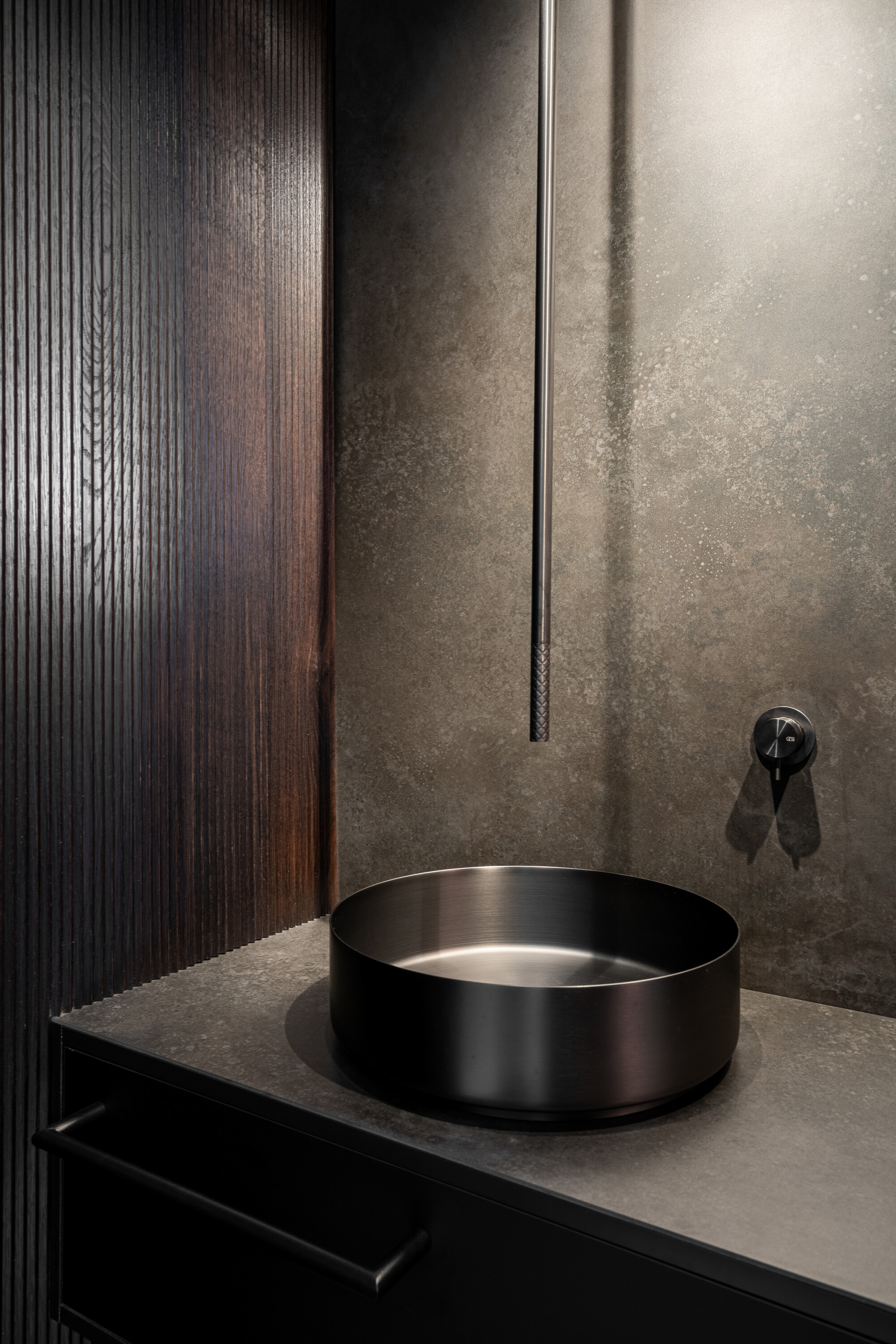 욕실에는 대형 다크톤 타일과 황동 수전(brass faucet)을 조합해 깊이감 있는 질감을 완성했다. 시공 단계에서부터 개발사와 협의해 매입형 수전을 미리 설치함으로써, 별도의 철거 없이 천장 매입형 수전 시스템을 구현할 수 있었다. 그 결과, 욕실은 고급스러우면서도 절제된 분위기를 갖췄다.