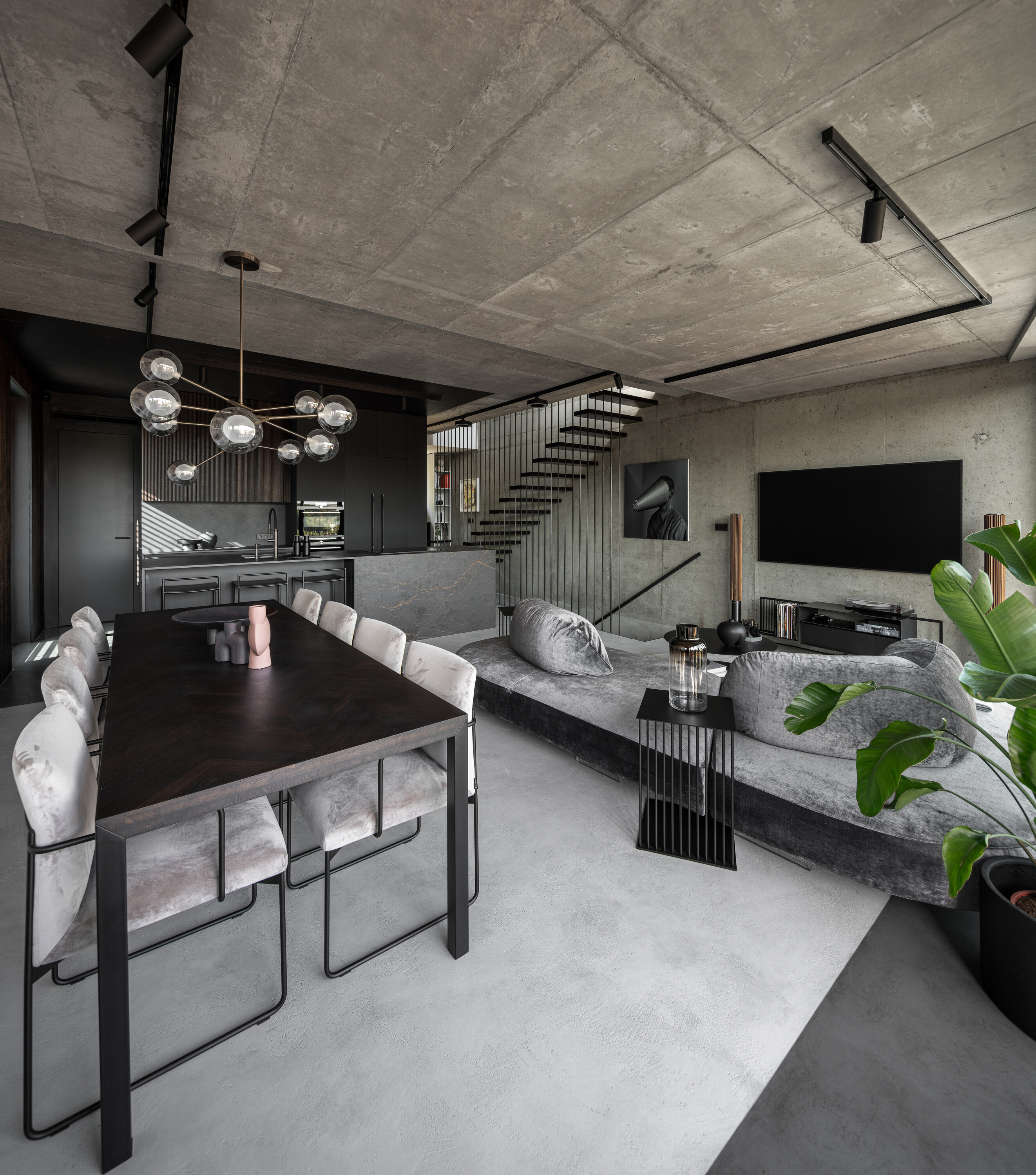 세 층을 관통하는 노출 콘크리트 구조물이 공간 전체의 중심 요소로 설계되었으며, 시공 단계 내내 클라이언트와 협의한 끝에 이 거친 질감의 콘크리트를 그대로 드러내기로 했다. 결과적으로, 이 구조는 단순한 마감재를 넘어 인테리어의 구조적 아이콘으로 기능한다.