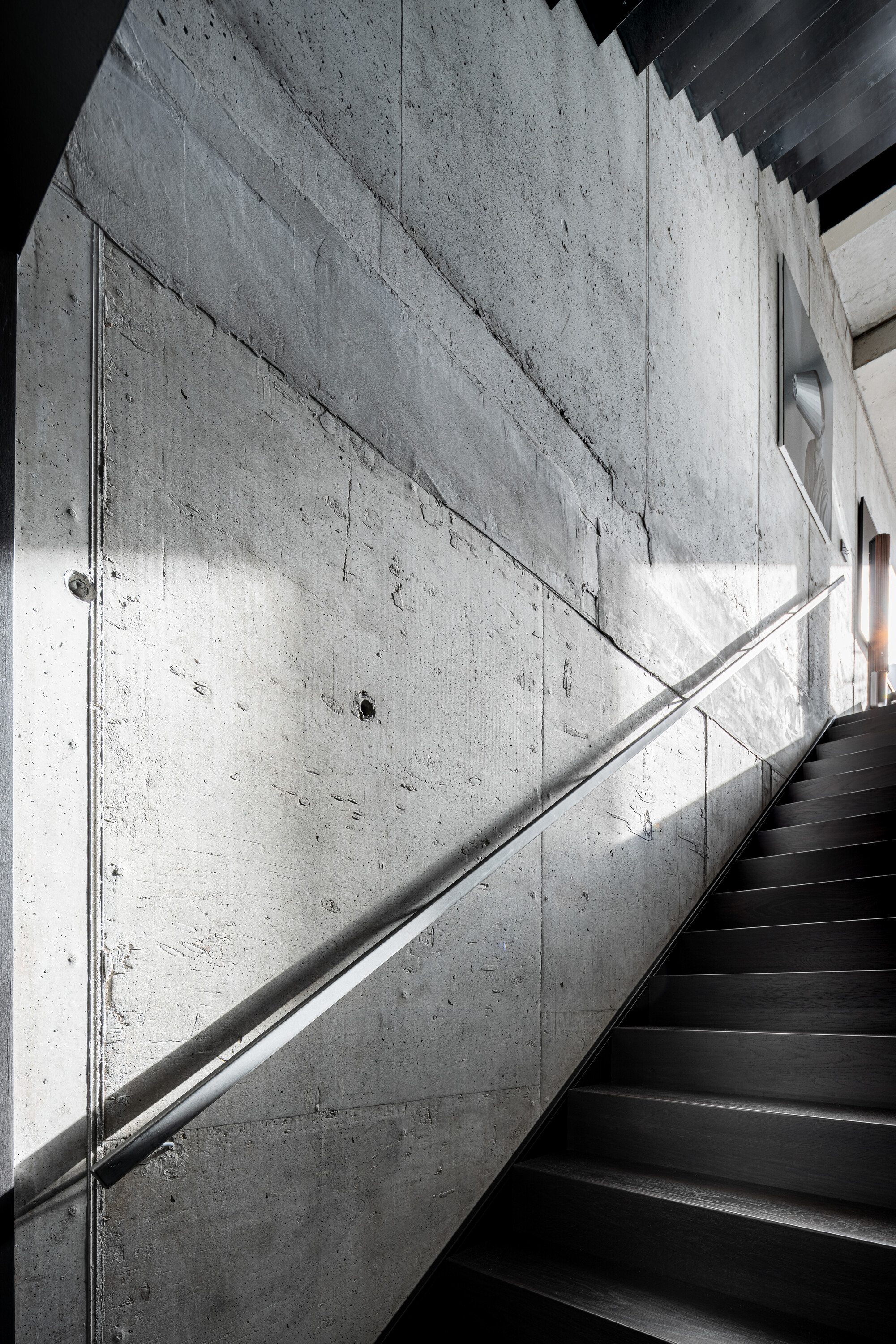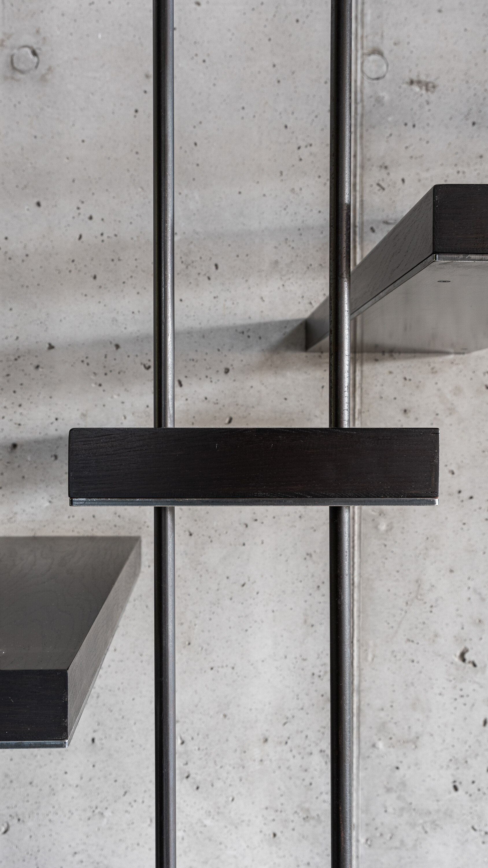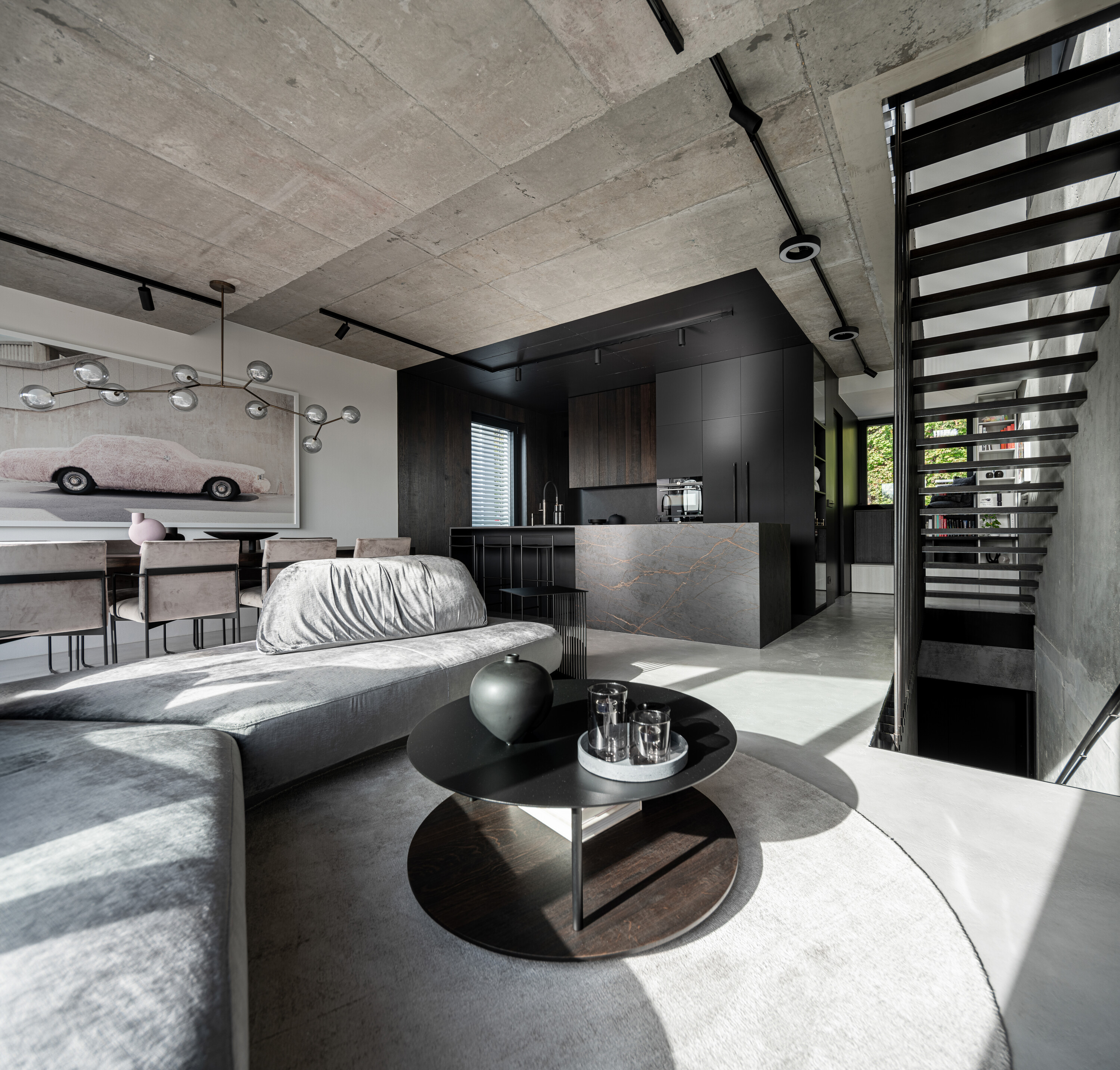 거실의 시각적 중심은 스틸 로드로 구성된 벽면과 부유하는 계단(suspended staircase)이다. 각 계단은 얇은 스틸 블레이드 위에 목재 마감을 덧입힌 구조로, 세 가지 전문 분야(철골, 목공, 마감)가 긴밀하게 협력해야 설치가 가능했다. 이 결과물은 가볍게 떠 있는 듯한 조형미를 갖춘, 완전히 독창적인 계단이 되었다.