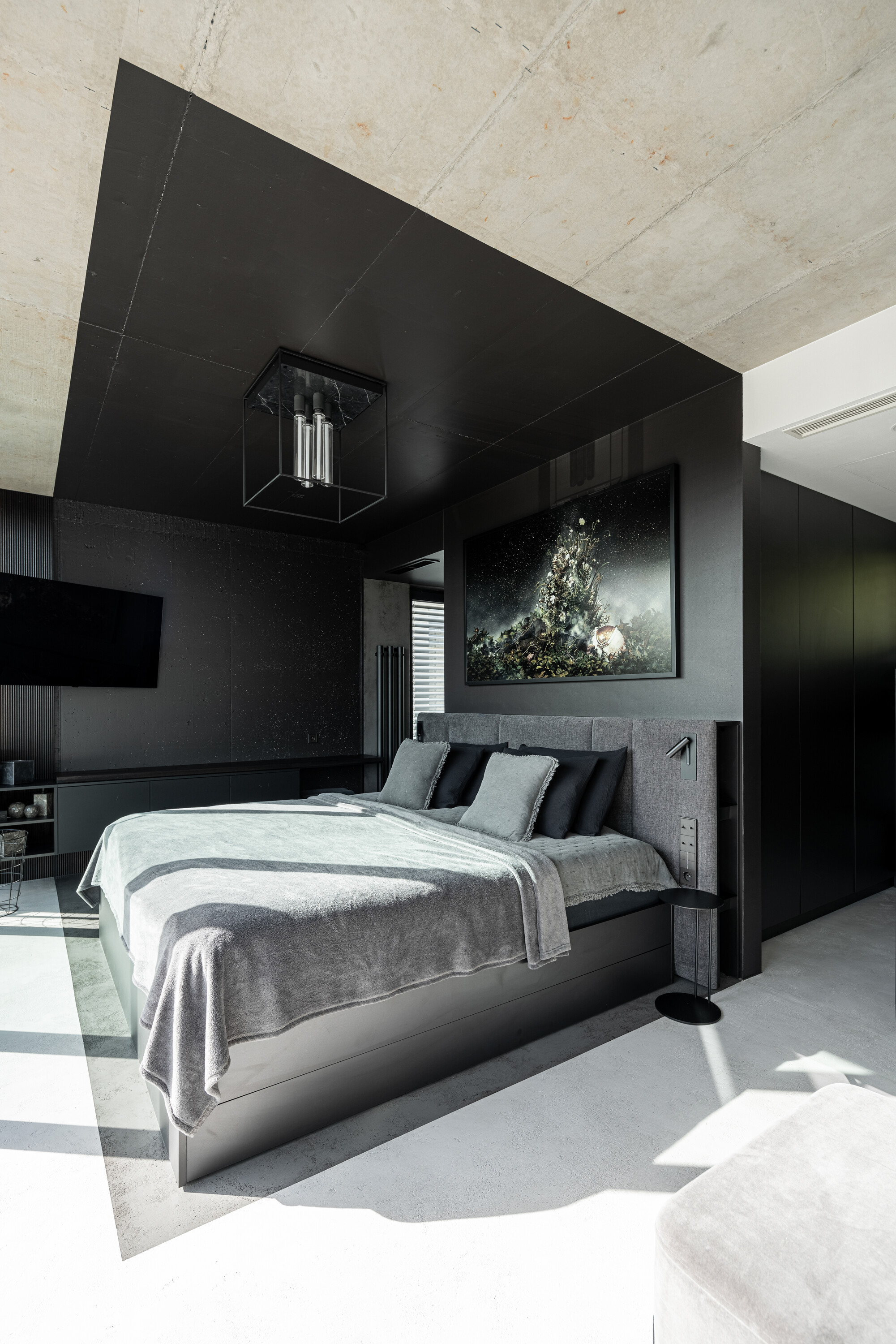 2층에는 침대 헤드보드 뒤편에 서가와 수납을 통합한 블랙 베드룸, 3층에는 블랙 톤의 스터디룸이 배치되어, 각 층이 하나의 명확한 테마로 구분된다.