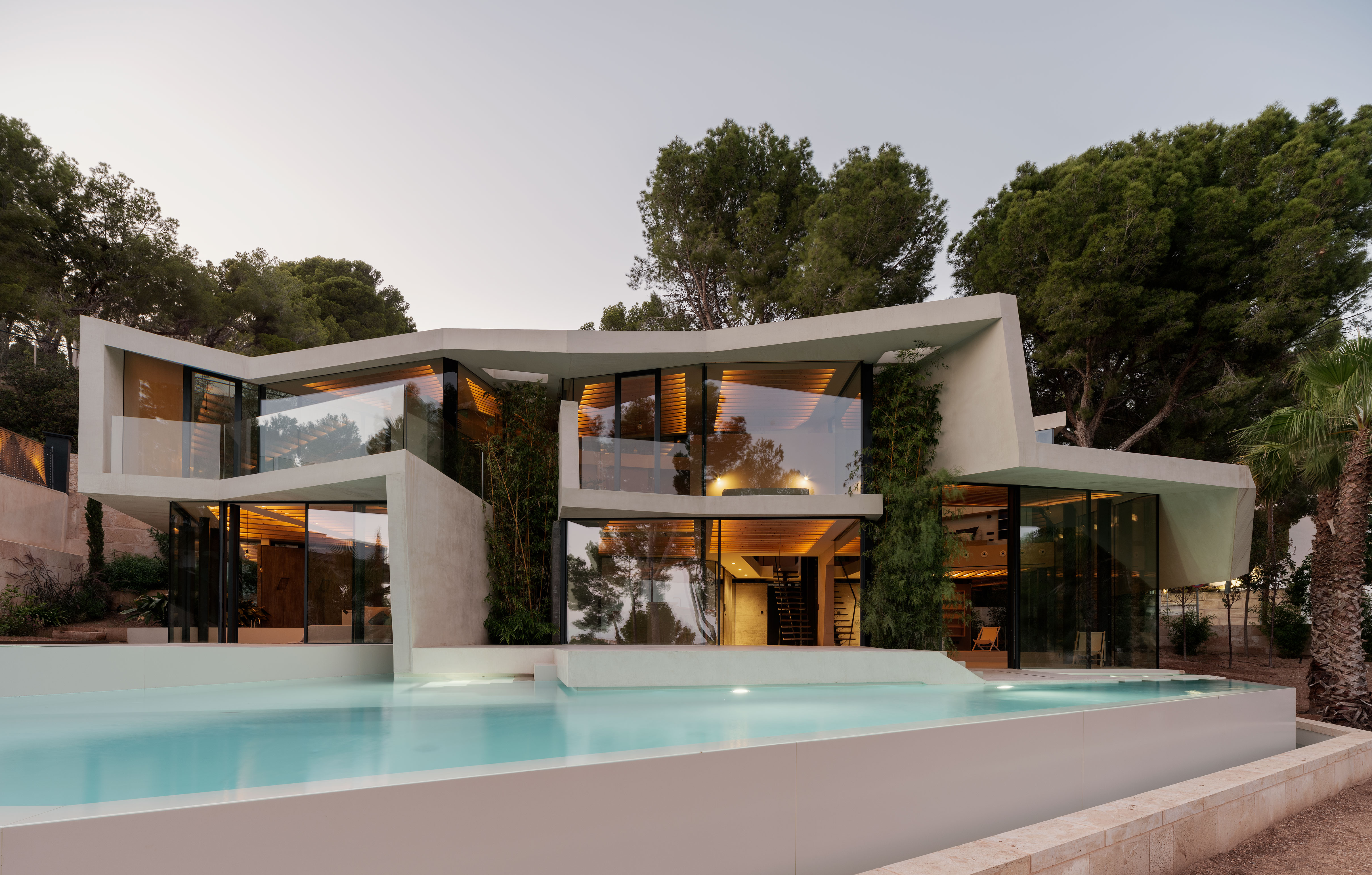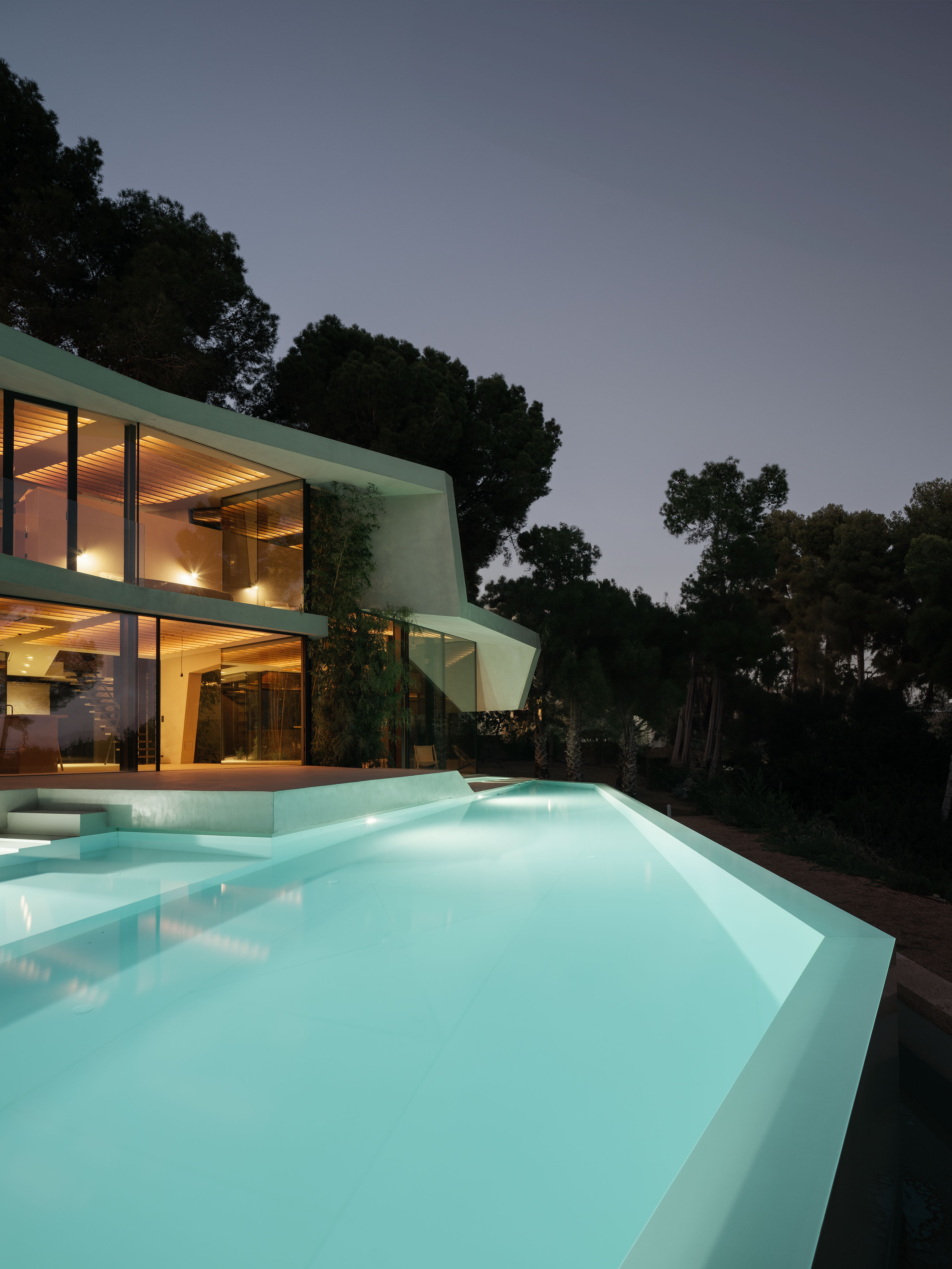 캔 투도 (Can Tudó)는 파게라 만을 내려다보는 가파른 경사지에 자리한다. 소나무 숲 사이로 펼쳐지는 절경을 향해 열린 이 주택은, 하나의 접힌 종이 한 장으로부터 공간 전체를 생성한다는 규칙적이면서도 유희적인 실험으로 구상되었다. 지붕, 벽, 실내외 바닥 모두 이 한 장의 ‘접힌 시트’로 구성된다.
