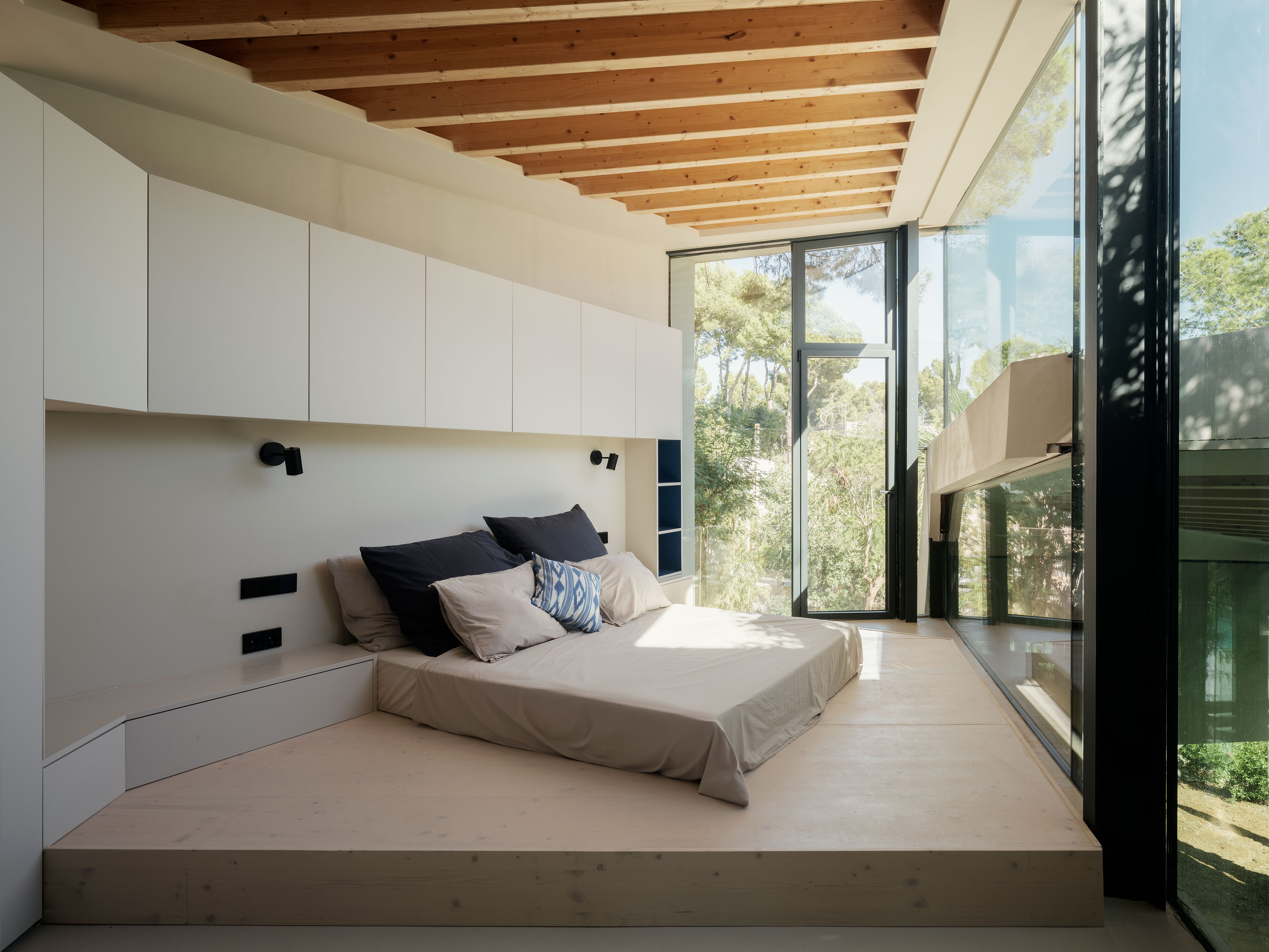이 접힌 시트가 완성된 뒤, 그 위에 천장부터 바닥까지 이어지는 프레임리스 유리, 분리된 문, 그리고 독립된 가구처럼 보이는 작은 구조체들이 배치되어 각각의 기능을 담는다. 이 단일한 구성 원리는 실내와 실외, 자연과 건축의 경계를 흐릿하게 만들며, 남측 유리 벽면의 틈과 안뜰로 자연을 내부로 끌어들인다. 이로써 식물들은 벽의 역할을 대신하며, 가지와 잎, 꽃이 얽히며 공간 사이를 투과하는 시각적 레이어를 만든다.