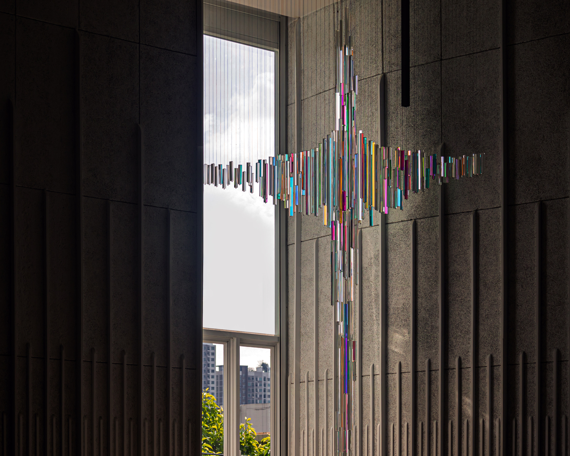 이 언약에서 영감을 받아 전면 파사드에는 디크로익 아크릴로 제작된 언약의 십자가가 자리한다. 이 십자가는 햇빛을 받아 반사되고 굴절되며 역동적인 색의 상호작용을 창출한다. 다양한 깊이의 핀들은 예수의 형상을 추상적으로 구현하며, 햇빛이 파사드를 감쌀 때 십자가는 생동감 있게 빛나며 기쁨의 언약을 표현한다. 빛과 하늘의 조건에 따라 색은 변주를 이루고, 흐린 날에는 은은한 색조를 드러내고, 햇빛이 비출 때는 선명한 색이 반사되어 파사드에 생명력을 불어넣는다.