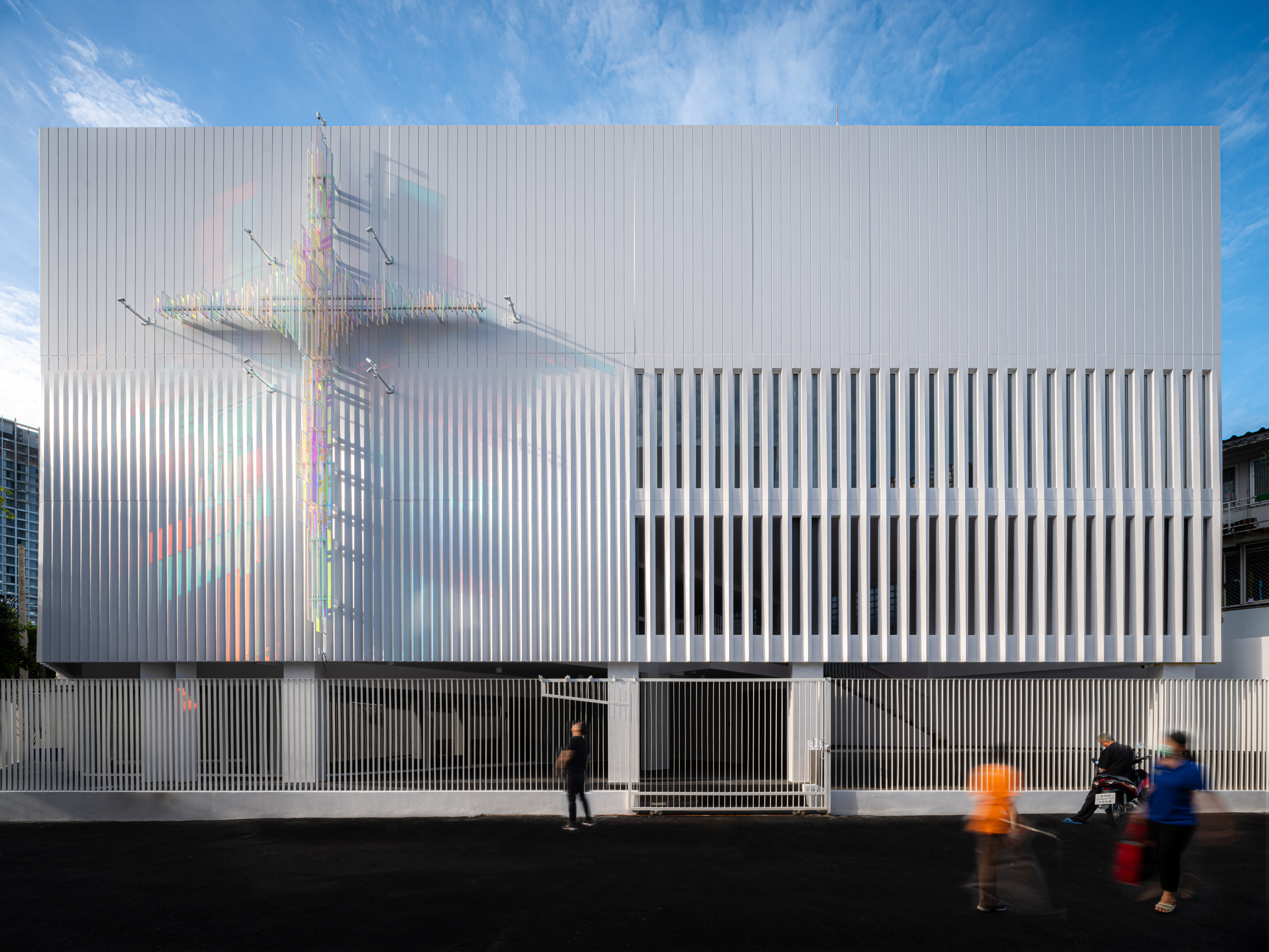 파사드의 프리캐스트 수직 주름은 구약의 성막처럼 신과 인간의 경계를 상징하며 아래로 흘러내린다. 이 주름은 햇빛을 받아 정교한 그림자를 드리우며, 언약의 십자가(Covenant Cross)를 위한 강렬한 캔버스를 형성한다.