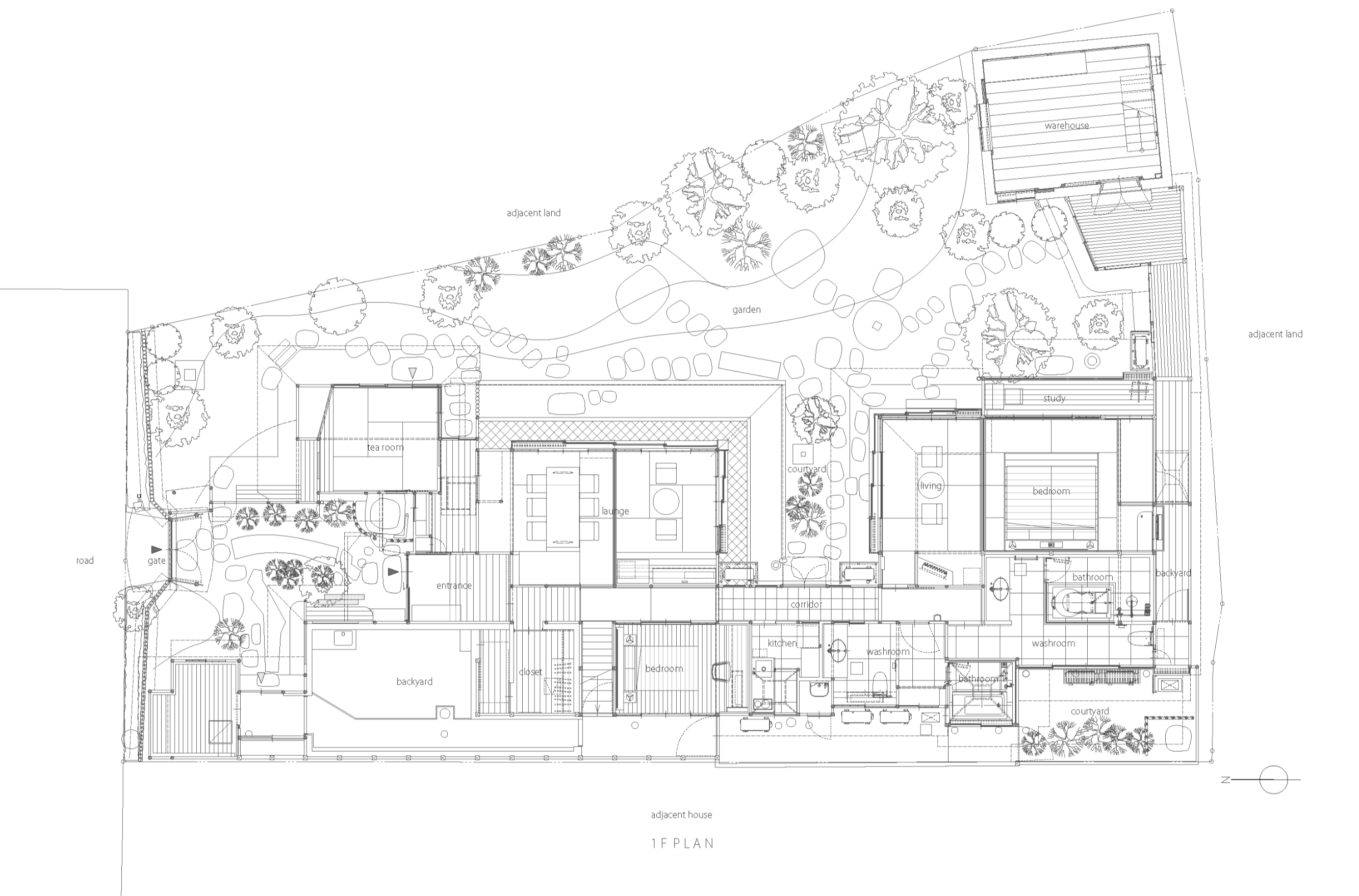 대지는 남북으로 길게 놓여 있으며, 서쪽에는 건물이, 동쪽에는 정원이 배치되어 있다. 각 실에는 정원을 조망할 수 있는 큰 개구부가 있고, 스키야 양식 특유의 불규칙한 평면은 건물과 정원이 하나의 공간적 흐름으로 이어지도록 만든다.
