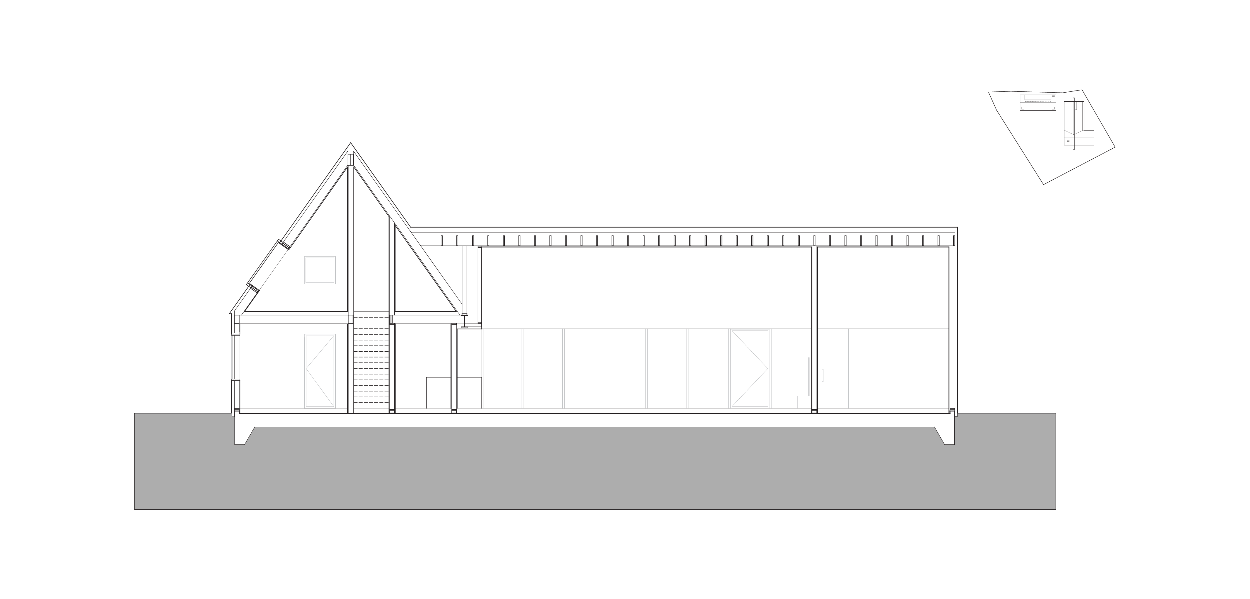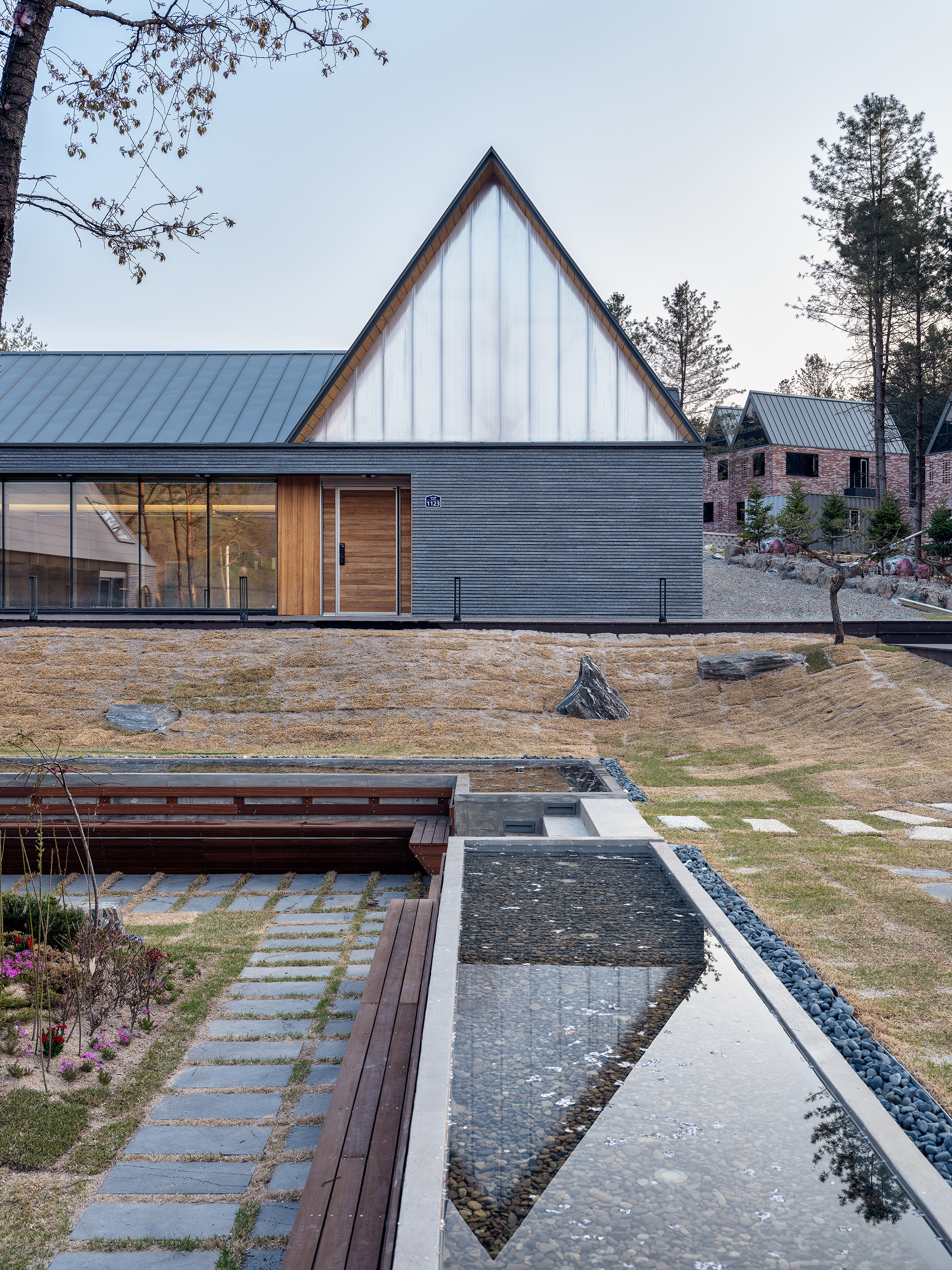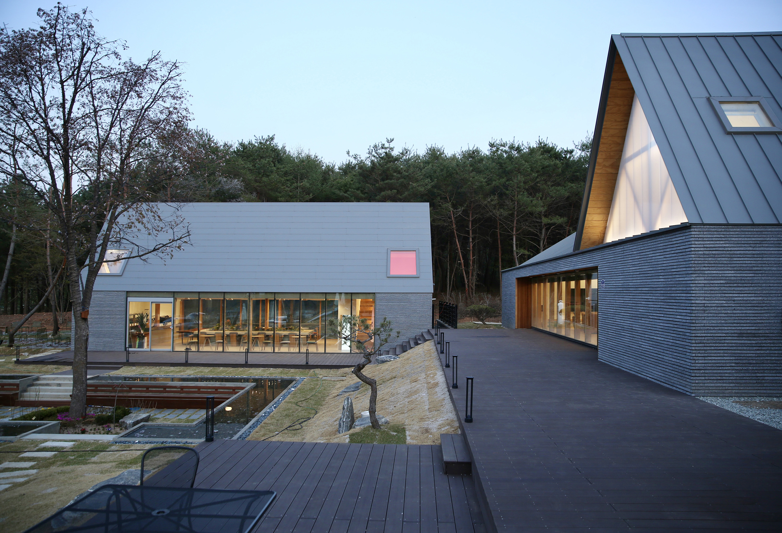 포레스트 에지(숲의 모서리)’는 카페와 숙박 주택, 두 개의 동으로 구성된 복합 건축이다. 두 건물 모두 멀리 보이는 산세와 조화를 이루기 위해 경사지붕 형태로 계획되었으며, 숲과 맞닿은 경계부에 배치되었다.