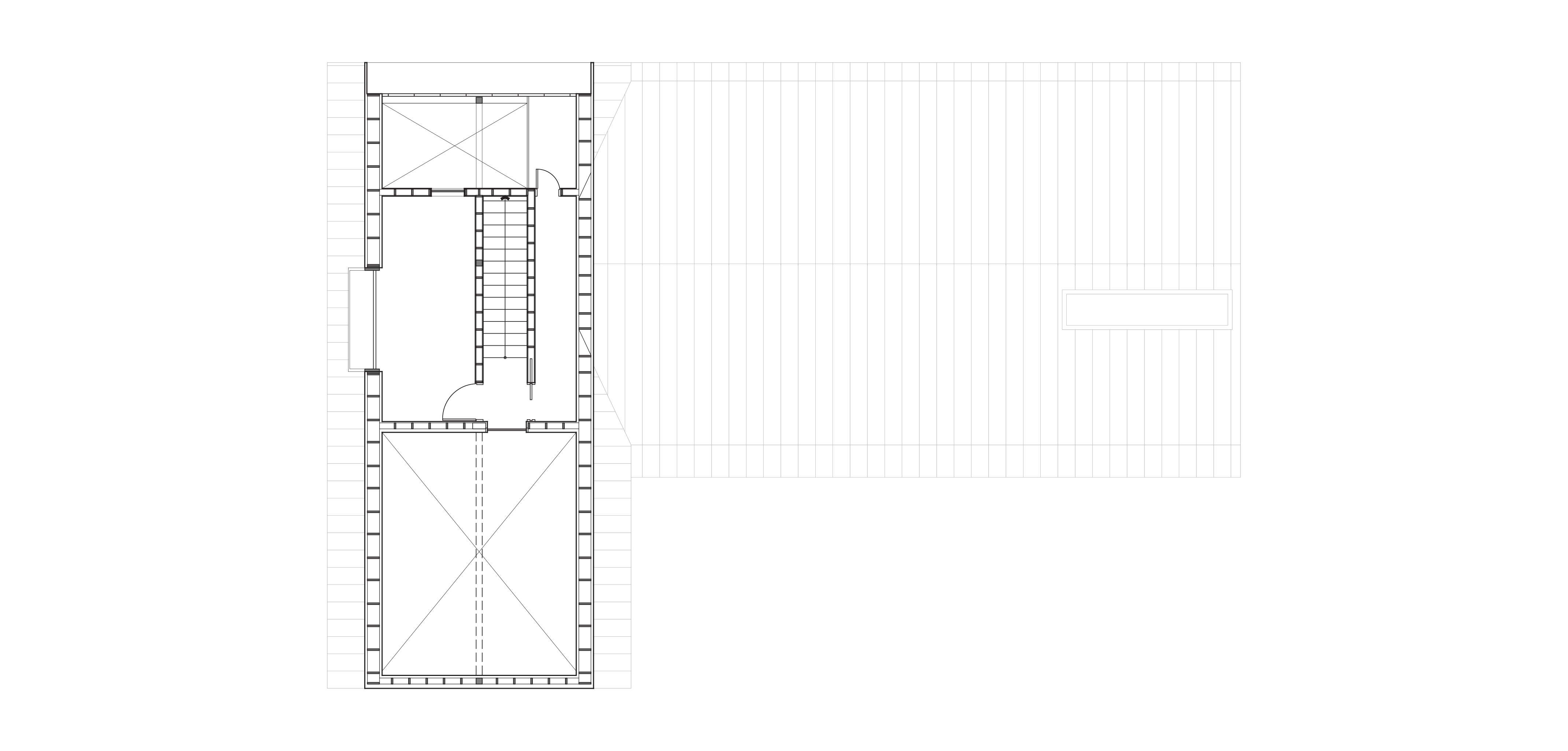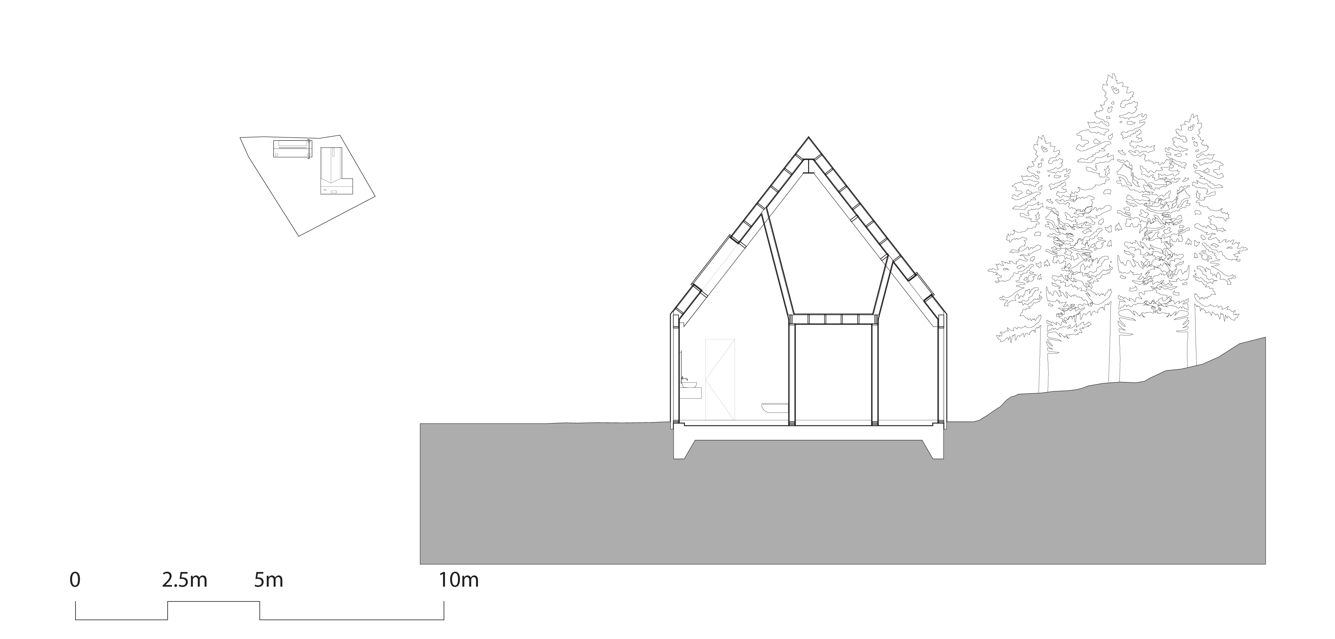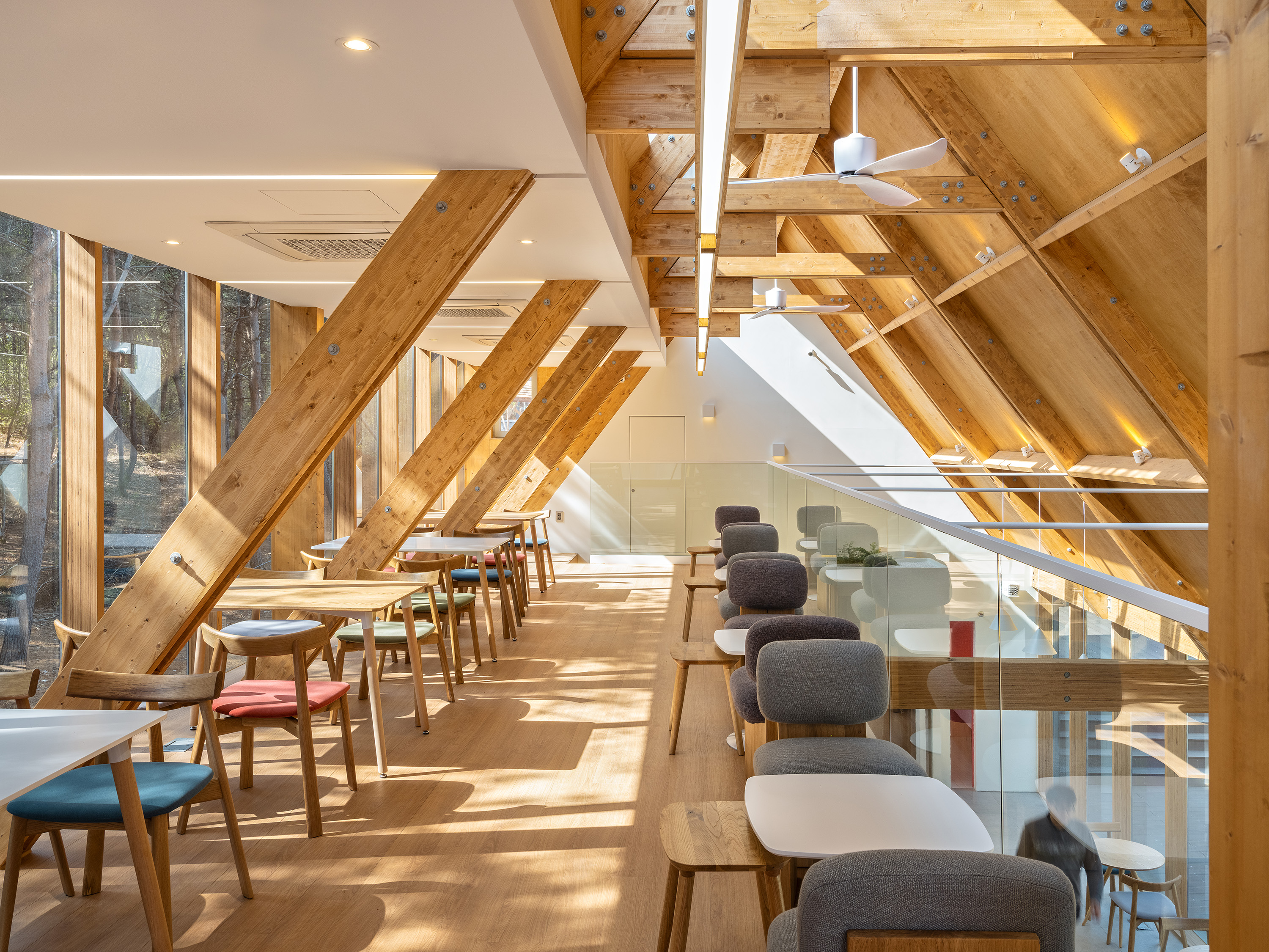 2층에서는 대량 생산된 목재 구조와 맞은편 숲의 자연목이 시각적 긴장을 이루며 서로를 반사한다. 스푸루스 집성목(A-truss)과 LVL 보(슬래브)는 각각 두세 겹으로 결합되어 목재의 구조적 한계를 보완하며, 볼트와 결합부를 노출시켜 재료의 물성을 숨기지 않고 드러냈다. 이러한 디테일은 구조적 논리를 시각적으로 표현하는 장치로 작동한다.