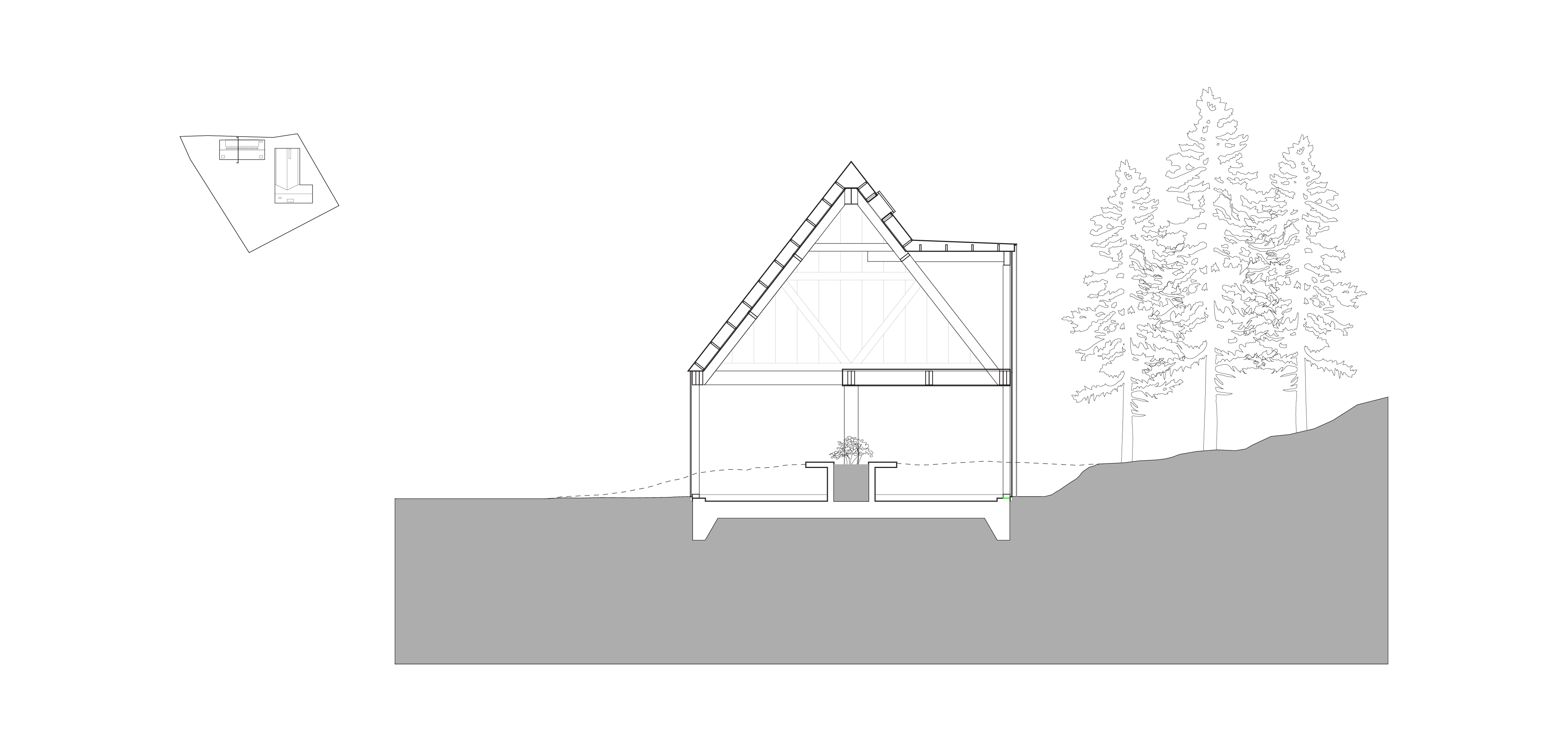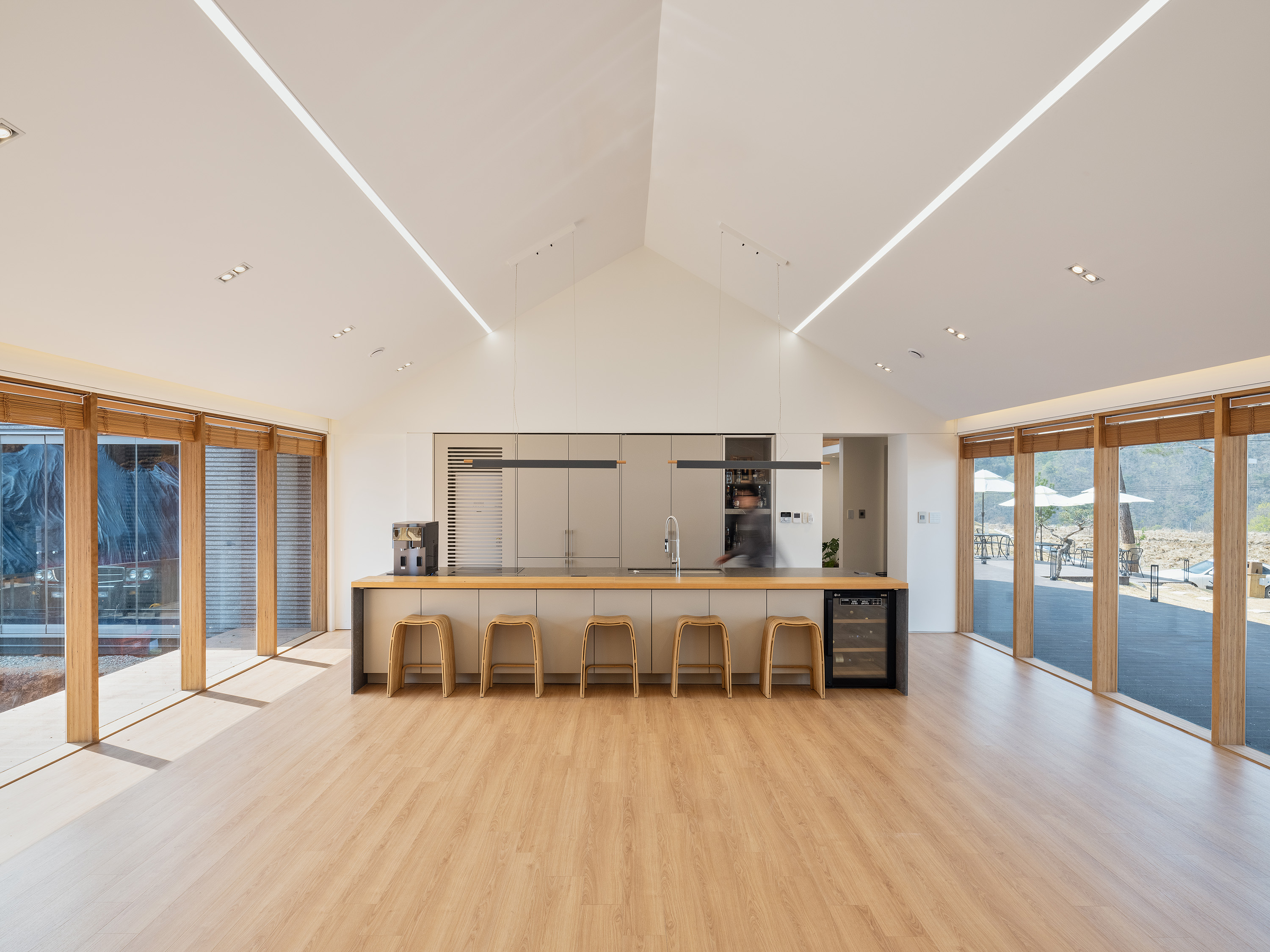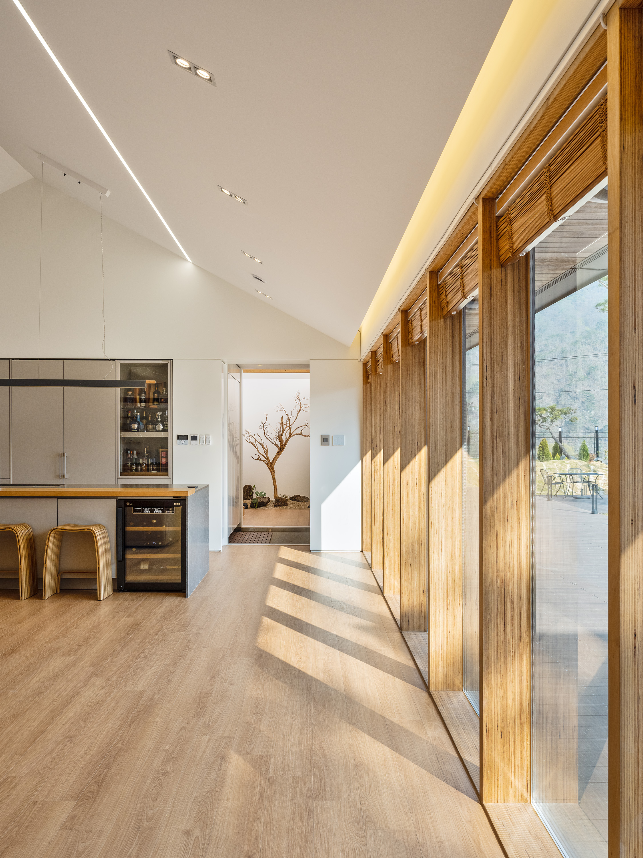 평면 구성은 단순하지만 명료하다. 카페동은 이용 공간과 지원 공간을 재료와 투명도의 대비로 구분했고, 숙박동은 중앙의 투명한 LDK 공간을 중심으로 좌우 대칭으로 숙박 영역을 배치했다. 마스터룸은 숲을 향해 드레스룸–침실–욕실로 이어지며 천장 높이가 점진적으로 변화한다. 최종 공간인 욕실에는 4m 높이의 천창을 두어 빛이 깊숙이 스며들도록 했다. 반대편 숙박 영역은 7m의 높은 천장과 실내 정원을 통해 자연광을 들이며, 각 공간은 빛, 높이, 재료의 밀도를 달리하며 숲의 리듬에 반응한다.