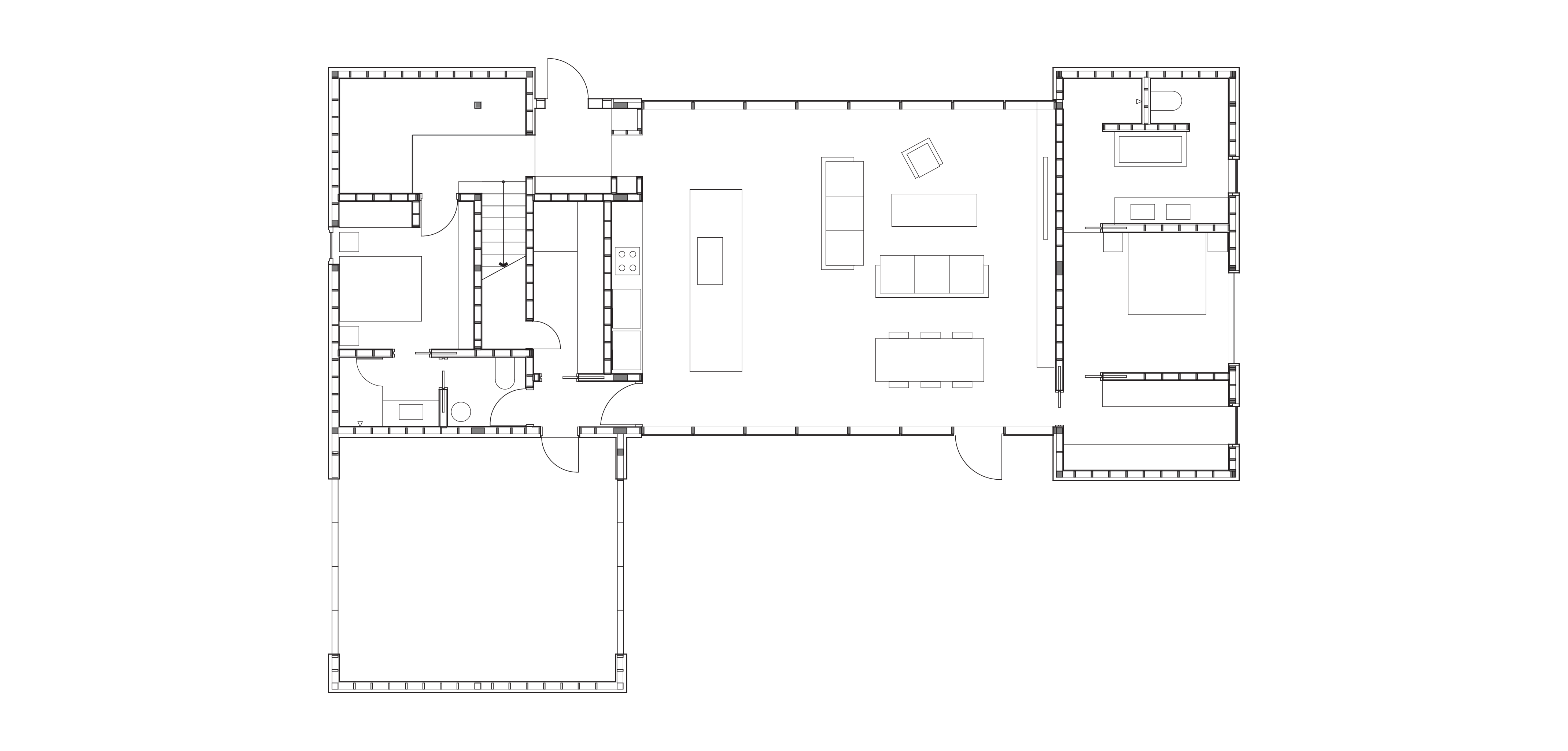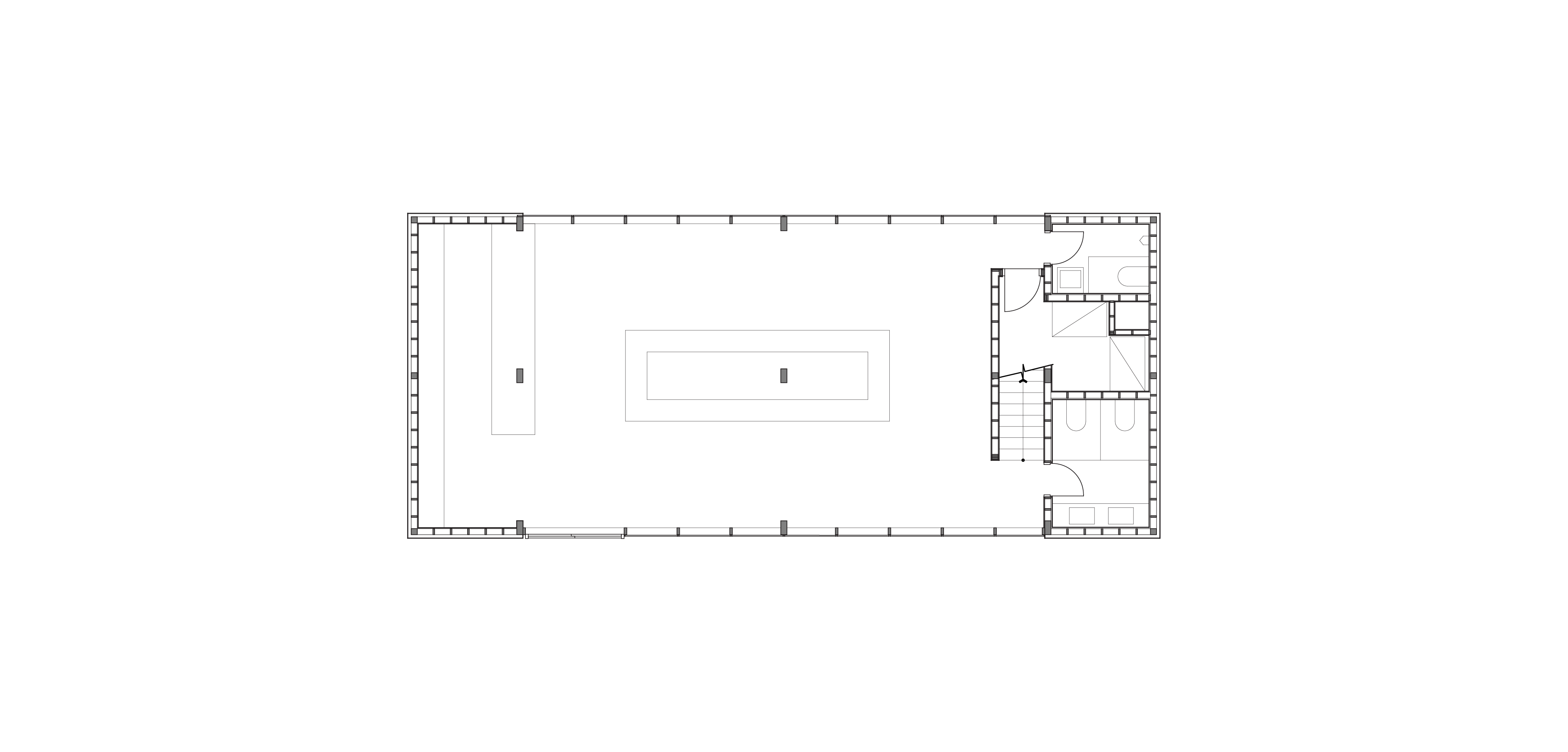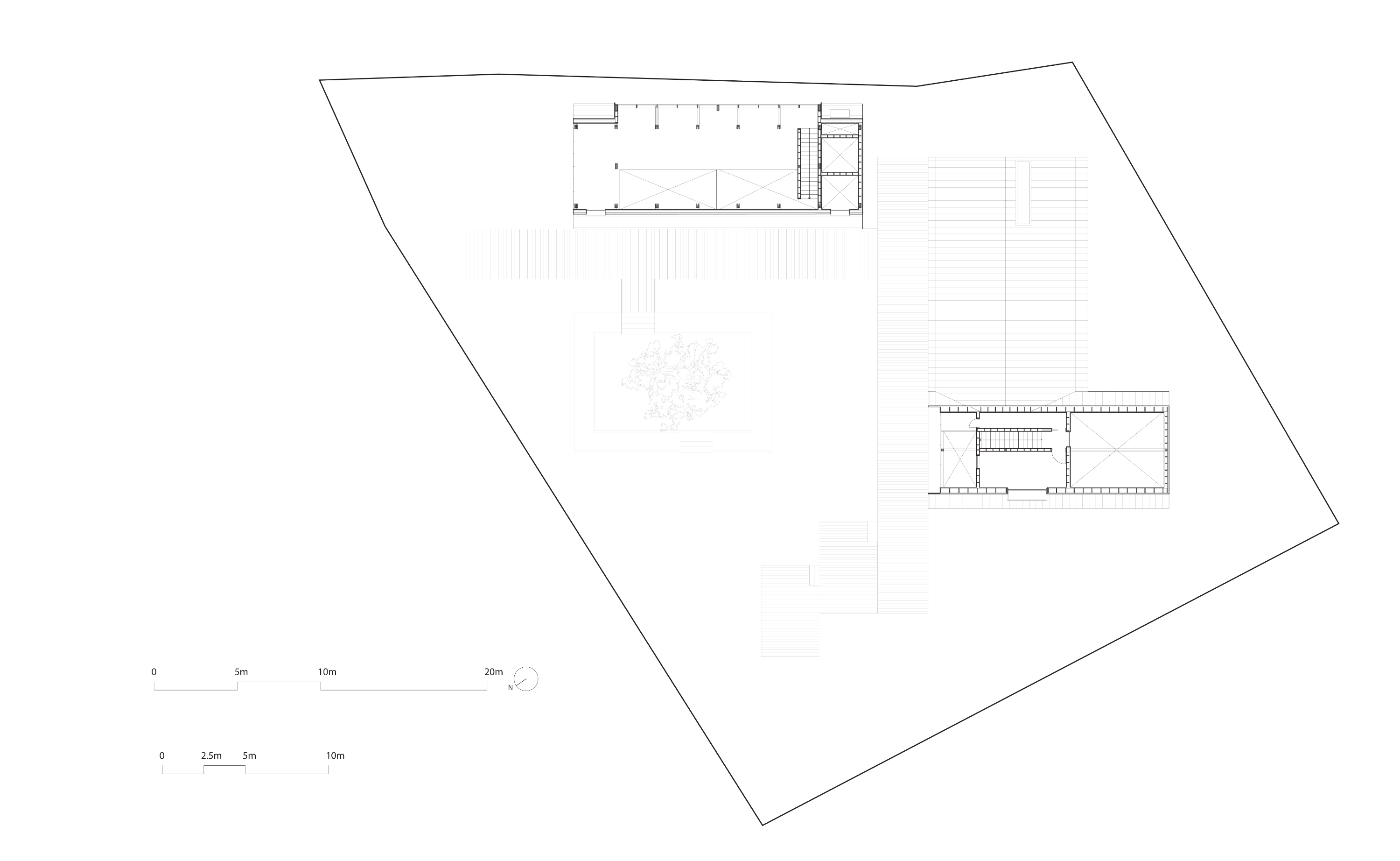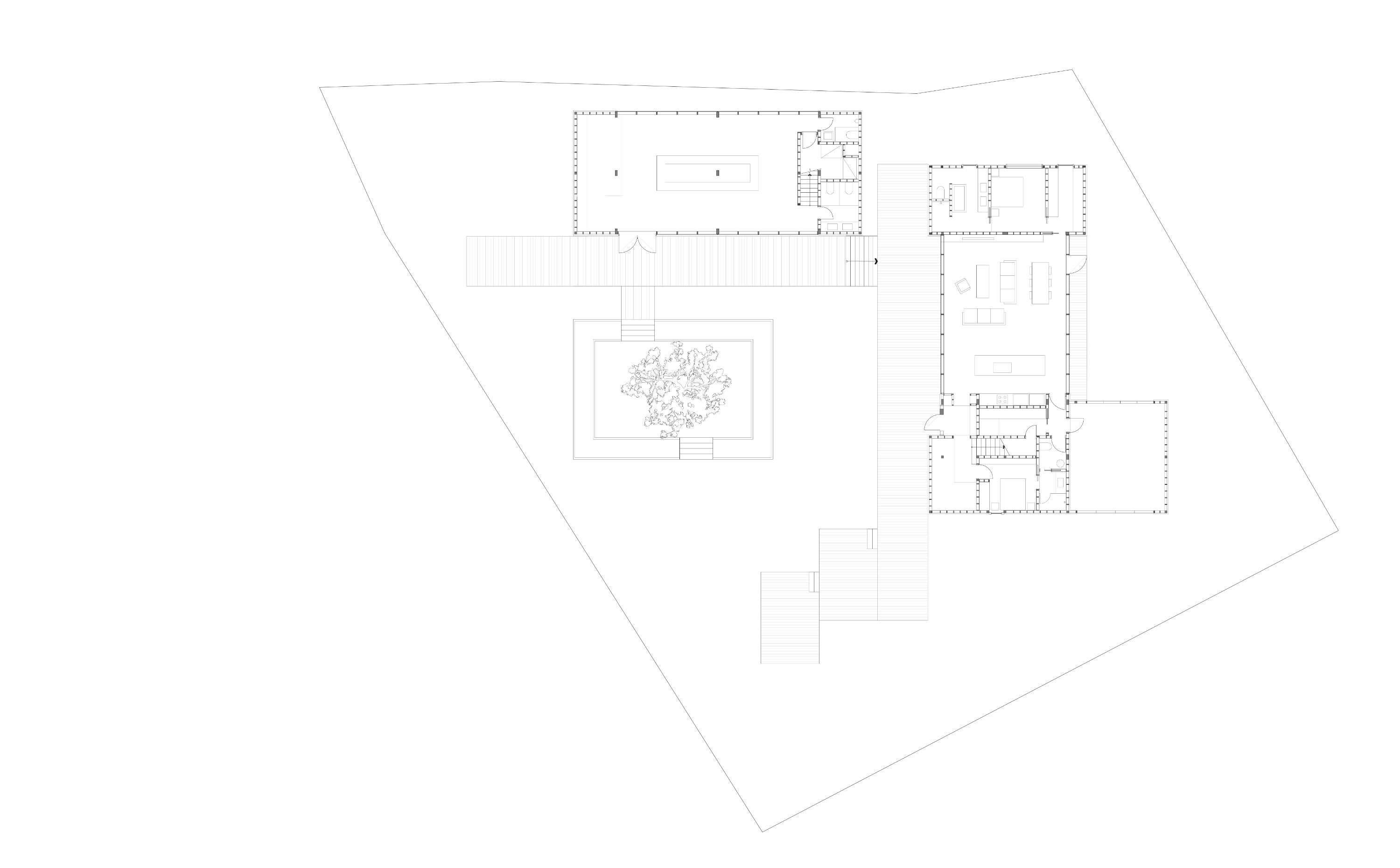 평면 구성은 단순하지만 명료하다. 카페동은 이용 공간과 지원 공간을 재료와 투명도의 대비로 구분했고, 숙박동은 중앙의 투명한 LDK 공간을 중심으로 좌우 대칭으로 숙박 영역을 배치했다. 마스터룸은 숲을 향해 드레스룸–침실–욕실로 이어지며 천장 높이가 점진적으로 변화한다. 최종 공간인 욕실에는 4m 높이의 천창을 두어 빛이 깊숙이 스며들도록 했다. 반대편 숙박 영역은 7m의 높은 천장과 실내 정원을 통해 자연광을 들이며, 각 공간은 빛, 높이, 재료의 밀도를 달리하며 숲의 리듬에 반응한다.