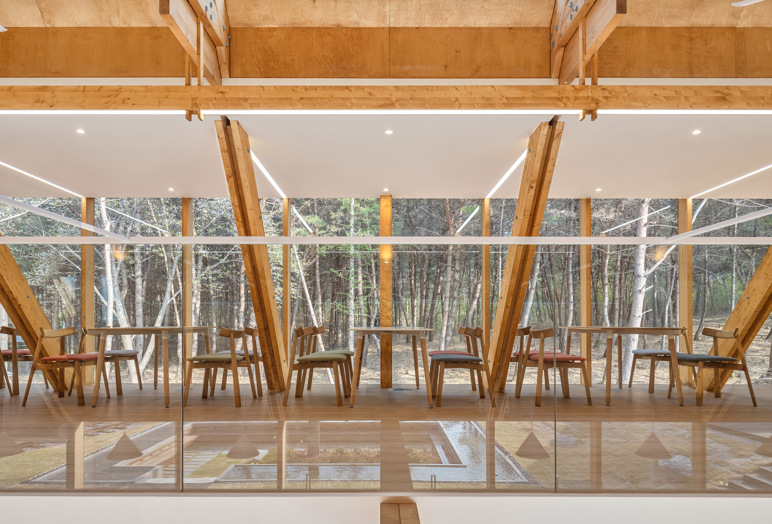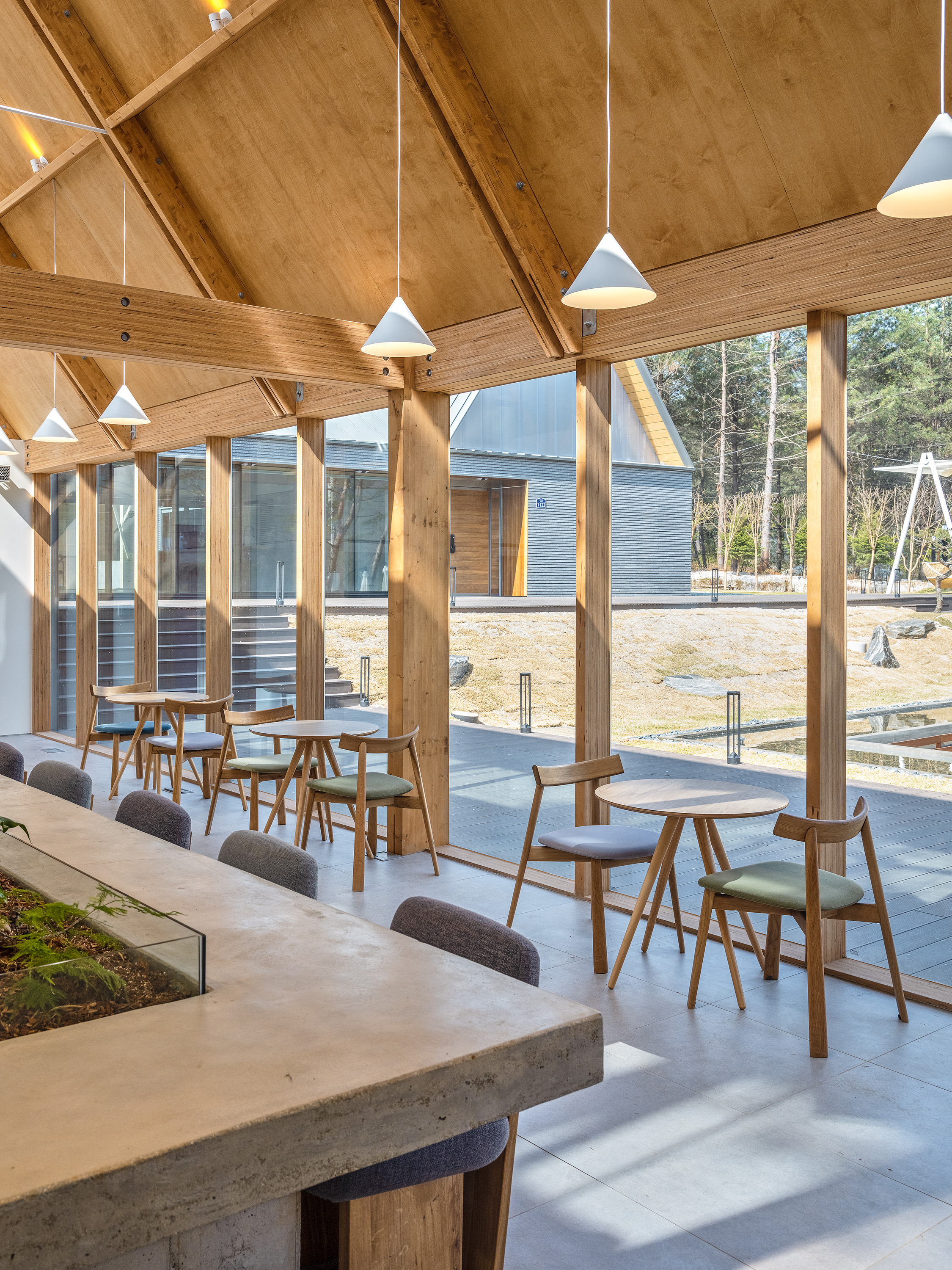 자연의 거칠고 불규칙한 질감과 대비를 이루기 위해 외형은 단순하고 기하학적인 면으로 구성되었다. 정밀한 비례와 형태를 구현하기 위해 공장 선가공(pre-cut) 부재를 활용했으며, 카페동의 8개 A-트러스는 20피트 길이의 표준 목구조 규격을 그대로 적용해 제작되었다. 트러스 간격은 4x8 합판 모듈(8피트, 2,440mm)을 기준으로 하여, 그 사이마다 이용자의 테이블을 두어 구조의 리듬을 직접 경험할 수 있게 했다.