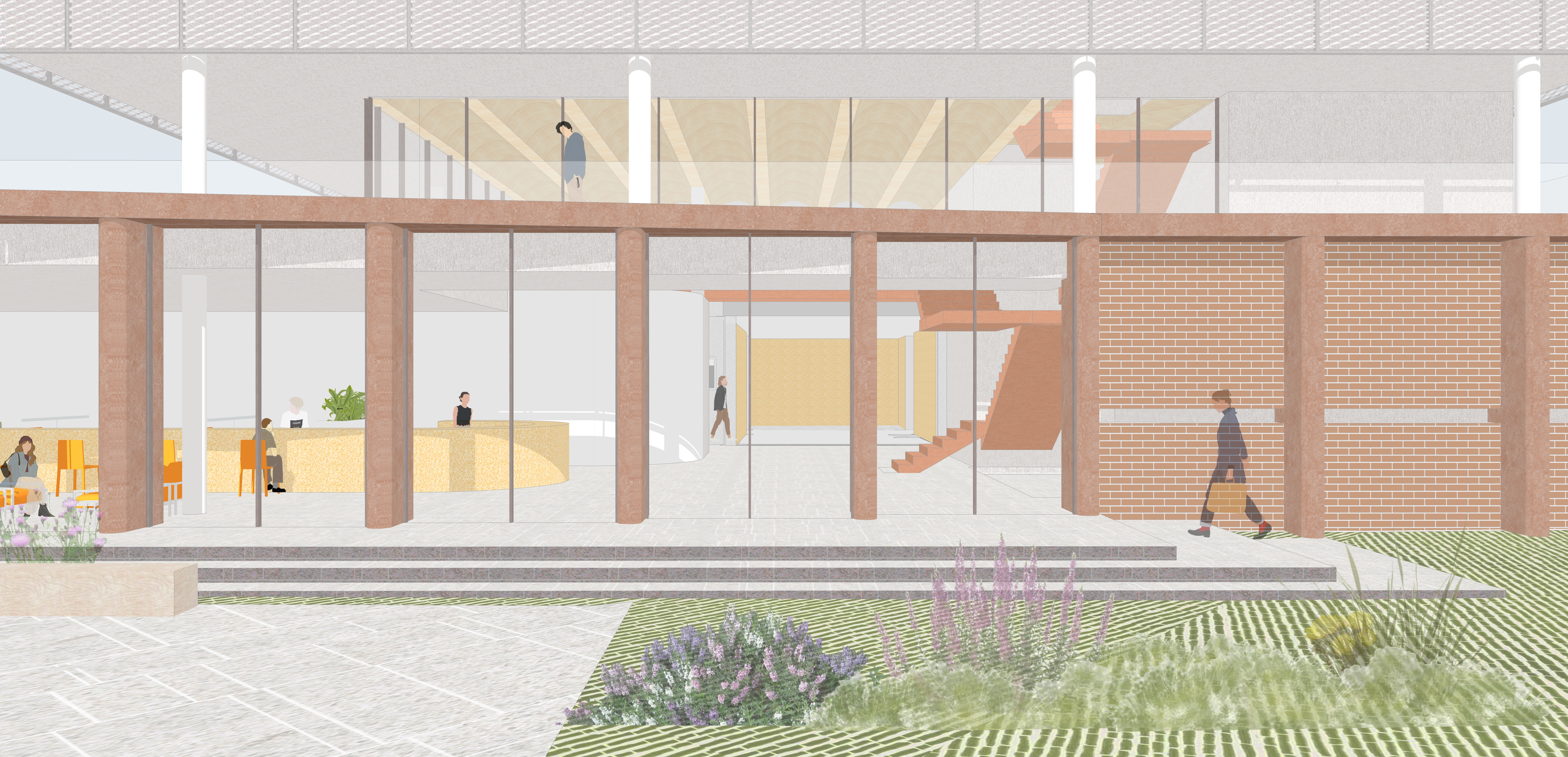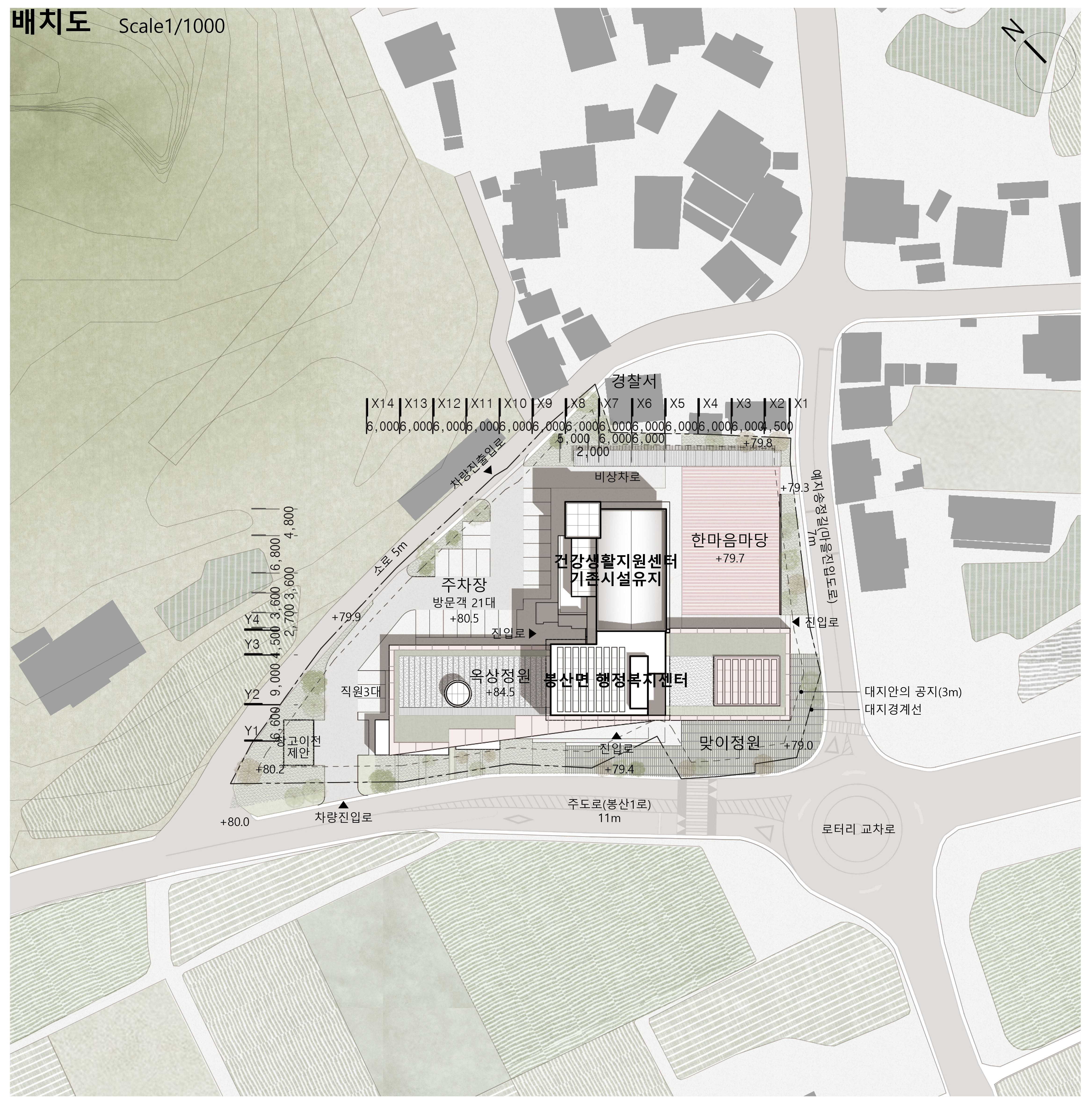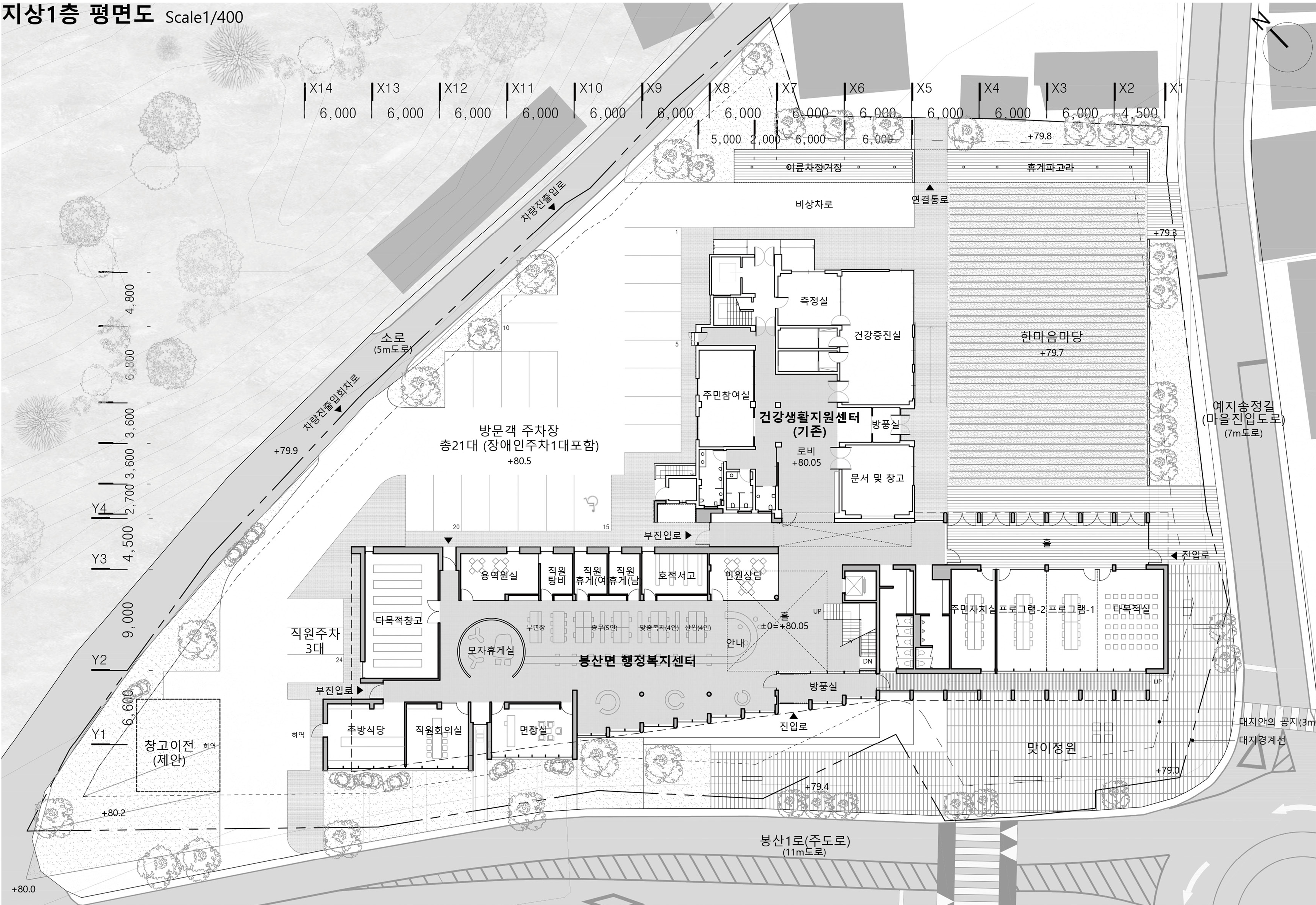 봉산면은 넓은 행정구역 내에 여러 마을이 군집을 이루며 낮은 밀도로 분산되어 있다. 로터리는 이러한 마을들을 연결하는 가로 체계의 주요 결절점으로 기능한다. 건축은 이 연결가로를 향해 명확한 정면성을 부여하고, 기존 건축의 질서를 수용하는 명료한 프로그램 구성으로 계획되었다. 전략적으로 배치된 ‘한마음마당’을 중심으로, 행정과 복지의 역할을 넘어 지역의 일상과 활동을 담는 생활 플랫폼으로 자리한다.