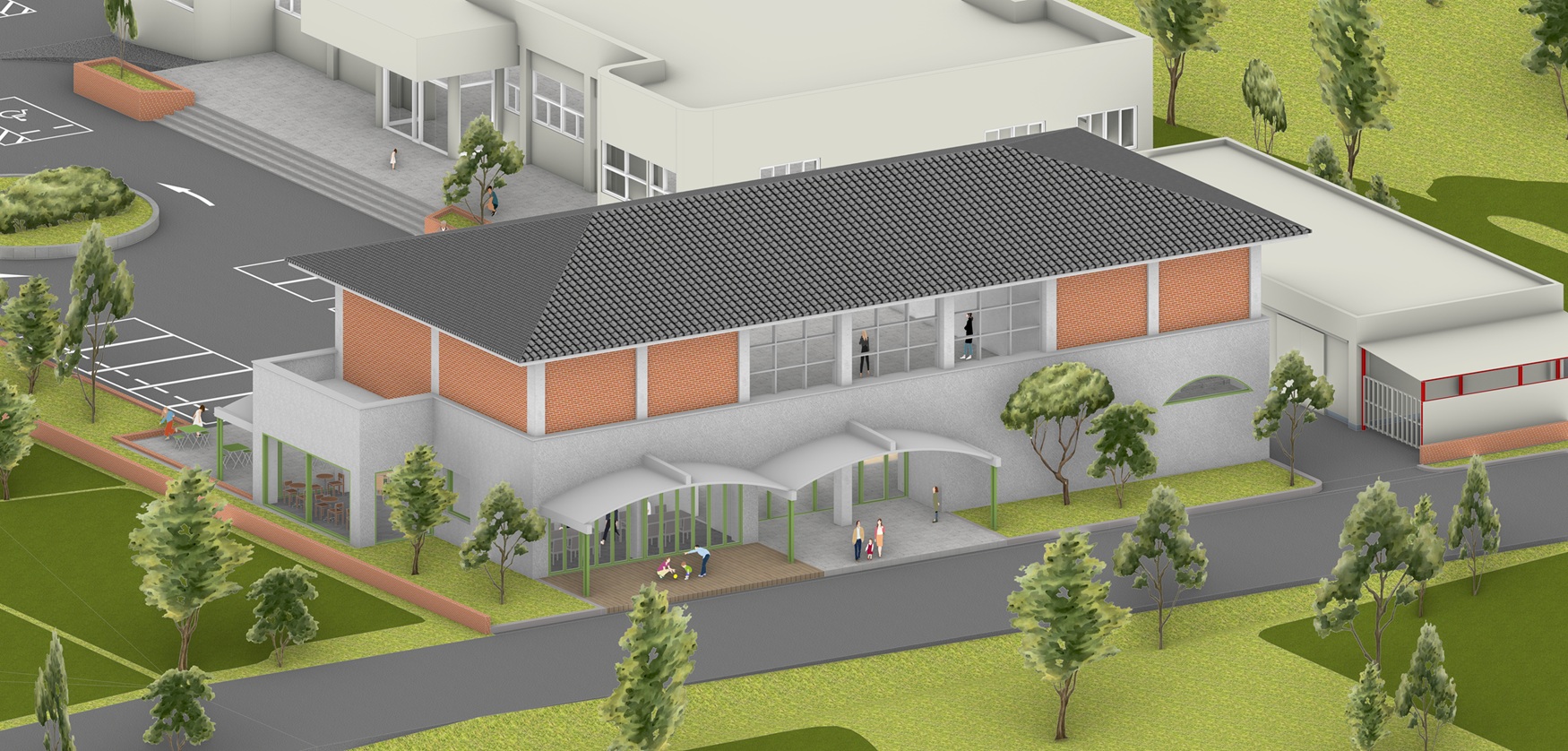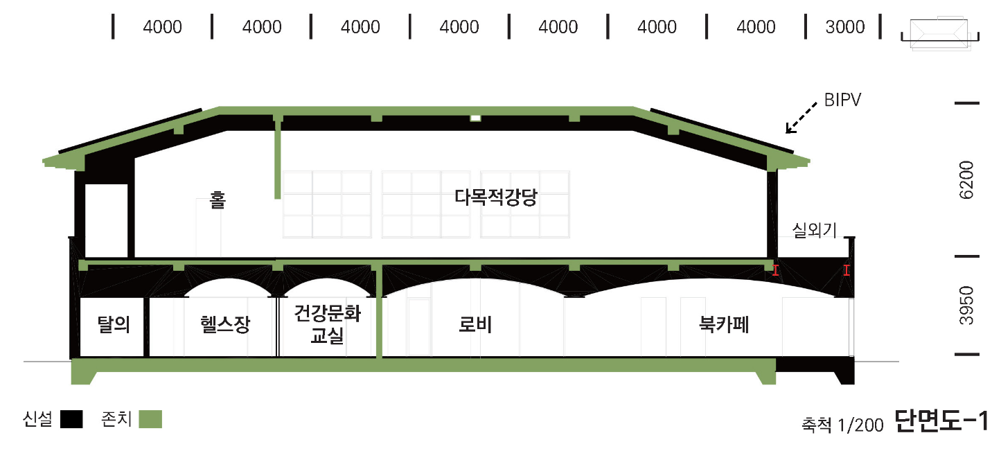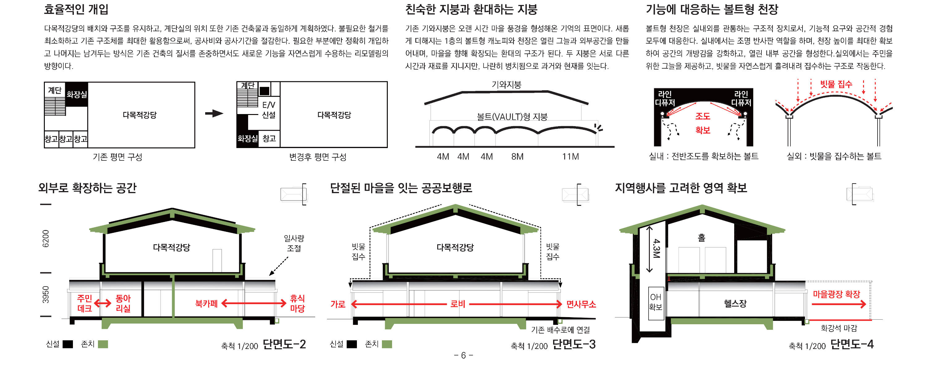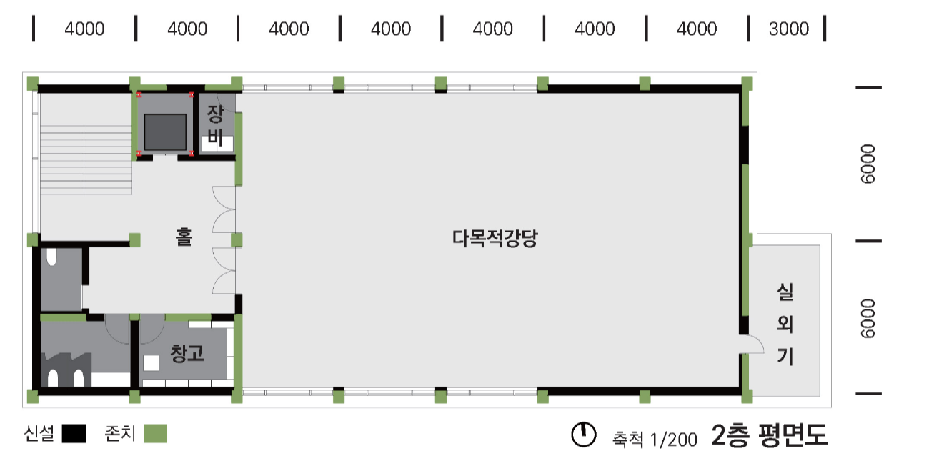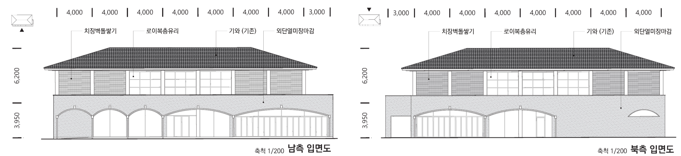 기존 구조체를 최대한 유지하면서 기능적으로 필요한 부분만 보강하고, 기존 기능이 그대로 유지되는 2층의 입면은 주민들에게 익숙한 기와지붕과 벽돌의 입면을 그대로 남겨놓는다. 새로조성되는 1층은 도로와 광장을 향해 열린 공간으로 계획하여 익숙함 위에 새로운 인상을 더한다. 이러한 ‘겹쳐 쓰기’의 전략을 통해 이전의 건축이 남긴 구조와 재료 위에 오늘의 사용성과 감각이 얹히며, 시간의 층위가 중첩된다. 그 결과 복지회관은 낡은 건물이 아닌, 마을의 과거와 현재가 공존하는 장소로 다시 살아난다. 진성면 기초생활거점은 기존의 기억들을 해체하지 않고 그 위에 새로운 시간을 쌓는다.