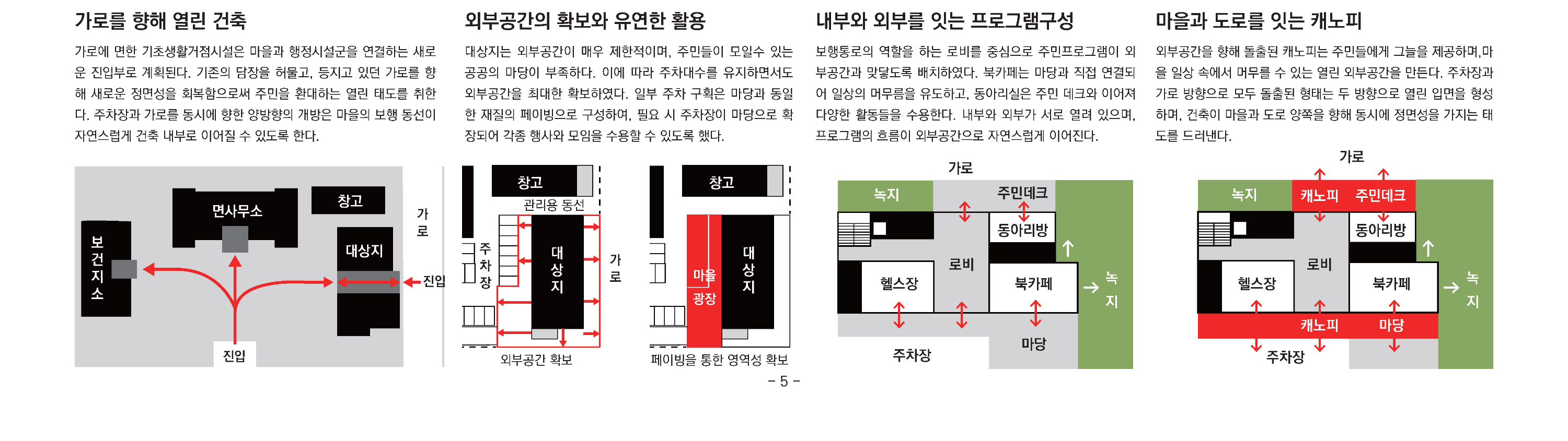 대상지의 주차장은 오래전부터 주민들이 김장행사, 봉사활동, 작은 축제 등을 열던 마을 광장으로 사용되어 왔다. 우리는 이 광장의 잠재력을 건축의 내부로 끌어들여, 공간의 경계를 유연하게 확장하는 구조를 제안한다. 기초생활거점시설 내부의 프로그램들은 공공보행로 역할을 하는 중앙 홀을 중심으로, 외부 마당과 자연스럽게 연결되며, 주민들의 일상과 특별한 마을 행사 시 외부공간을 유연하게 활용할 수 있도록 구성된다.
