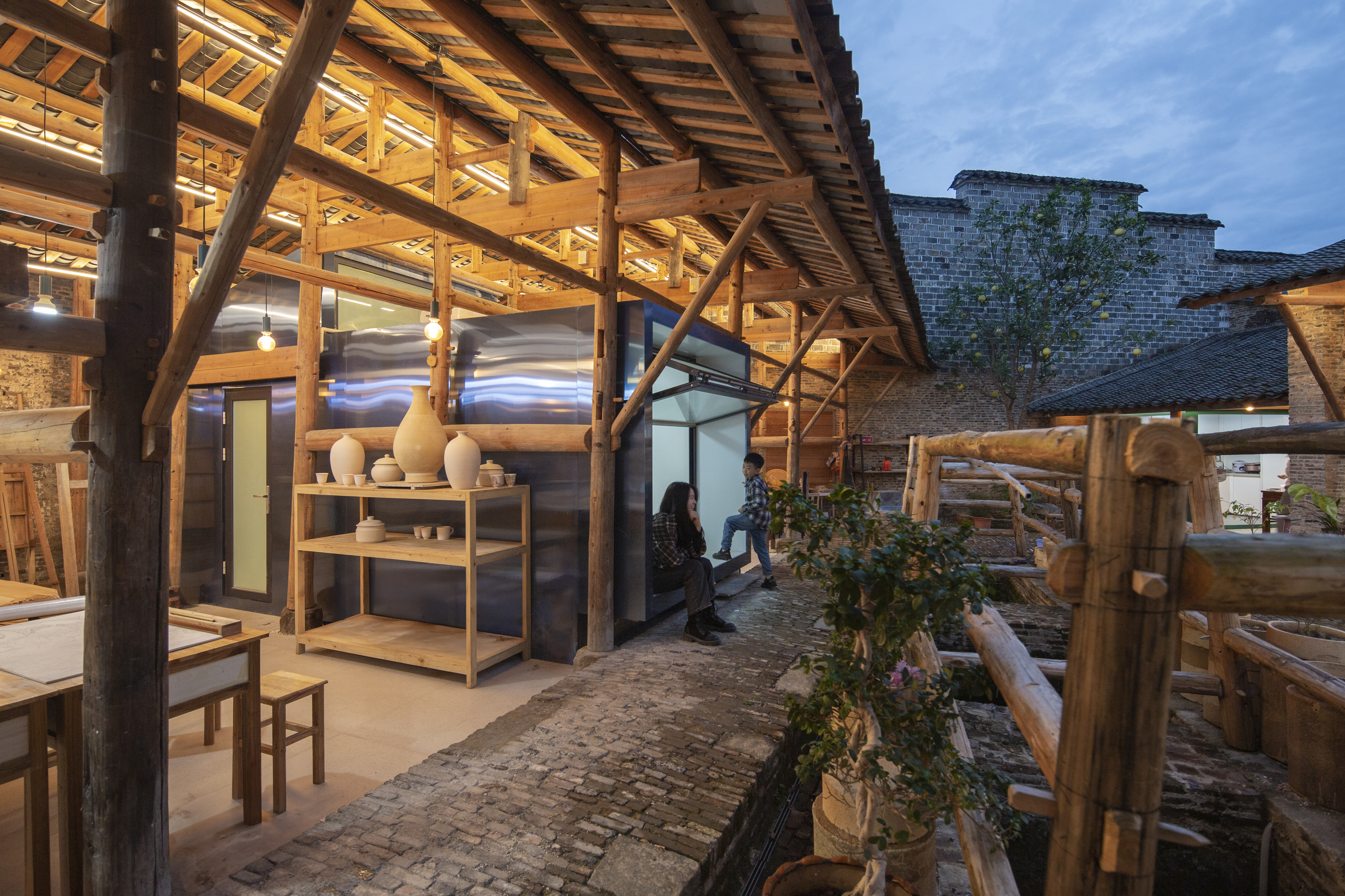 이 프로젝트는 ‘플러그인 아키텍처’ 개념을 통해 오랫동안 방치된 도자기 공방을 현대의 주거·작업 공간으로 재활성화하는 시도다. 동시에 기존 건축의 목구조, 벽돌, 기와지붕 등 원형의 물질적 특징과 공간 논리를 유지한다. 거대한 공공 건축 중심의 1단계와 달리, 이번 단계는 골목 단위의 작은 마당과 목조 공방으로 시선을 돌려, 도자 생산의 일상적 기반을 복원하는 데 초점을 맞췄다.