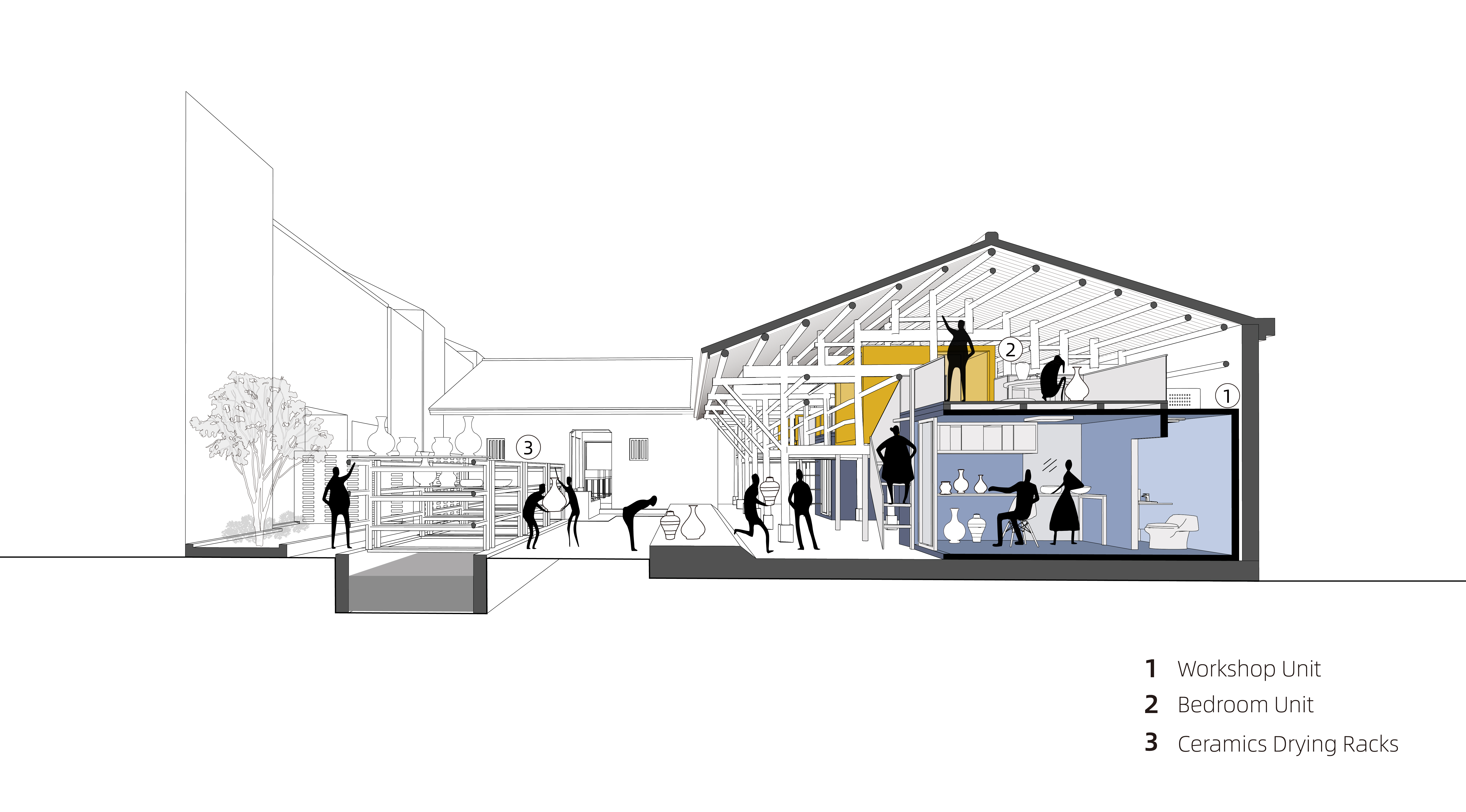 C34 마당에는 두 개의 공방과 두 개의 작은 주택이 삼각형 대지 안에 놓여 있으며, 세 명의 작가가 거주한다. 한 동은 공용 주방, 나머지는 개별 플러그인 유닛(침실·작업실·욕실 결합형)으로 구성된다. 경사지붕과 HVAC 시스템은 일사량과 기후에 따라 유기적으로 반응한다. H20 마당은 단독 작가를 위한 스튜디오로, 복층 침실과 유연한 작업공간, 그리고 마당으로 열리는 가동형 파사드가 특징이다. P58 마당은 길게 이어진 공방 안에 세 개의 작가 스튜디오가 병렬 배치되어 있으며, 각 유닛은 1층 사무공간 + 상부 로프트형 침실로 구성된다. 인접 건물은 지그재그 평면의 공용 갤러리 및 커뮤니티 공간으로 재구성되어 개방성과 사적 영역의 균형을 이룬다. 양화골에서는 신축 카페 건물이 세 개의 역사적 공방과 ㄱ자형 주택으로 둘러싸인 마당을 중심에 두고 있다. 다수의 플러그인 유닛이 공동 거주 및 협업형 프로그램을 지원하며, 역사 지구 내부에 소규모 창작 커뮤니티를 형성한다.