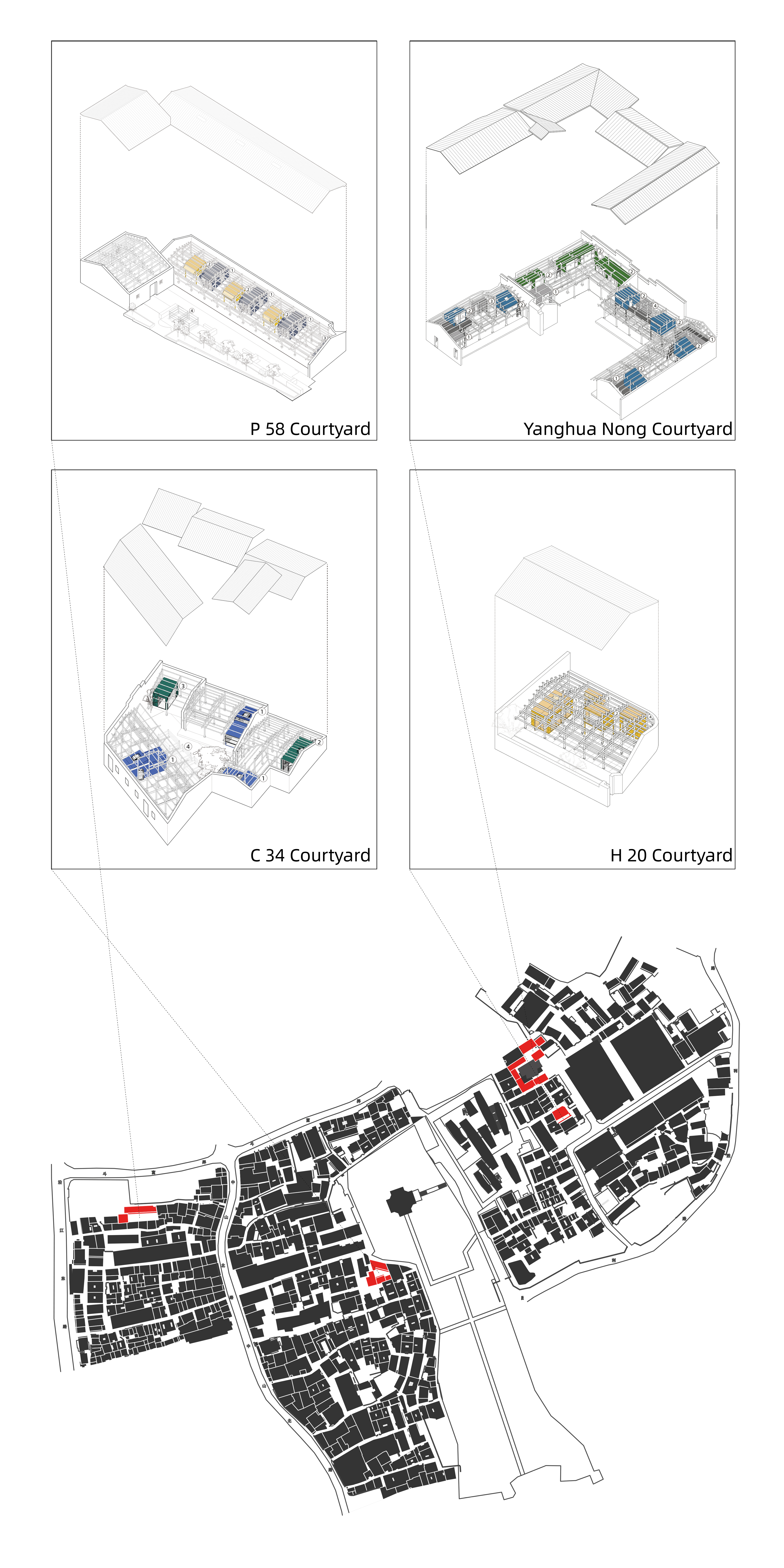C34 마당에는 두 개의 공방과 두 개의 작은 주택이 삼각형 대지 안에 놓여 있으며, 세 명의 작가가 거주한다. 한 동은 공용 주방, 나머지는 개별 플러그인 유닛(침실·작업실·욕실 결합형)으로 구성된다. 경사지붕과 HVAC 시스템은 일사량과 기후에 따라 유기적으로 반응한다. H20 마당은 단독 작가를 위한 스튜디오로, 복층 침실과 유연한 작업공간, 그리고 마당으로 열리는 가동형 파사드가 특징이다. P58 마당은 길게 이어진 공방 안에 세 개의 작가 스튜디오가 병렬 배치되어 있으며, 각 유닛은 1층 사무공간 + 상부 로프트형 침실로 구성된다. 인접 건물은 지그재그 평면의 공용 갤러리 및 커뮤니티 공간으로 재구성되어 개방성과 사적 영역의 균형을 이룬다. 양화골에서는 신축 카페 건물이 세 개의 역사적 공방과 ㄱ자형 주택으로 둘러싸인 마당을 중심에 두고 있다. 다수의 플러그인 유닛이 공동 거주 및 협업형 프로그램을 지원하며, 역사 지구 내부에 소규모 창작 커뮤니티를 형성한다.