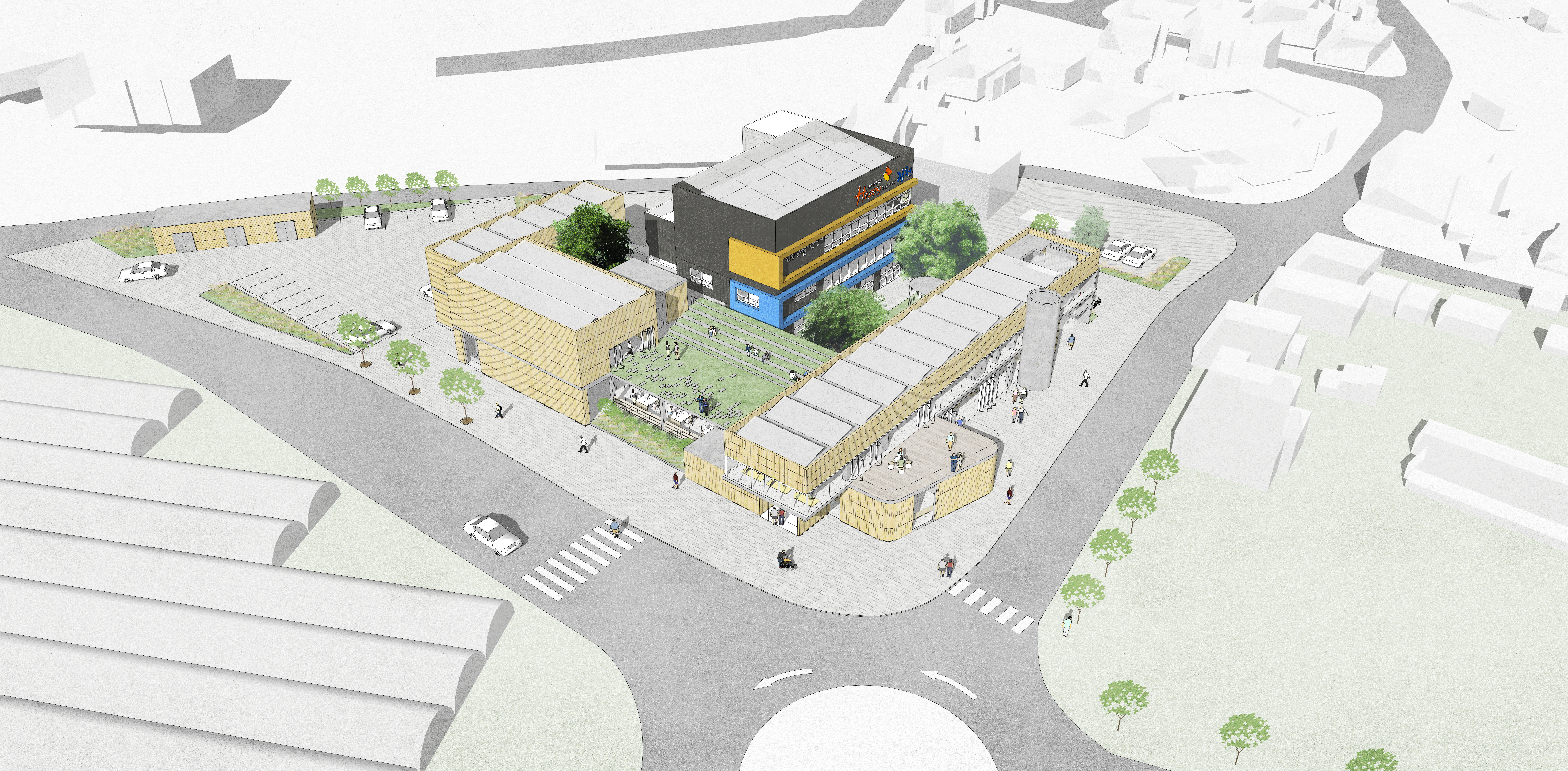 기존 부지여건은 넓은 대지 크기의 잠재성 발현없이 차량,보행 혼잡의 건조한 아스팔트 위 산발적 건물 군집으로만 되어 있어서, 주민의 일상이 유기적으로 스며드는 장소성까지 얻어내고 있지는 못한 편이다.