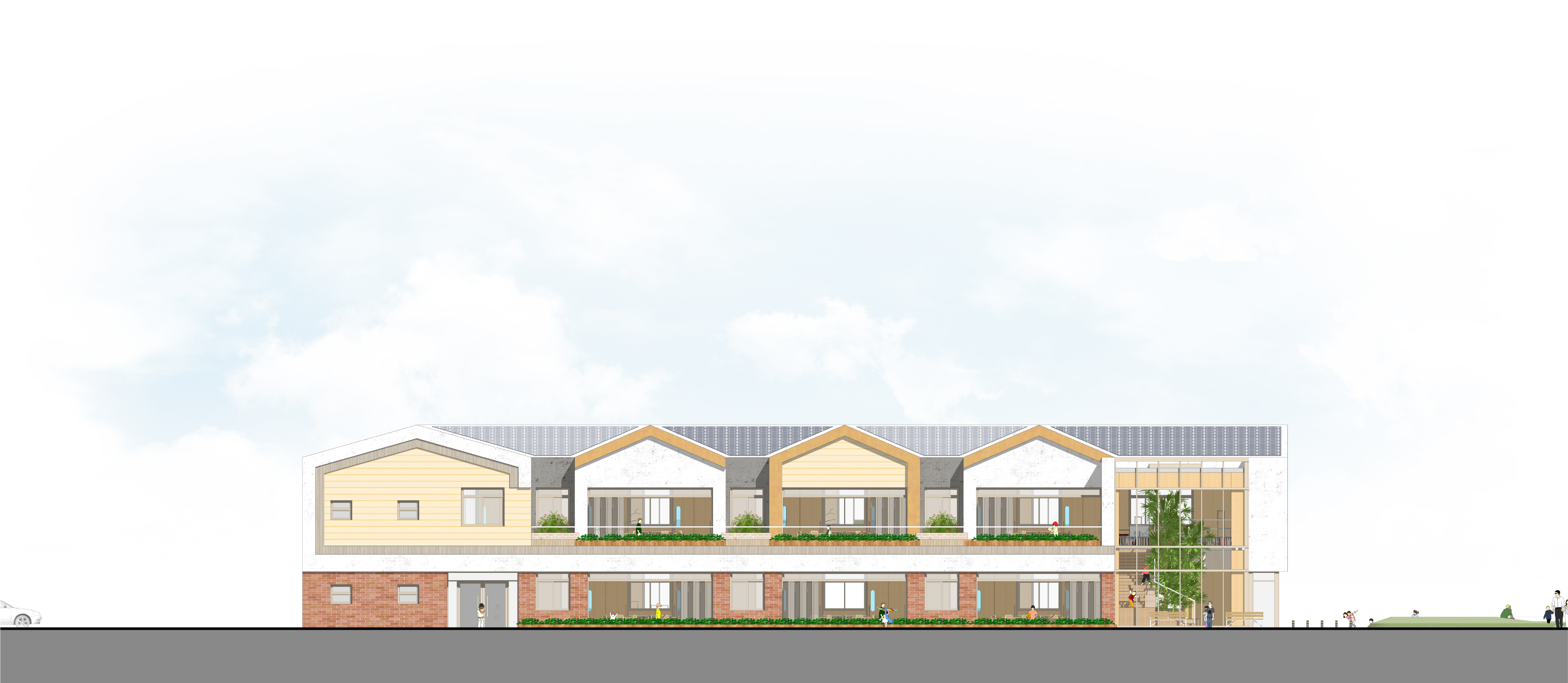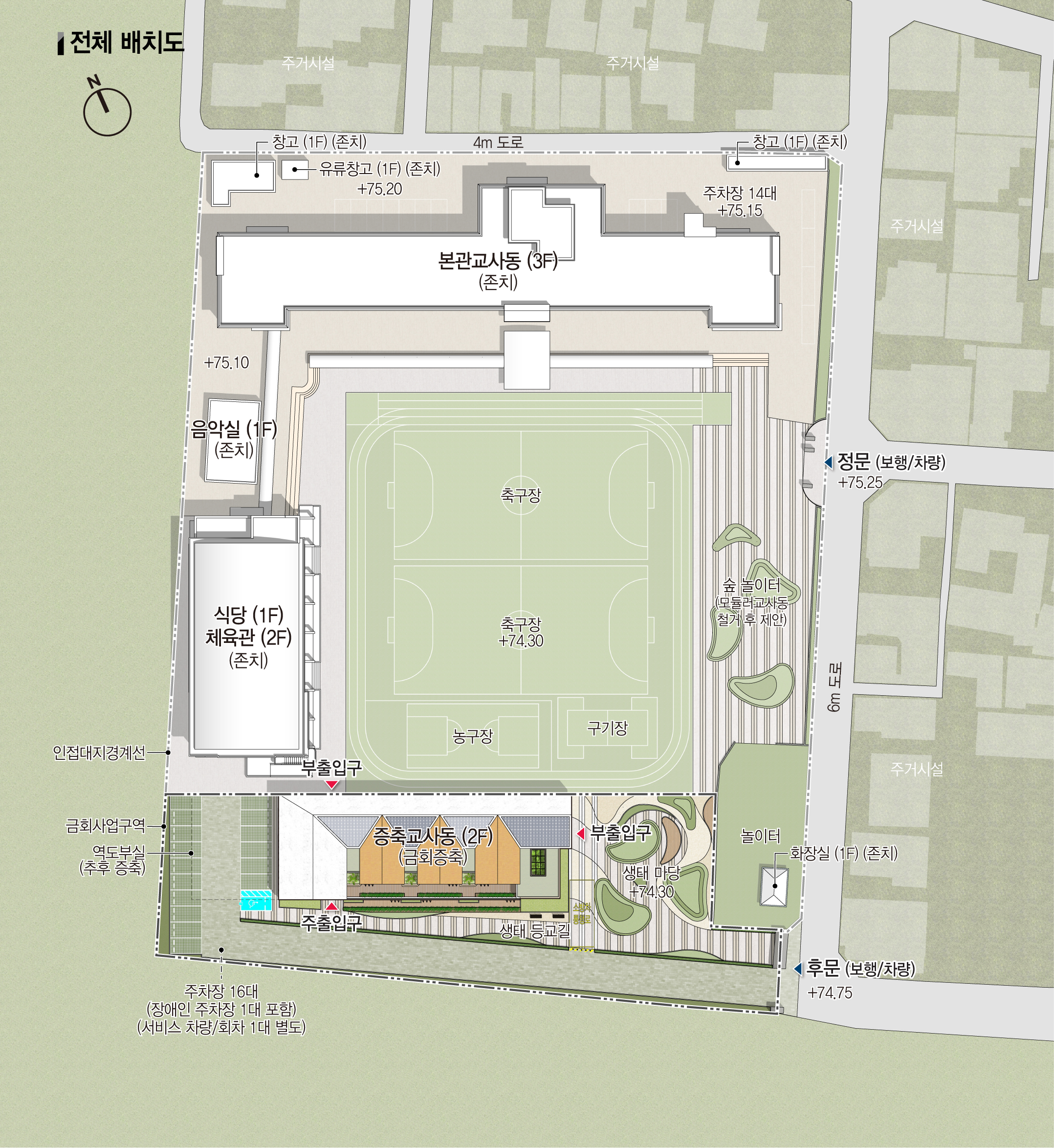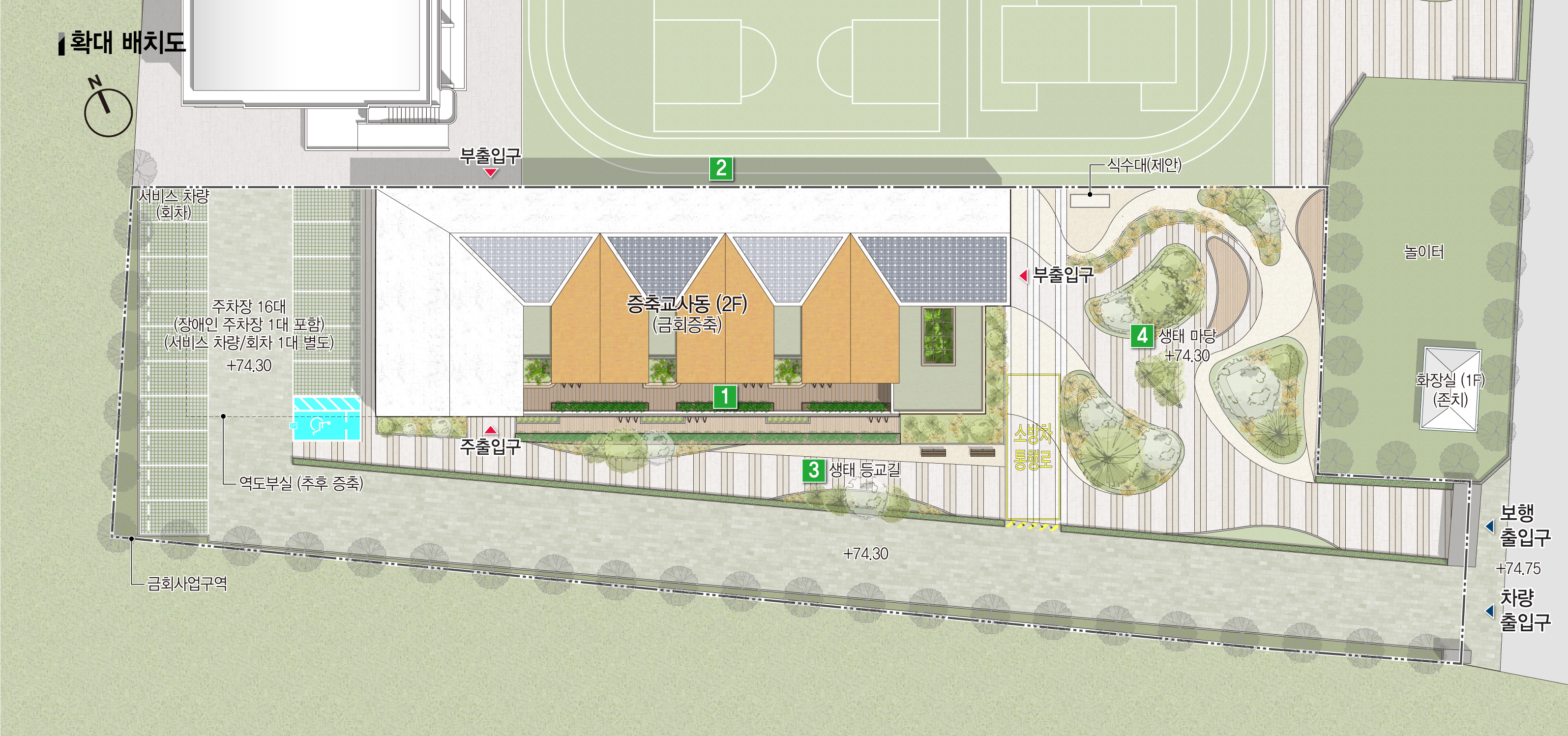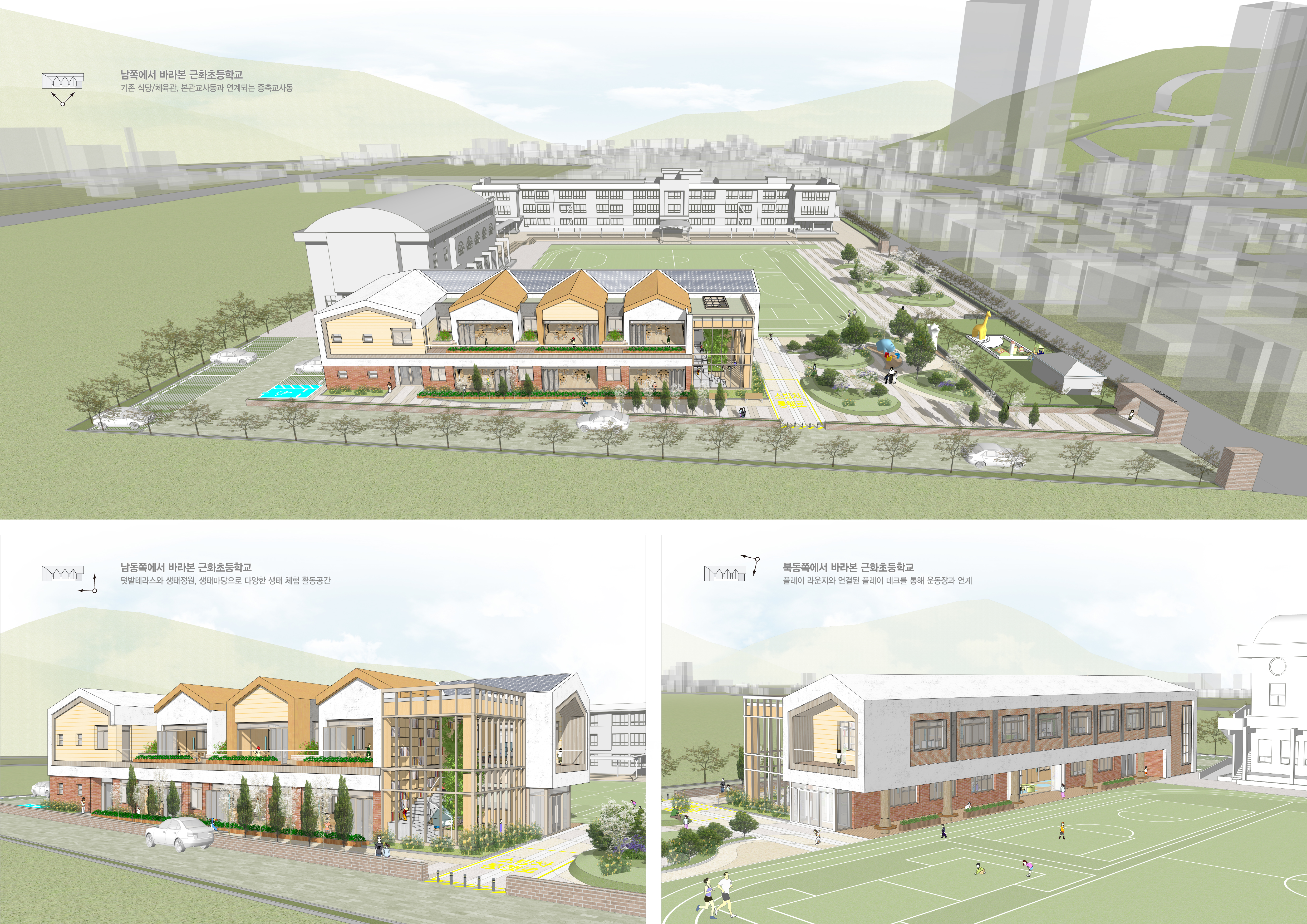 증축 건물은 기존 건물과의 조화와 연계를 고려하여 ‘ㄷ’자 배치로 설계하였고, 전체 교실을 남향으로 배치하여 일조 및 쾌적한 실내환경을 확보했습니다. 주차 및 보행 동선은 대상지 외곽과 내부로 명확히 보차분리하여 학생들의 안전을 최우선으로 고려하였으며, 공사 중에도 학습권과 통학안전이 확보되도록 단계별 공사계획을 병행하였습니다. 이 프로젝트는 텃밭이라는 단순한 자연 공간을 학교 건축과 학습환경 설계의 핵심 매개체로 삼아, 학생들에게 ‘배움’이 일상이 되고, ‘체험’이 공간이 되며, ‘성장’이 공간 속으로 펼쳐지도록 제안한 설계입니다.