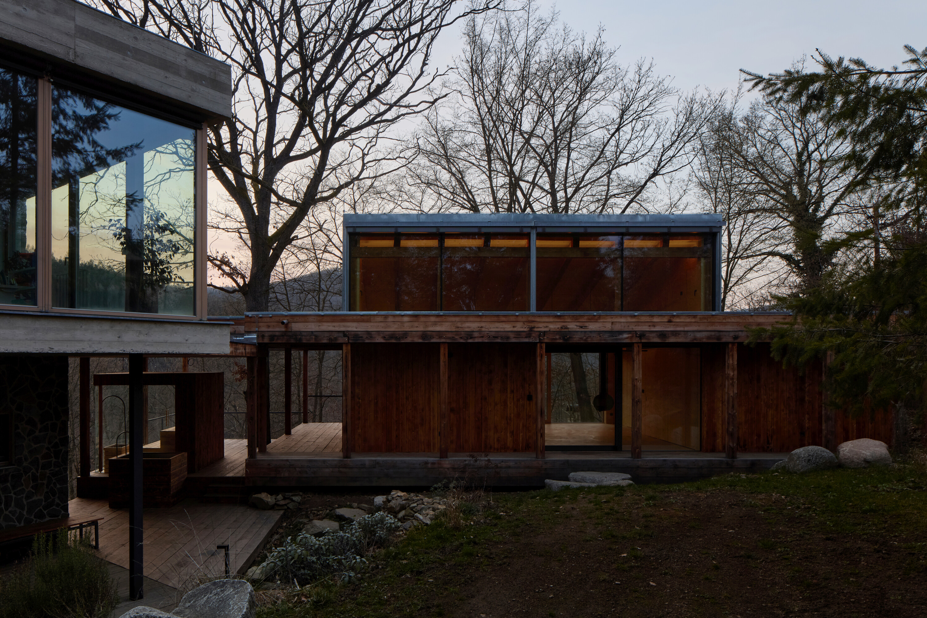부지의 형태와 지형, 자라난 나무들을 고려한 결과, 정원에서 바라보는 사자바 계곡과 메드니크산 정상의 조망을 유지하는 것이 중요했다. 이에 증축부는 숲과 정원의 경계에 별동 형태로 배치되었으며, 기존 주택과는 성숙한 참나무 한 그루를 품은 지붕이 있는 테라스로 연결되었다. 정원 방향으로는 덮개가 있는 보행 통로가 계획되었고, 건물은 미닫이창을 통해 테라스와 계곡 쪽으로 열리며, 반대편 모서리는 기존 건물과 맞닿도록 닫힌 형태로 배치되었다. 스튜디오 내부에는 단순한 매달린 갤러리가 삽입되어 있다. 증축부의 형태적 언어는 기존 주택의 맥락을 따르고 있다.