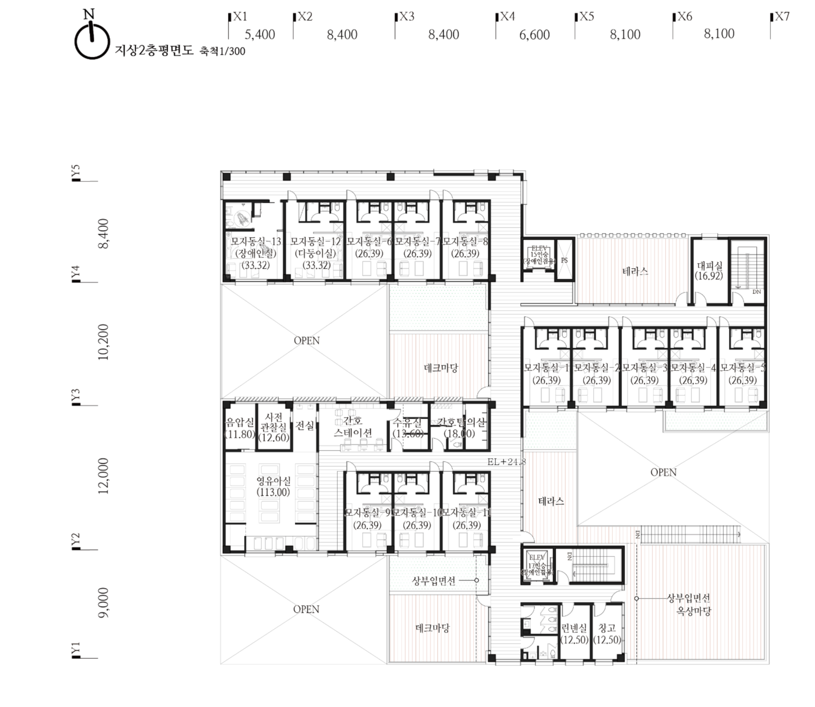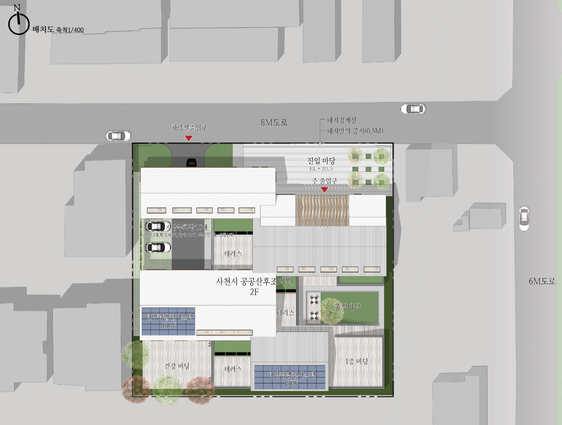 사람들은 오늘날의 크고 높은 도시보다 골목길 같은 작은 단위의 휴먼스케일에서 매력을 느낀다. 도로와 면한 진입광장은 마을과 산후조리원을 연결하고, 로비를 거쳐 중정마당과 연계되는 부분에서 단순히 비워진 곳이 아니라  여러가족들이 만나는 소통의 장으로 자리잡는다. 분절된 매스를 통해 채워짐과 비워짐이 반복되는 작은단위의 외부공간들은 휴먼스케일 만들고 공동체로서의 소통공간을 제시한다.