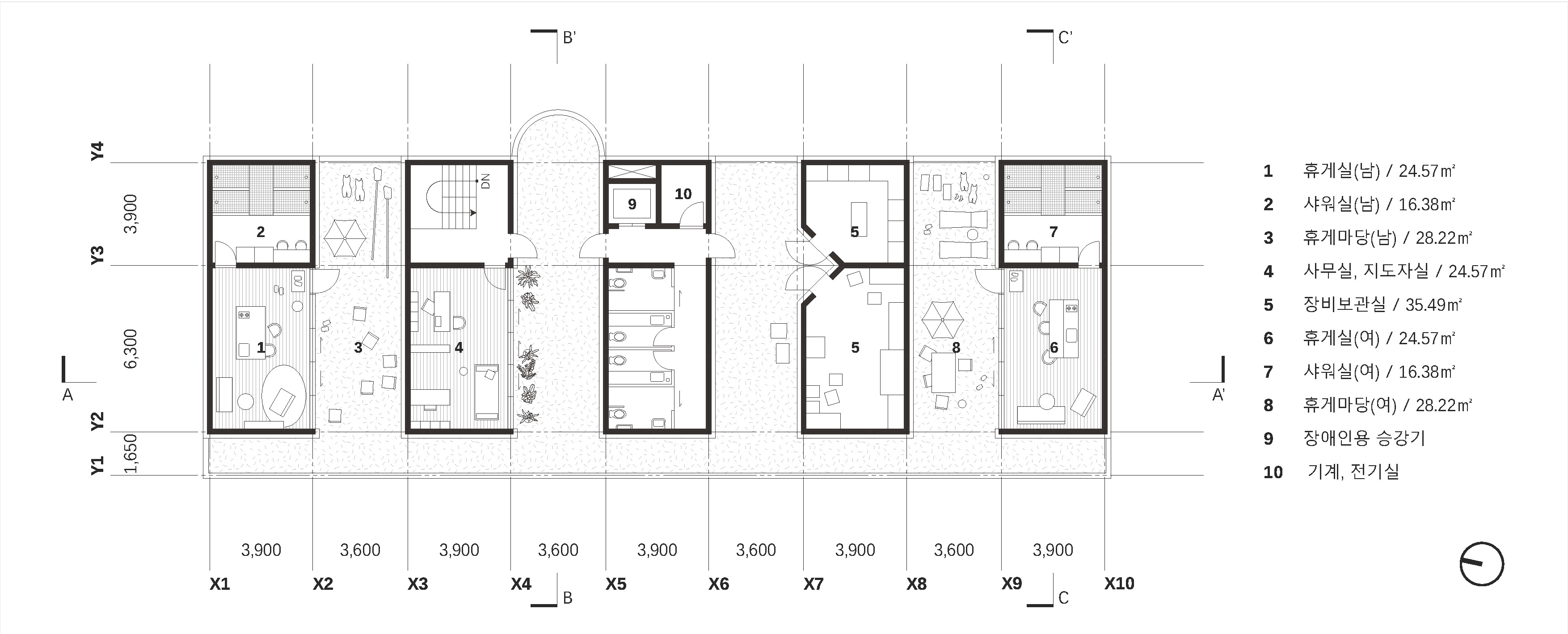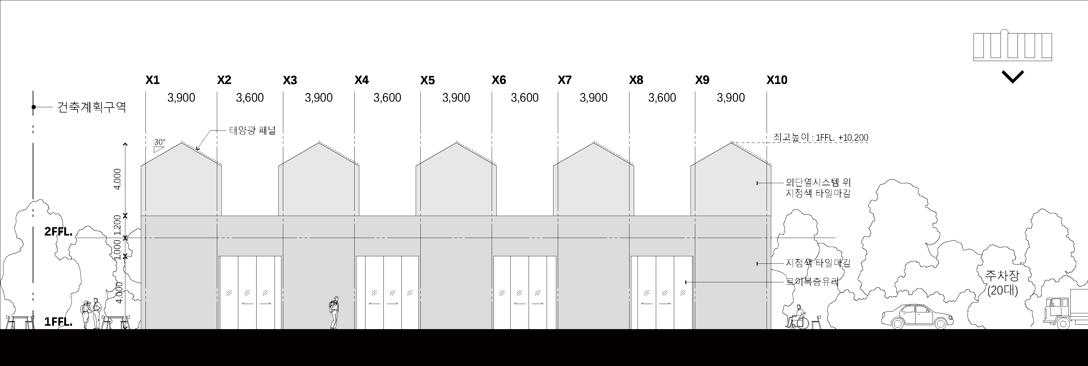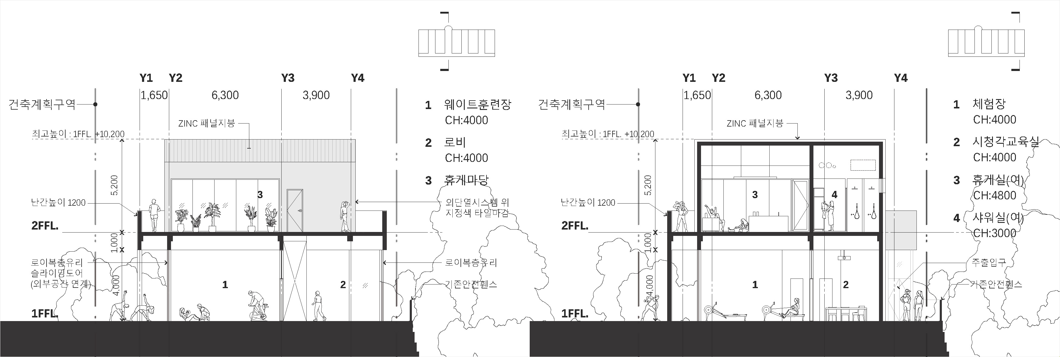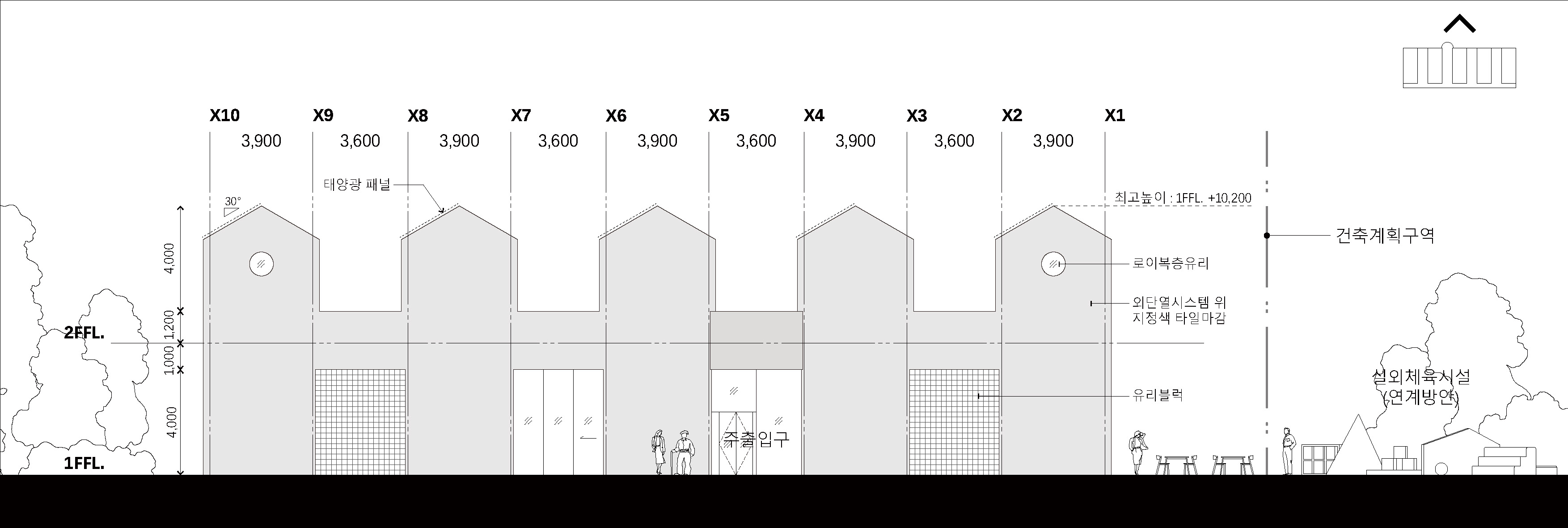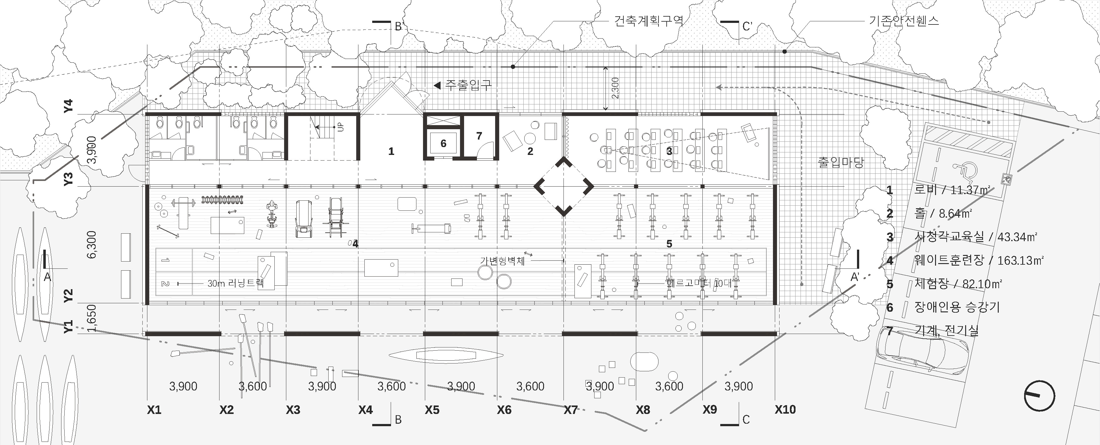 쪾제안하는 조정훈련장은 단순명료한 모듈형 구조를 통해 경제적이면서 효율적인 공간을 실현합니다. 1층은 철근콘크리트구조에 비내력벽을 두어 향후 공간 변화에도 유연하게 대응하며, 2층은 철골 박공지붕으로 계획되어 기능적이고 경제적일 뿐 아니라 진양호공원의 상징적인 풍경으로 시민들과 소통합니다. 또한 명료한 평면계획을 바탕으로 동선의 원활한 분리와 운영의 편의성을 동시에 확보합니다. 모든 공간은 무장애 설계로 계획되어 누구나 편안하게 이용할 수 있습니다.