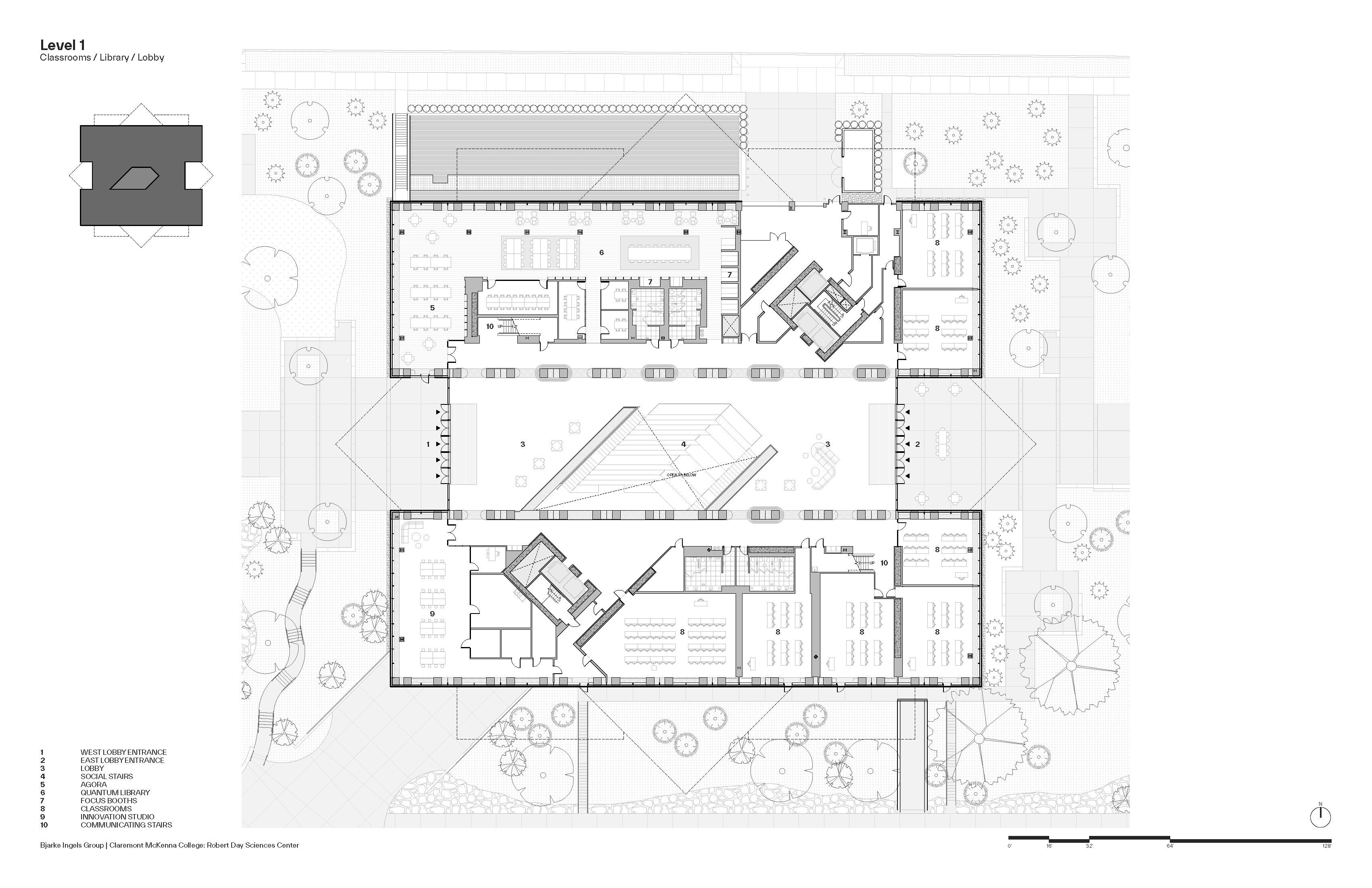 건물은 캠퍼스 동쪽 경계부, 나인스 스트리트와 클레어몬트 블루버드가 만나는 지점에 배치되어 동쪽 진입 관문 역할을 한다. 원형 지붕 아래 4.5m 높이로 떠 있는 대형 캐노피가 방문자를 맞이하며, 그 뒤로 천창으로 채광되는 다층 아트리움이 등장한다. 이 아트리움은 건물의 회전된 매스가 만들어낸 빈 공간으로, 모든 층에서 연구·교육 공간을 바로 들여다볼 수 있는 시각적 투명성을 확보한다.