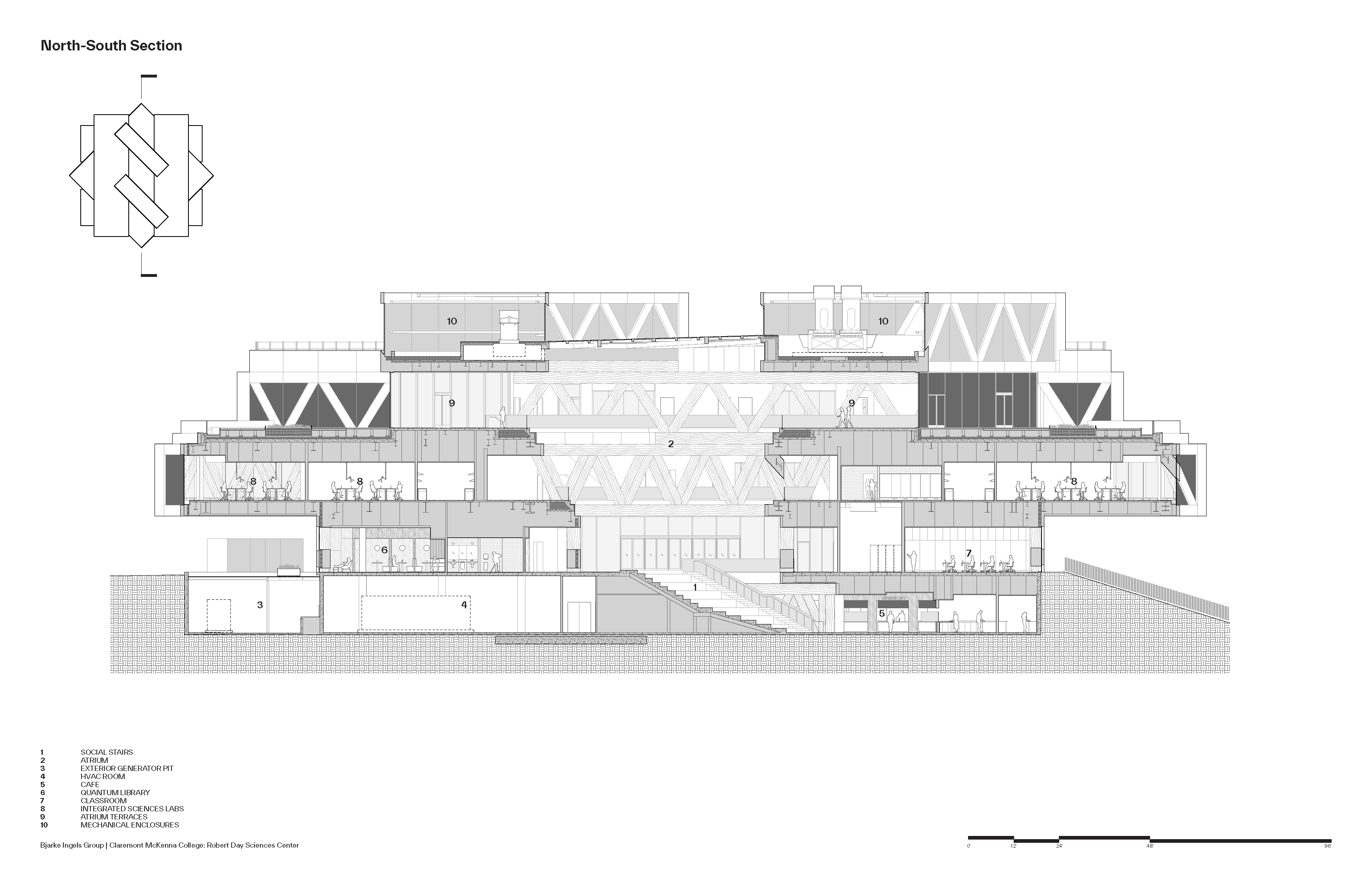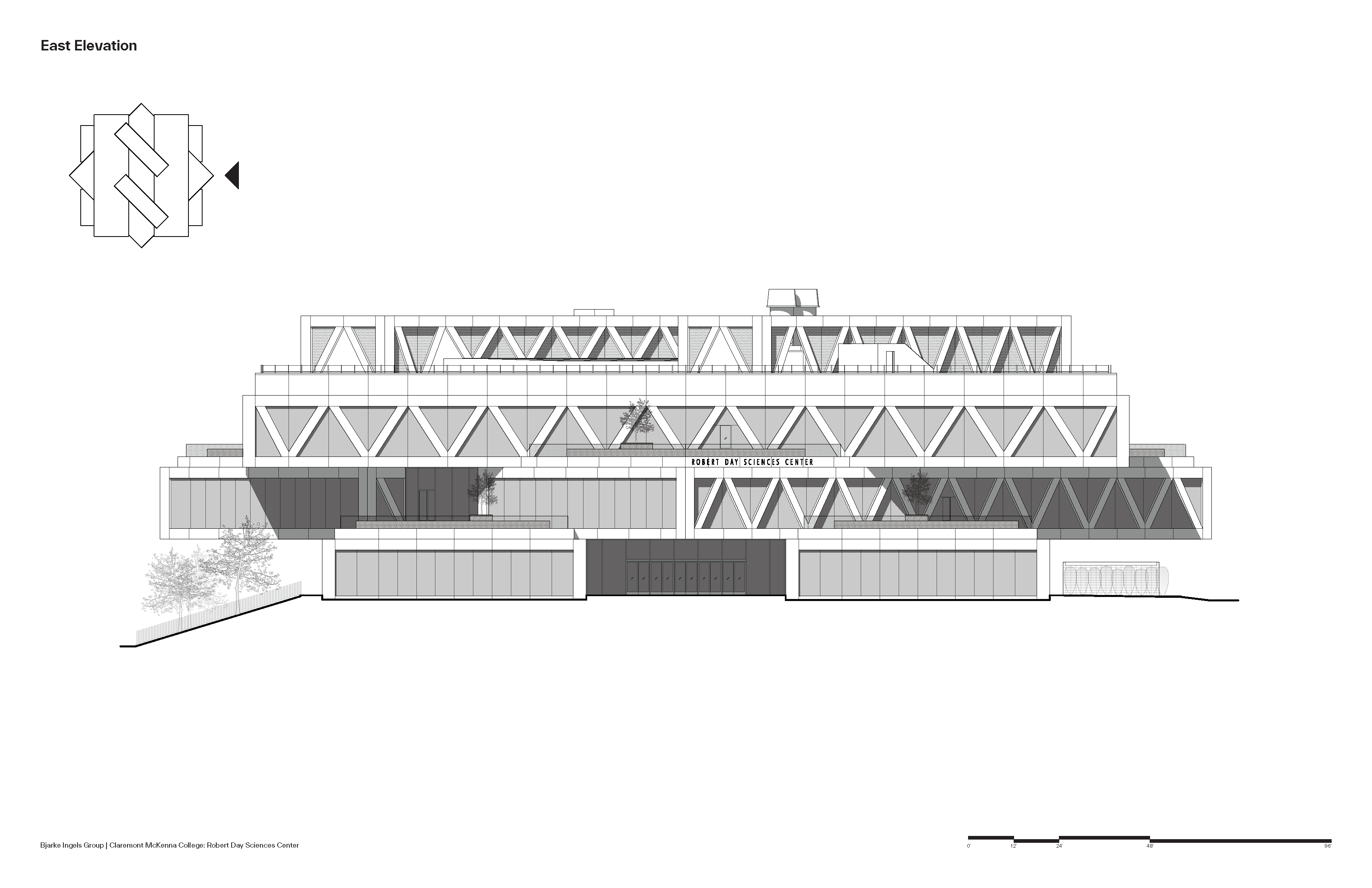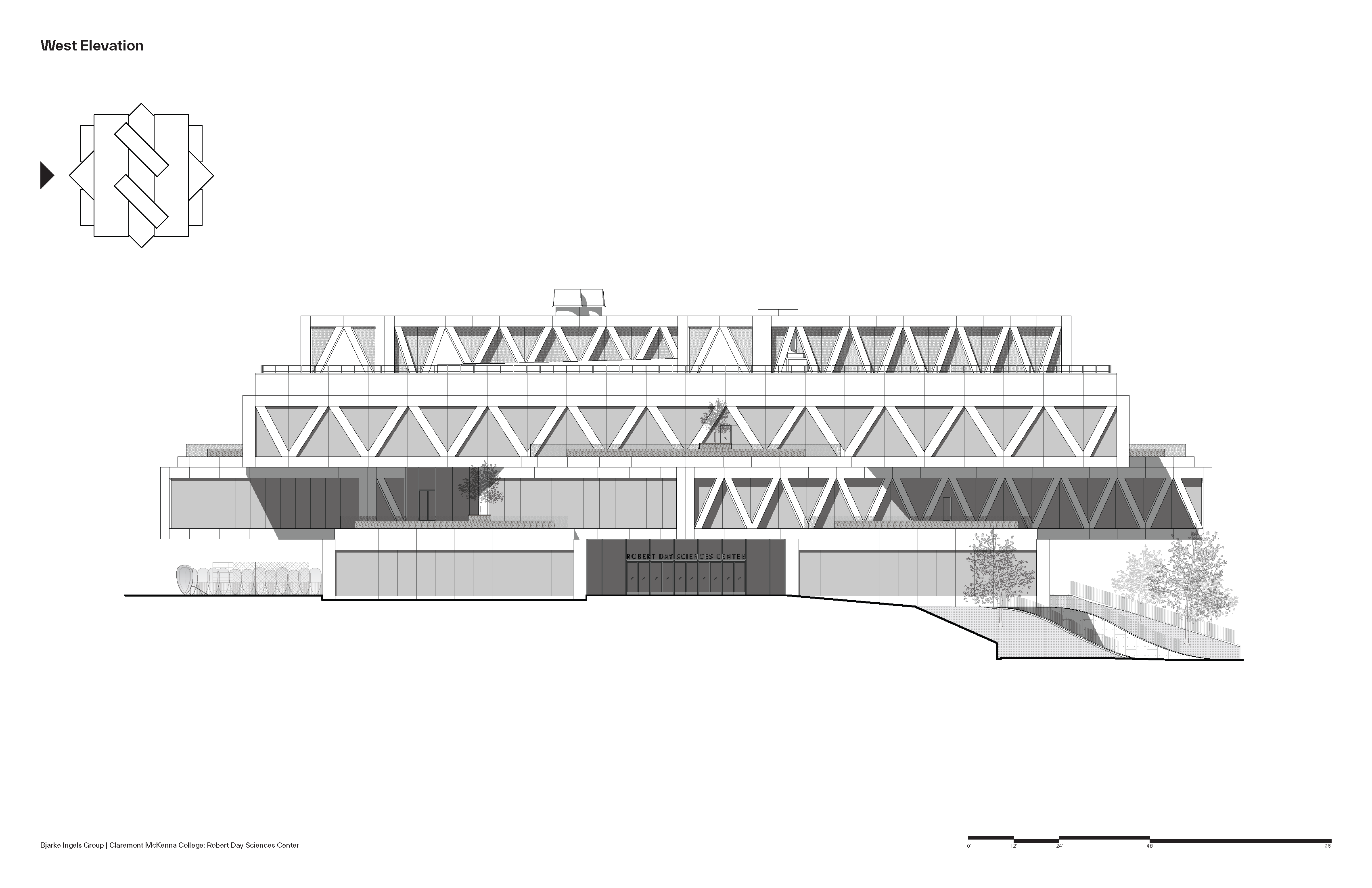 클레어몬트 맥케나 칼리지(Claremont McKenna College)의 새 과학관 로버트 데이 사이언스 센터(Robert Day Sciences Center)는 학문 간 통합과 교류를 극대화하는 방식으로 설계되었다. 12,500㎡ 규모의 이 건물은 각 층이 서로 다른 방향으로 회전한 형태로 쌓여 있어, 연구실·강의실·캠퍼스 외부를 오가는 동선과 시선이 입체적으로 교차한다. 2020년에 시작된 본 프로젝트는 약 1,400명의 학생을 위한 새로운 과학 교육의 허브로, BIG(비야르케 잉엘스 그룹)이 로스앤젤레스에서 완공한 첫 작품이자, CMC의 로버츠 캠퍼스 마스터플랜 가운데 가장 먼저 실현된 건축물이다.