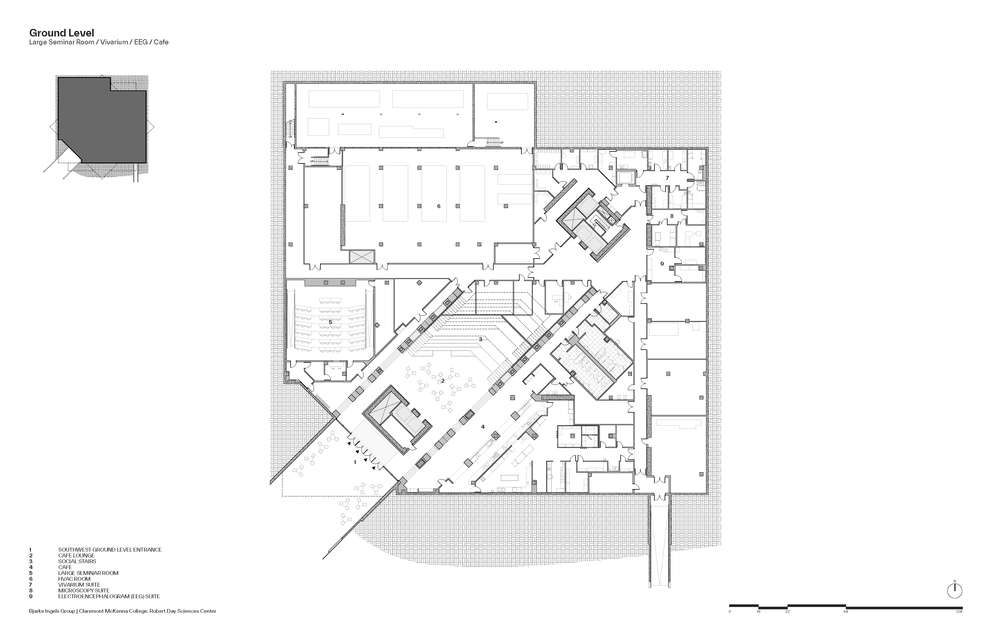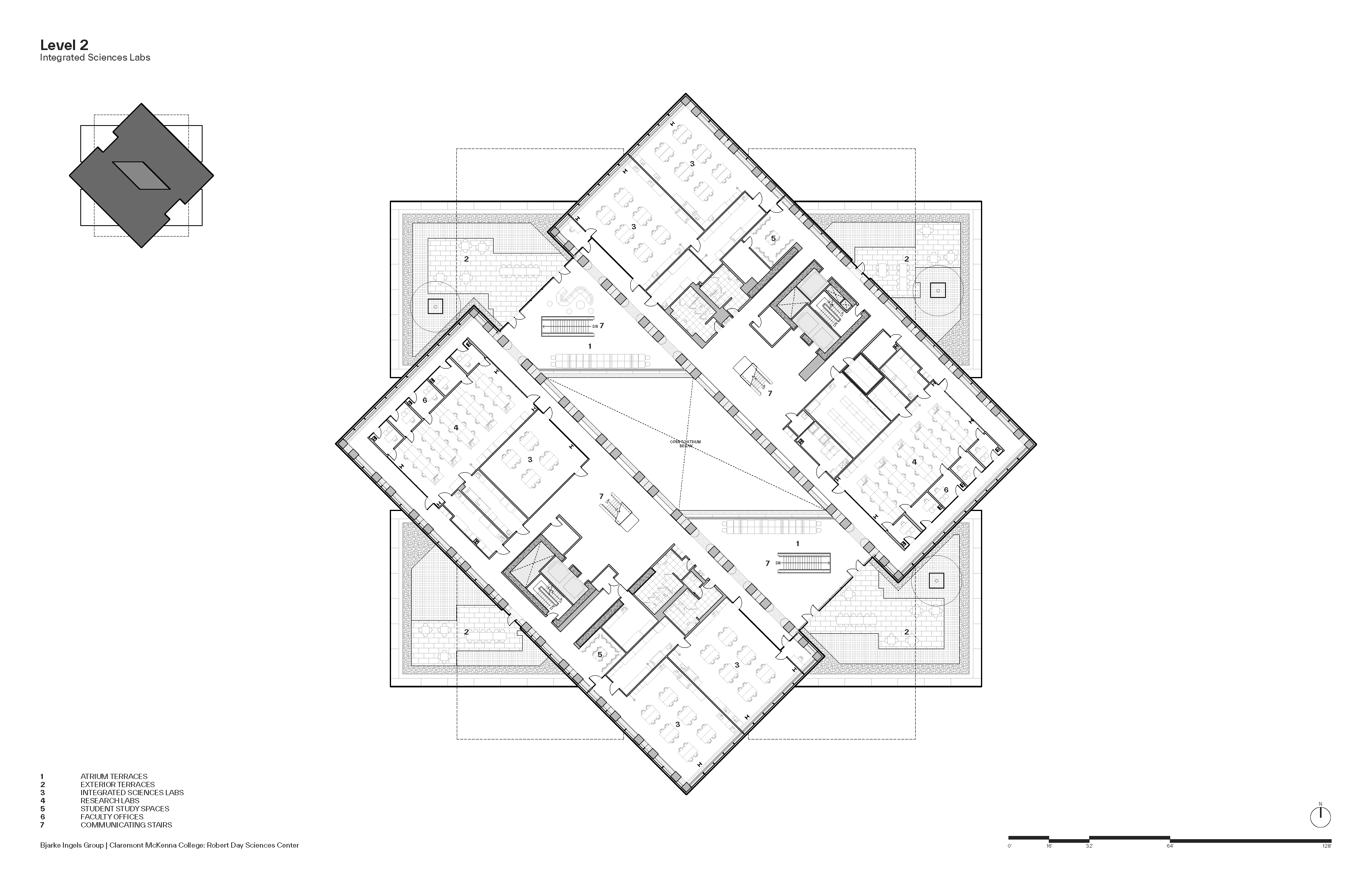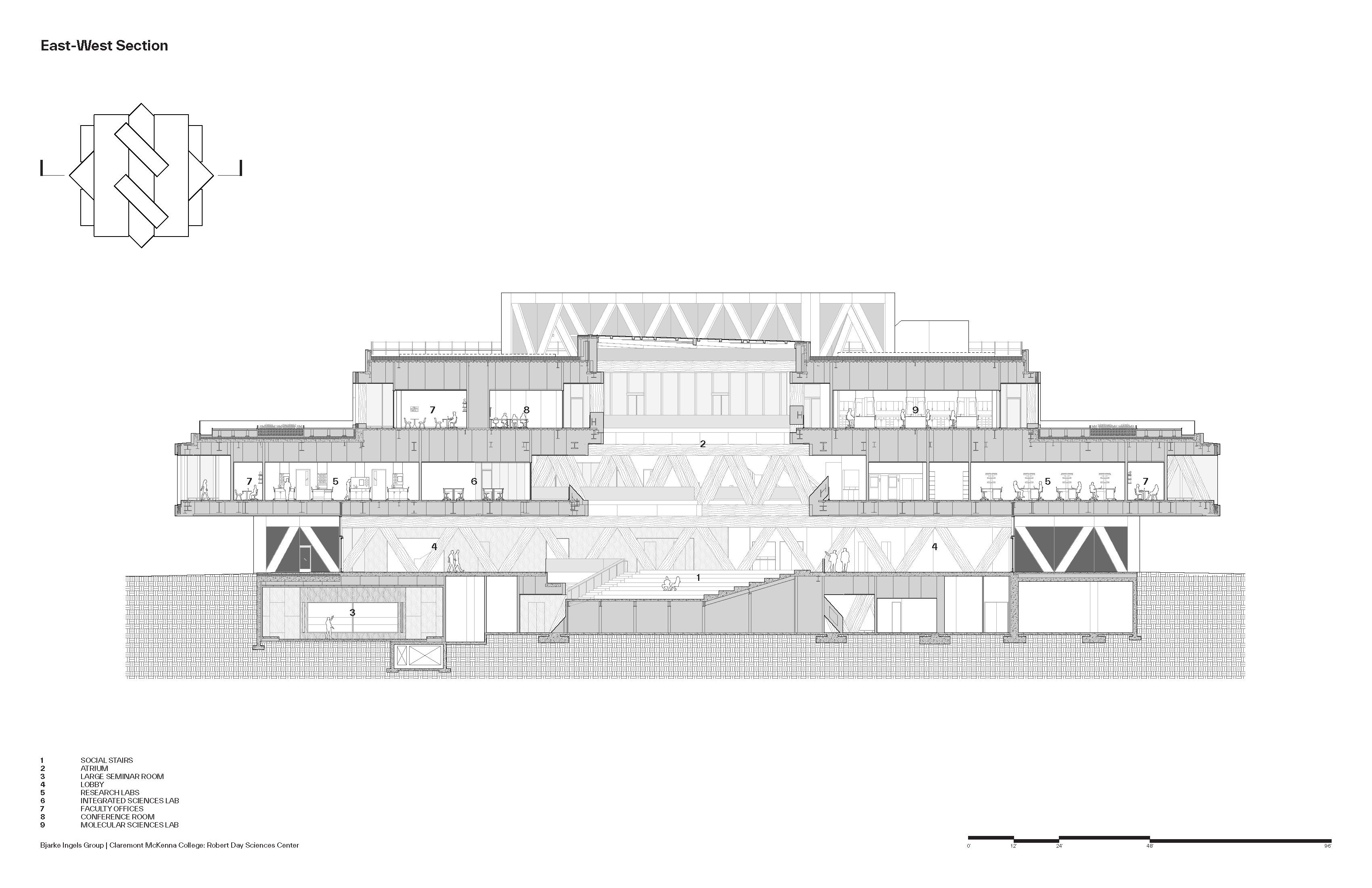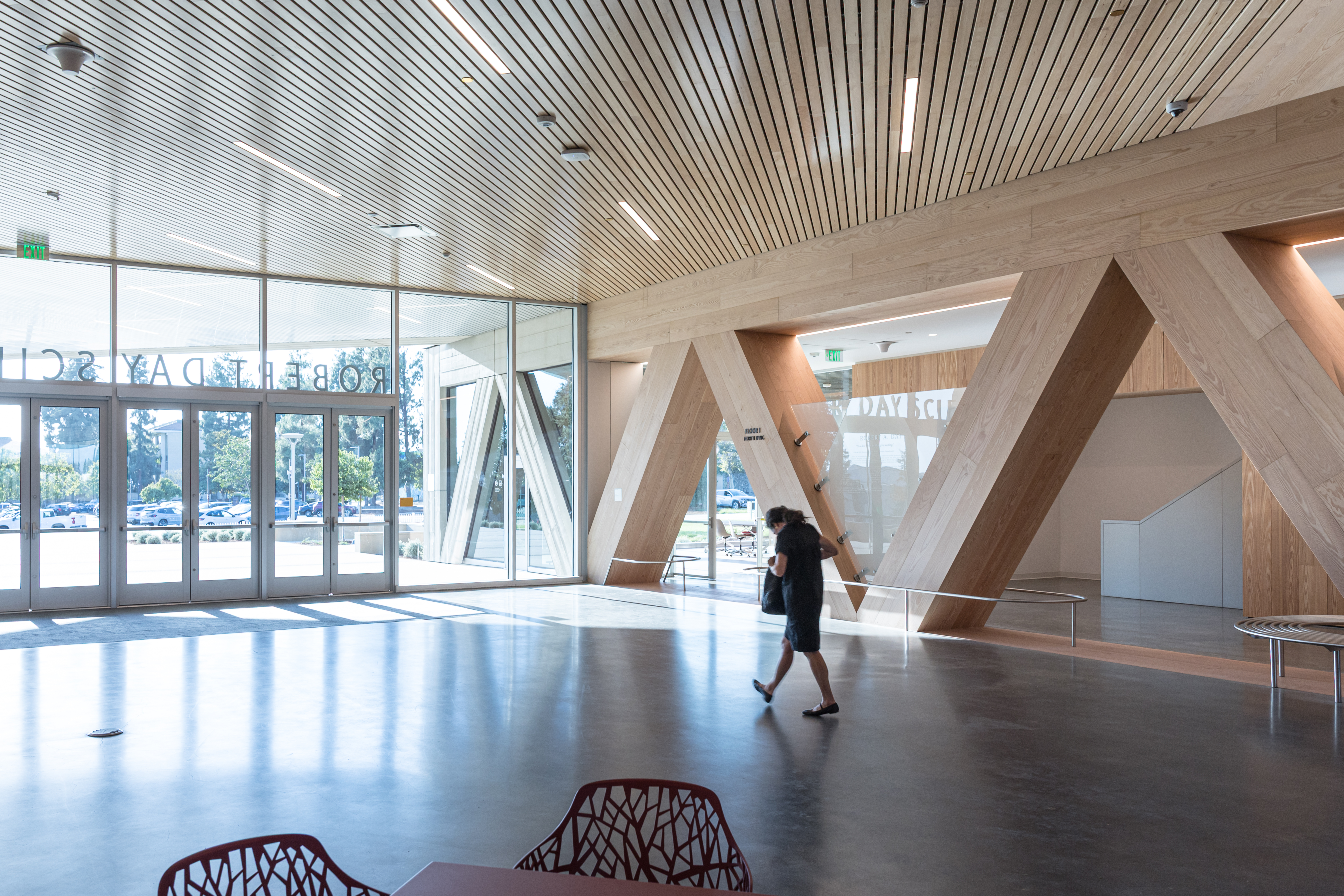 건물은 캠퍼스 동쪽 경계부, 나인스 스트리트와 클레어몬트 블루버드가 만나는 지점에 배치되어 동쪽 진입 관문 역할을 한다. 원형 지붕 아래 4.5m 높이로 떠 있는 대형 캐노피가 방문자를 맞이하며, 그 뒤로 천창으로 채광되는 다층 아트리움이 등장한다. 이 아트리움은 건물의 회전된 매스가 만들어낸 빈 공간으로, 모든 층에서 연구·교육 공간을 바로 들여다볼 수 있는 시각적 투명성을 확보한다.