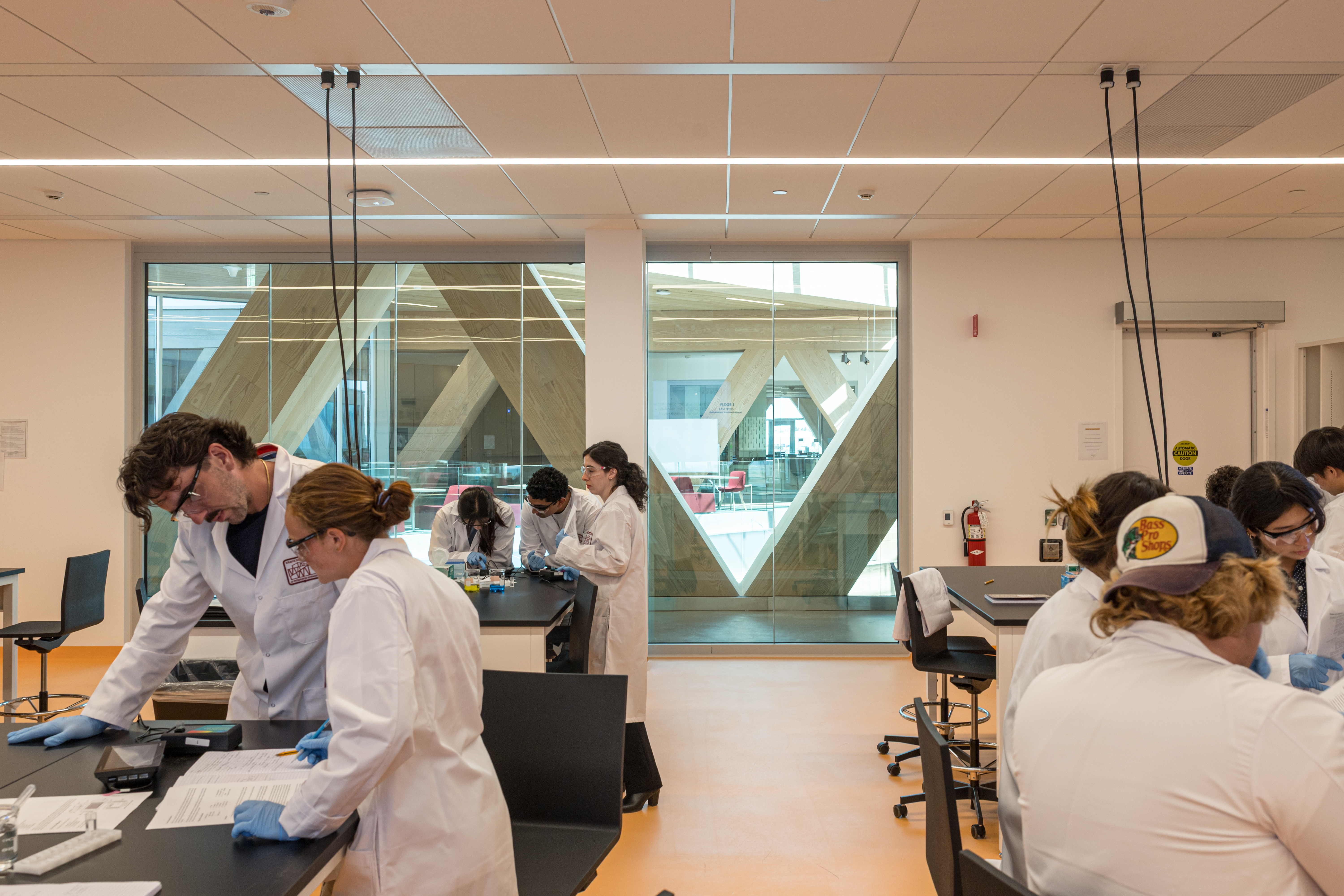 외피는 유리섬유강화콘크리트(GFRC) 보드폼 패널을 적용해 목재와 유사한 질감을 구현하면서도 실험·실습 공간에 필요한 내구성과 내화성을 충족시켰다. 지붕에는 약 1,000㎡ 규모의 태양광 패널이 설치되어 연간 약 342MWh의 에너지를 생산한다. 실내에서는 삼각 구조의 강철 트러스를 더글라스 퍼로 감싸 구조적 리듬감을 강조했고, 이 구조가 내부에서 외부로 자연스럽게 이어지도록 설계했다.