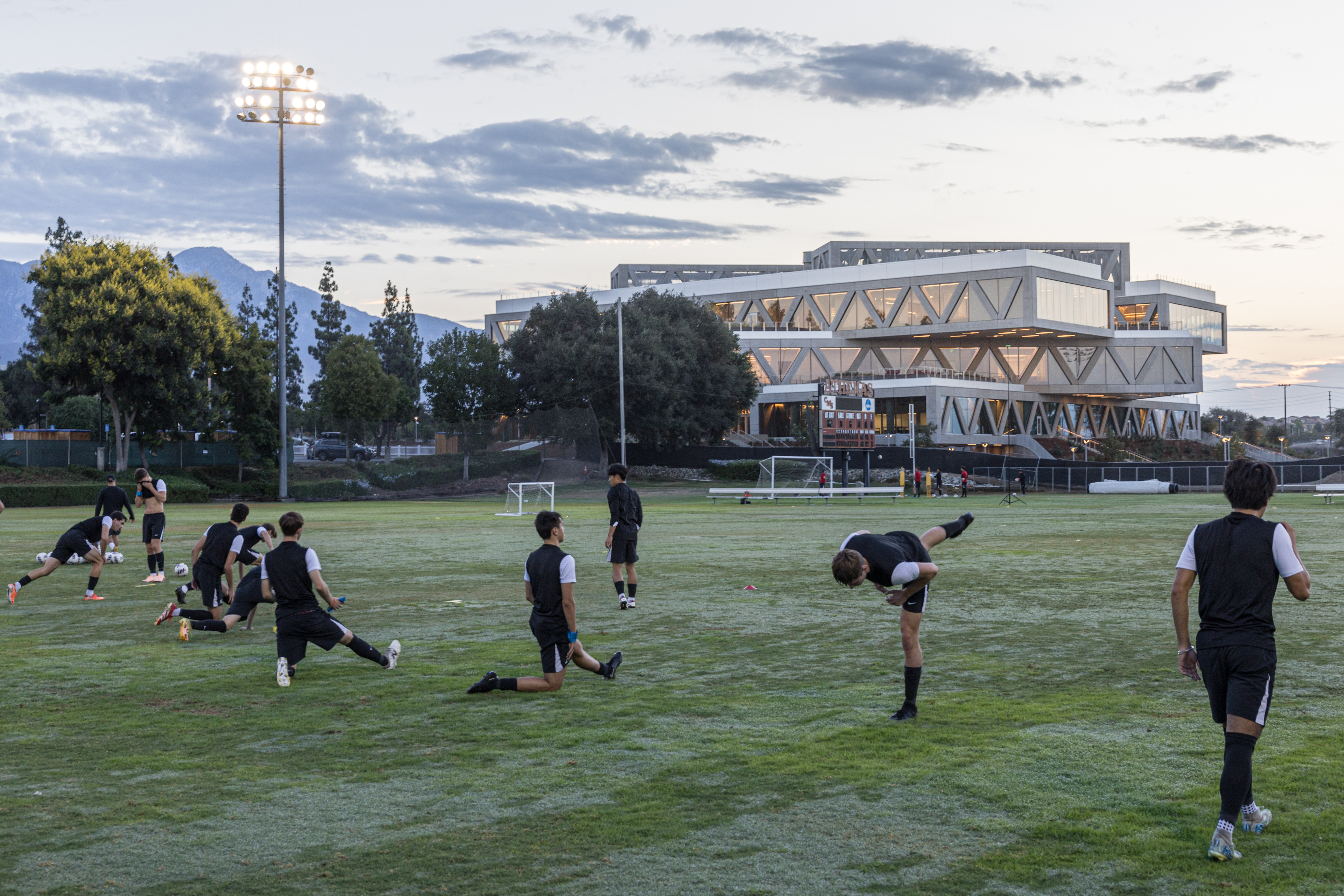 여덟 개의 야외 루프탑 테라스는 각 코너에 배치된 ‘바(bar)’ 매스 위에 형성되어, 북쪽의 샌 가브리엘 산맥과 서쪽 캠퍼스, 동쪽 스포츠 볼을 360도로 조망할 수 있다. 이 공간들은 야외 교실·스터디 존·만남의 장소 등 다목적으로 활용될 수 있도록 꾸며졌다. 건물은 현재 LEED Gold 인증을 목표로 하고 있으며, 밤이 되면 빛으로 은은히 드러나는 매스와 아트리움 구조가 캠퍼스 동측의 ‘과학적 아이디어의 등대’처럼 기능한다.